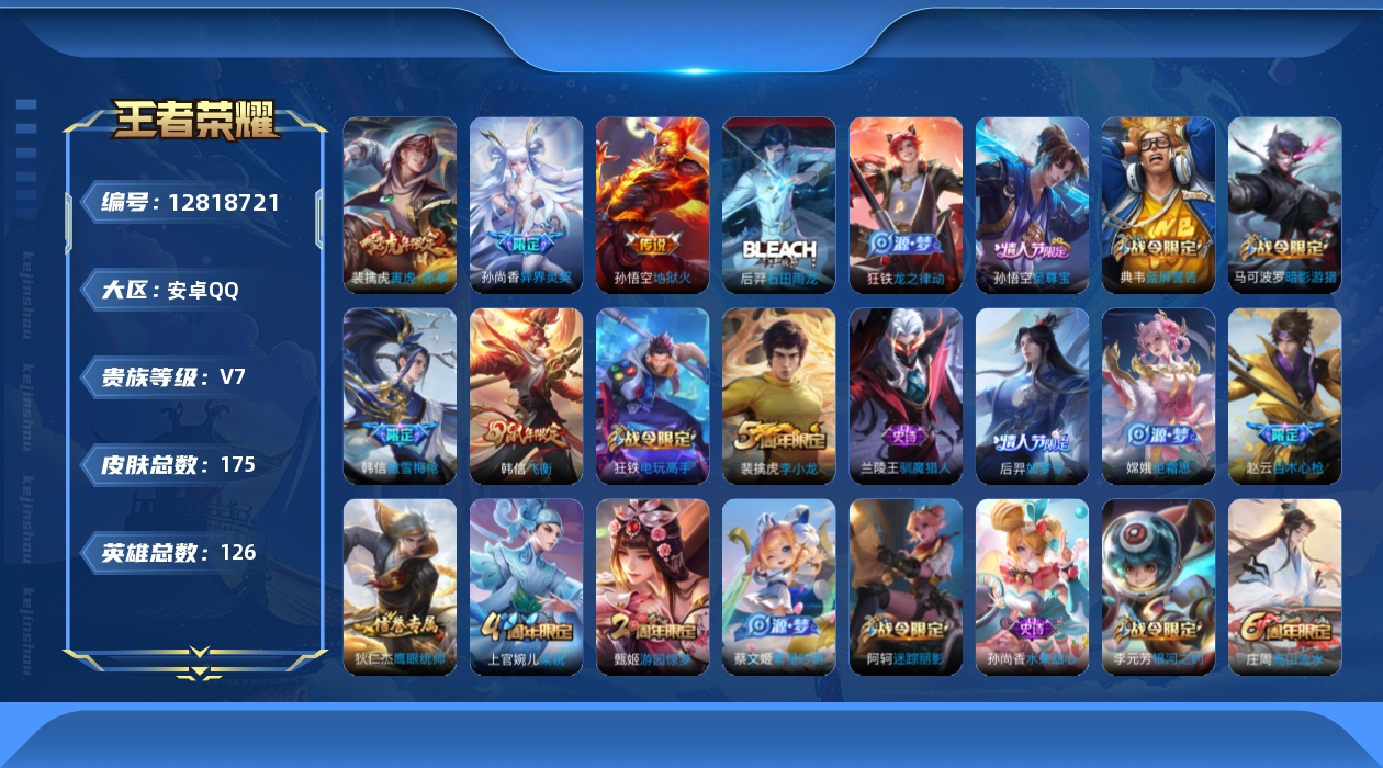 - [12721541]安卓Q-V1-最强王者段位-122英雄-110皮肤-1典藏-0珍品无双-0无双-0珍品传说-1传说-15史诗 【荣耀典藏】:虞姬神鉴启示录 【传说皮肤】:桑启鸣野蒿 【限定皮肤】:姜子牙天穹之誓,狄仁杰阴阳师,庄周高山流水,夏侯惇朔风刀,狄仁杰万华元夜,牛魔御旌,弈星混沌棋,明世隐疑决卦,狂铁御狮,米莱狄御霄,盾山御銮,上官婉儿梁祝,鲁班大师探海日志,张良古海寻踪 【赛季限定】:夏侯惇朔风刀,狄仁杰万华元夜,张良古海寻踪,牛魔御旌,弈星混沌棋,明世隐疑决卦,狂铁御狮,米莱狄御霄,盾山御銮,鲁班大师探海日志,姜子牙天穹之誓 【史诗皮肤】:甄姬冰雪圆舞曲,王昭君偶像歌手,宫本武藏鬼剑武藏,孙尚香水果甜心,嬴政摇滚巨星,妲己魅力维加斯,吕布圣诞狂欢,吕布末日机甲,张飞乱世虎臣,刘邦德古拉伯爵,雅典娜冰冠公主,上官婉儿梁祝,庄周高山流水,狂铁龙之律动,百里守约雪豹霜爪 【其他皮肤】:韩信教廷特使,韩信街头霸王,阿轲爱心护理,达摩大发明家,赵云忍炎影,程咬金星际陆战队,白起白色死神,牛魔西部大镖客,扁鹊化身博士,孙膑天使之翼,妲己少女阿狸,典韦黄金武士,亚瑟死亡骑士,达摩拳王,花木兰兔女郎,张飞五福同心,甄姬花好人间,宫本武藏万象初新,狄仁杰阴阳师,刘备纽约教父,刘备汉昭烈帝,关羽龙腾万里,钟无艳海滩丽影,宫本武藏霸王丸,老夫子功夫老勺,孙尚香沉稳之力,诸葛亮掌控之力,李白敏锐之力,鬼谷子幻乐之宴,狂铁御狮,安琪拉如懿,苏烈坚韧之力,米莱狄御霄,明世隐虹云星官,牛魔御旌,小乔丁香结,吕布野性能量,盾山御銮,沈梦溪鲨炮海盗猫,夏侯惇朔风刀,弈星混沌棋,鲁班七号黑桃队长,明世隐疑决卦,盾山圆桌骑士,狄仁杰万华元夜,刘禅秘密基地,米莱狄契约魔法,海月幻泉雾影,猪八戒潮玩探月行,鲁班大师探海日志,张良古海寻踪,亚连破局者,姜子牙天穹之誓,苍苍林狼骑,典韦铁骨偃魂,姜子牙星梦巡礼,戈娅玫蓝誓约,刘备浪漫序章,钟馗虚灵犬护,苏烈春野闲踪,张良灵野札记,阿古朵布丁狗之约,白起死霸装,甄姬逆浪荇歌,云中君云械蓝图,高渐离落日弦歌,莱西奥踏浪烽翎,貂蝉异域舞娘,张良一千零一夜,张良天堂福音,小乔万圣前夜,孙悟空西部大镖客,周瑜海军大将,后羿精灵王,兰陵王隐刃,李元芳特种部队,虞姬加勒比小姐,蔡文姬蔷薇王座,杨戬埃及法老,诸葛亮星航指挥官,干将莫邪第七人偶,铠龙域领主,百里守约绝影神枪,梦奇美