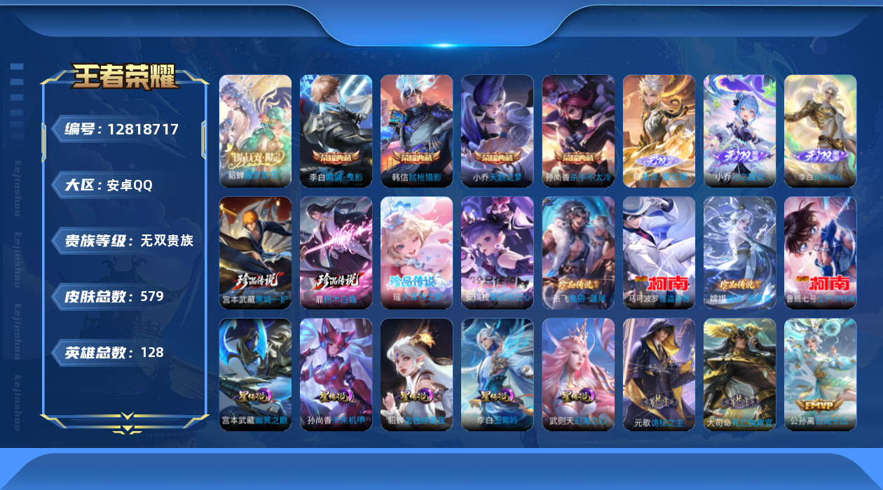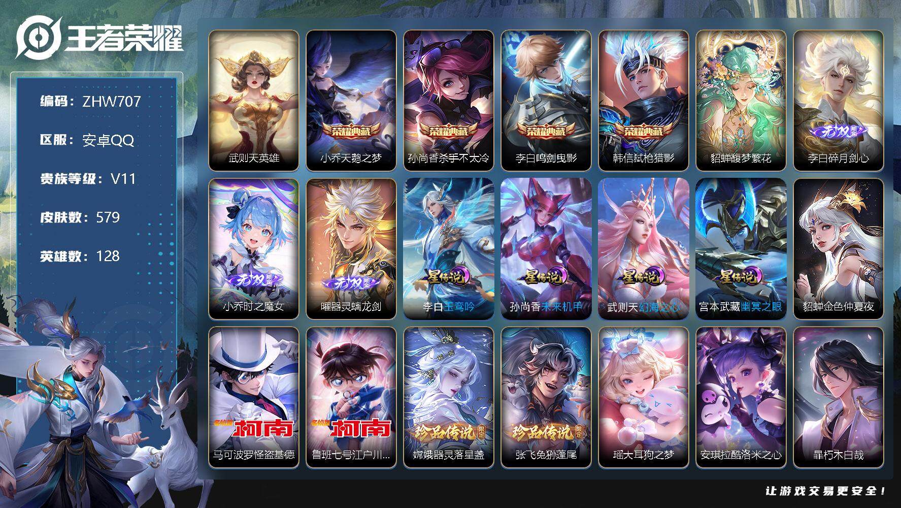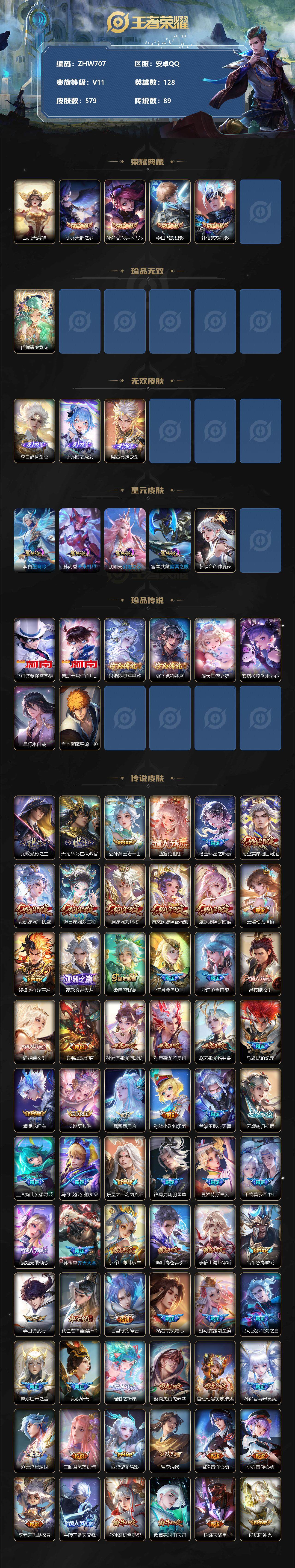 [12818717]q社交限制(包人脸)【特价急出/详情看图】安卓Q-V11-最强王者段位-128英雄-579皮肤-4典藏-1珍品无双-3无双-8珍品传说-89传说-200史诗