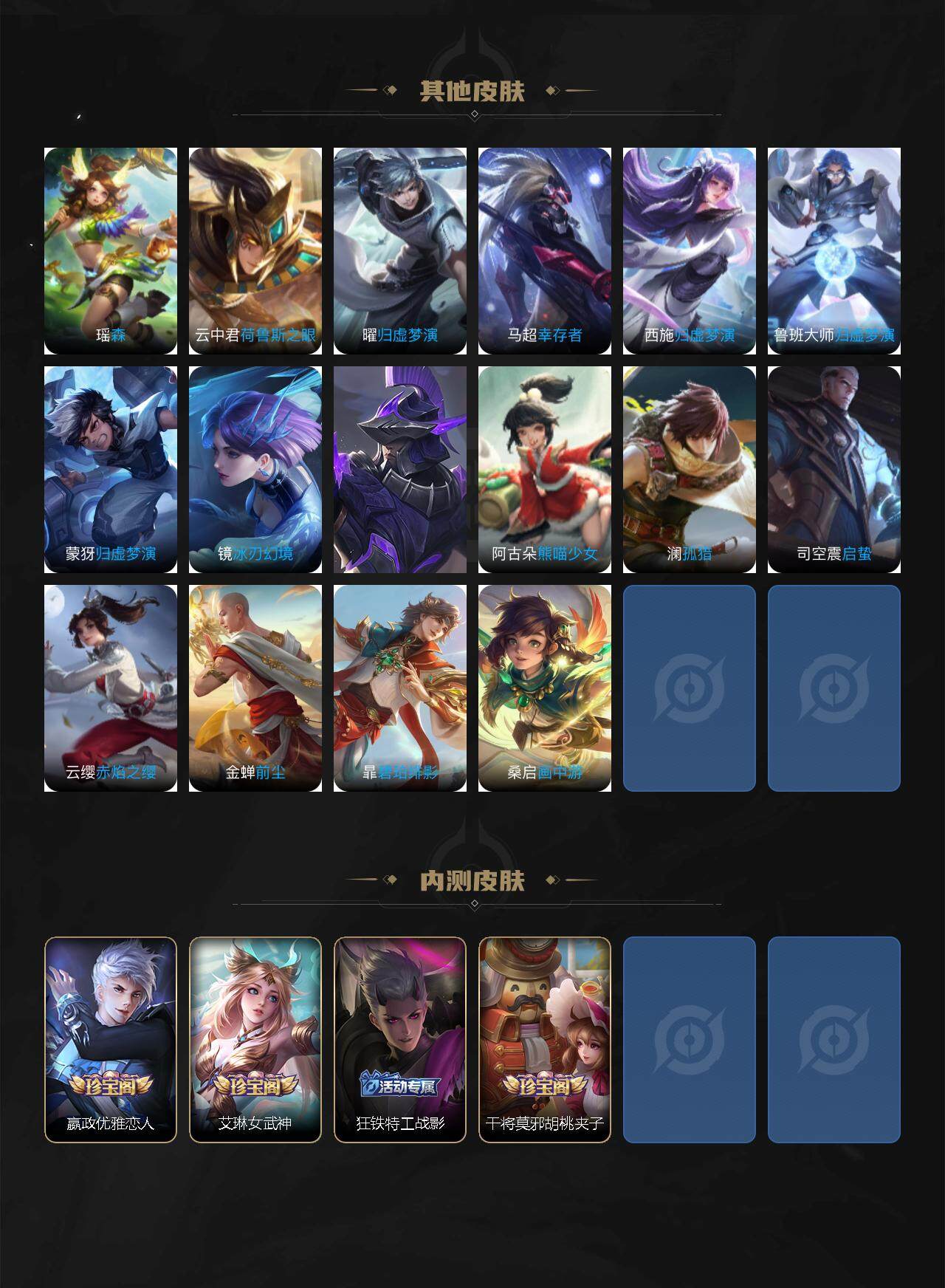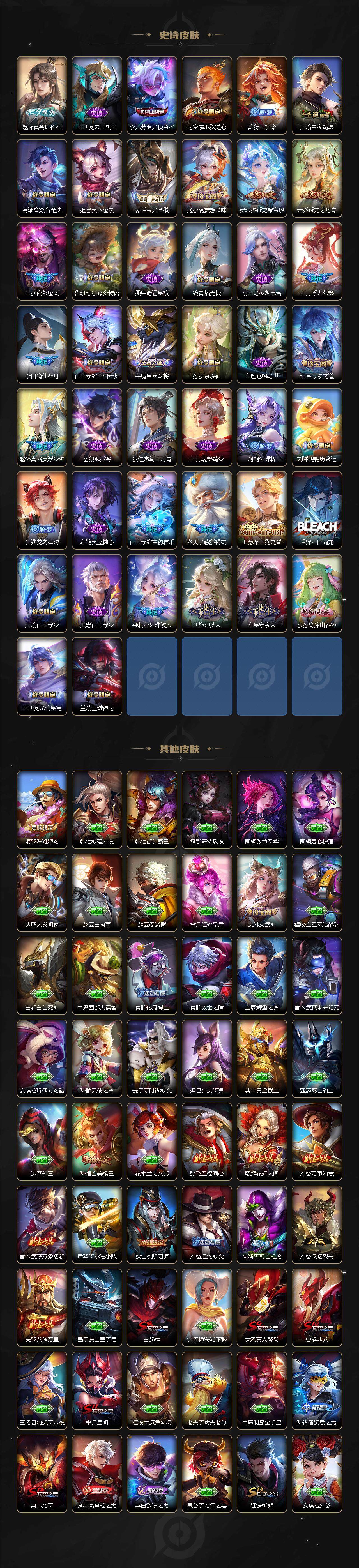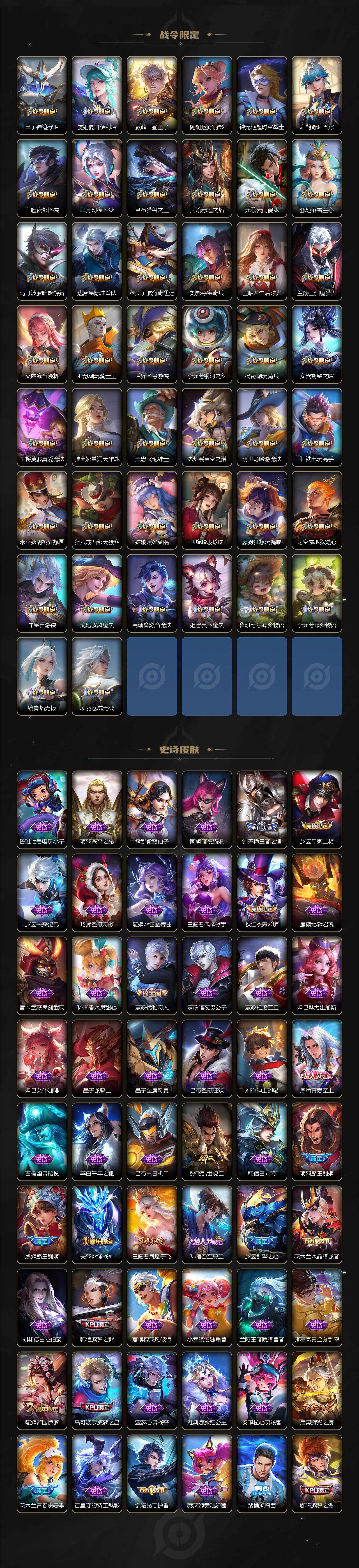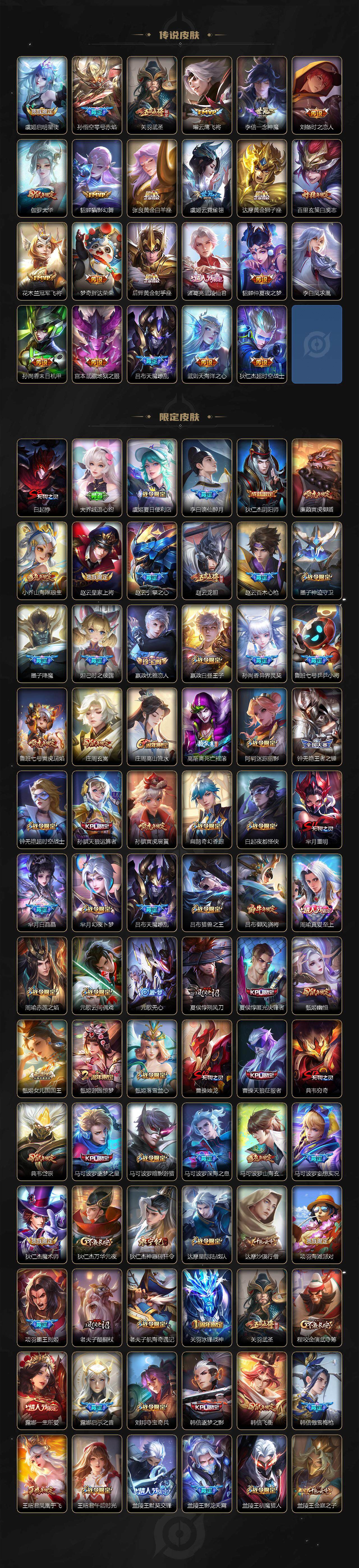 【英雄全皮】:嬴政全皮,刘禅全皮,阿轲全皮,元歌全皮,李白全皮,达摩全皮,露娜全皮,刘邦全皮,孙权全皮,娜可露露全皮,橘右京全皮,女娲全皮,雅典娜全皮,太乙真人全皮,东皇太一全皮,鬼谷子全皮,明世隐全皮,狂铁全皮,李信全皮,猪八戒全皮,曜全皮,蒙恬全皮,桑启全皮,夏洛特全皮,司空震全皮,赵怀真全皮,莱西奥全皮,戈娅全皮,空空儿全皮,影全皮