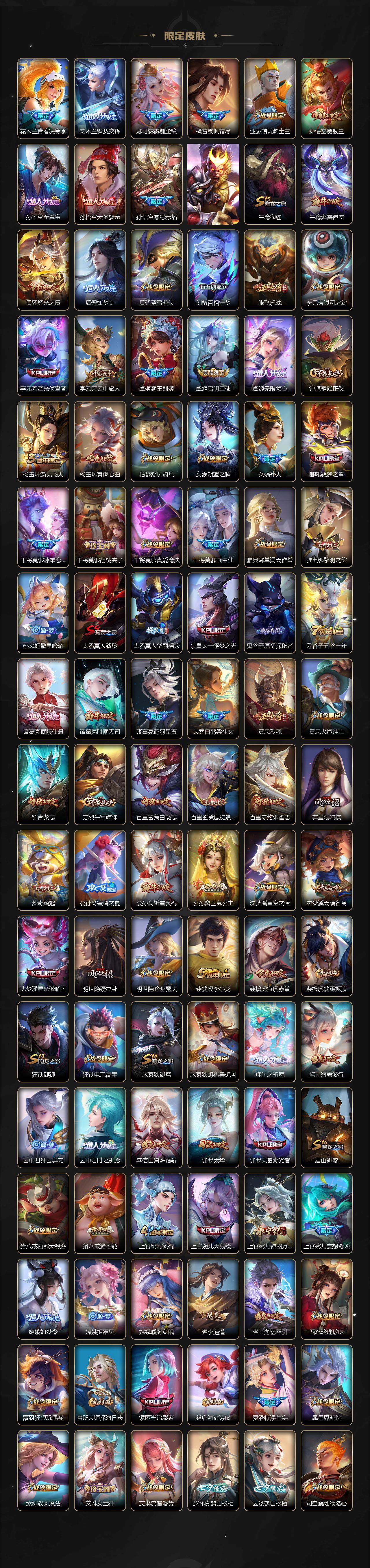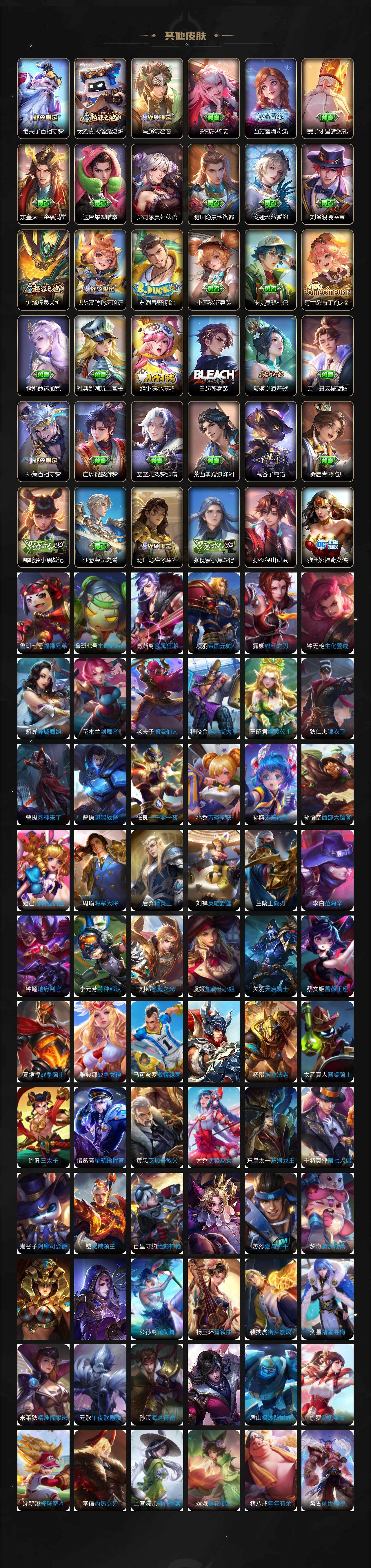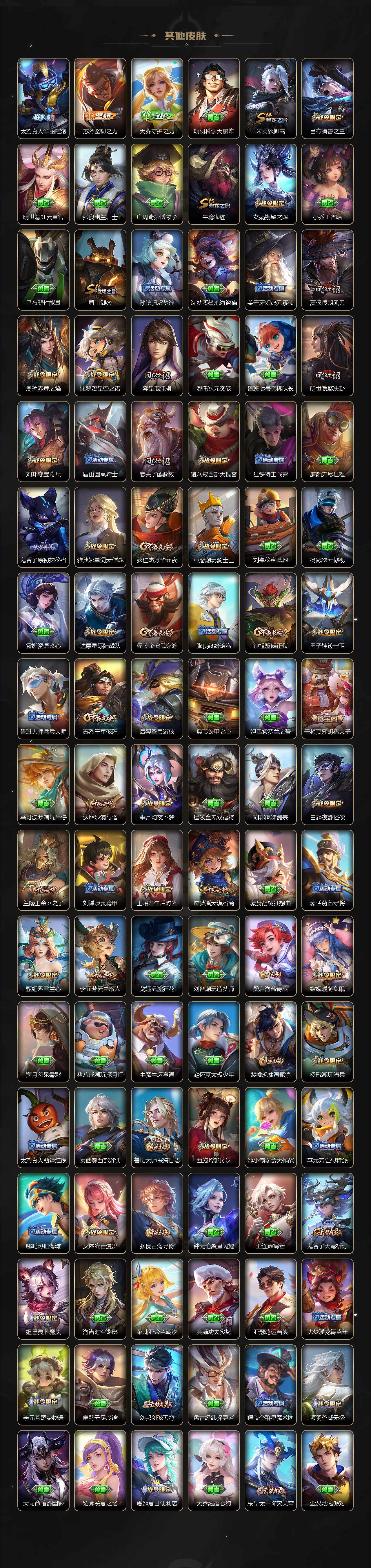 小乔青蛇,大乔白蛇,瑶遇见神鹿,娜可露露晚萤,伽罗箭羽风息,李元芳逐浪之夏,不知火舞魅语,公孙离无限星赏官,大乔猫狗日记,孙策猫狗日记,阿轲节奏热浪,露娜紫霞仙子,诸葛亮黄金分割率,王昭君偶像歌手,韩信白龙吟,项羽苍穹之光,孙尚香时之恋人,阿轲暗夜猫娘,雅典娜冰冠公主,吕布末日机甲,鲁班七号电玩小子,蒙犽龙鼓争鸣,橘右京修罗,墨子龙骑士,嬴政摇滚巨星,刘禅绅士熊喵,刘禅天才门将,白起星夜王子,安琪拉心灵骇客,程咬金功夫厨神,刘邦德古拉伯爵,兰陵王暗隐猎兽者,曹操幽灵船长,宫本武藏鬼剑武藏,司马懿暗渊魔法,亚瑟心灵战警,钟馗乐园奇幻夜,杨戬天秀·启明,蔡文姬舞动绿茵,廉颇地狱岩魂,西施诗语江南,小乔缤纷独角兽,夏侯惇乘风破浪,花木兰水晶猎龙者,铠曙光守护者,百里玄策热力回旋,墨子金属风暴,百里玄策原初追逐者,吕布圣诞狂欢,貂蝉圣诞恋歌,百里守约特工魅影,嬴政暗夜贵公子,嫦娥拒霜思,雅典娜黎明之约,李白千年之狐,夏洛特永昼,澜赏金猎手,高渐离天秀·音浪,弈星滕王阁序,刘备百相守梦,沈梦溪匿光破解者,刘禅电玩·爆裂旋风,赵怀真鹤归松栖,莱西奥末日机甲,李元芳匿光侦查者,蒙犽百解令,周瑜雪夜绮愿,高渐离燃音魔法,大乔乘龙·忆丹青,安琪拉乘龙·聚宝船,曹操夜都魔契,桑启奇遇星旅,明世隐夜落电台,李白谪仙醉月,白起苍鳞隐世,赵怀真器灵·浮梦炉,苍狼魂孤将,狄仁杰绮世丹青