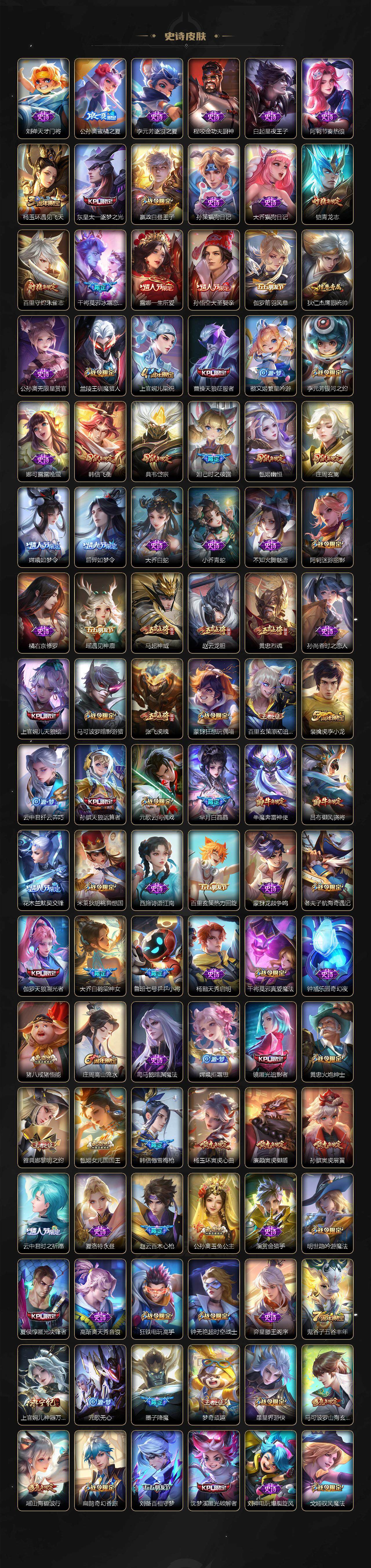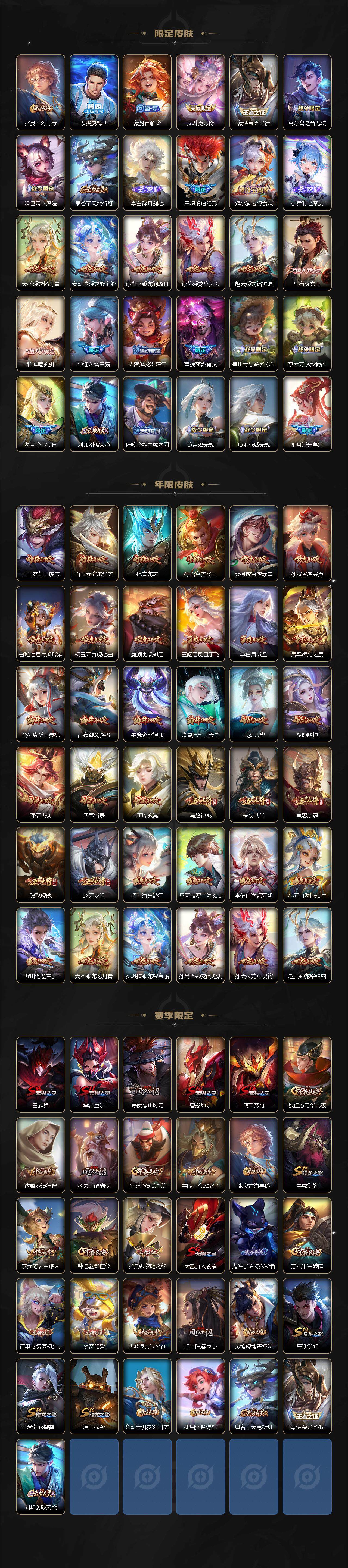 关羽冰锋战神,裴擒虎李小龙,上官婉儿梁祝,牛魔奔雷神使,公孙离祈雪灵祝,吕布御风骁将,诸葛亮时雨天司,赵云龙胆,关羽武圣,黄忠烈魂,张飞虎魄,马超神威,后羿辉光之辰,庄周玄嵩,典韦岱宗,甄姬幽恒,韩信飞衡,伽罗太华,曹操天狼征服者,孙膑天狼运算者,上官婉儿天狼绘梦者,伽罗天狼溯光者,哪吒逐梦之翼,马可波罗逐梦之星,韩信逐梦之影,东皇太一逐梦之光,铠青龙志,百里玄策白虎志,百里守约朱雀志,王昭君凤凰于飞,项羽霸王别姬,虞姬霸王别姬,周瑜真爱至上,孙悟空大圣娶亲,露娜一生所爱,花木兰默契交锋,兰陵王默契交锋,后羿如梦令,嫦娥如梦令,孙悟空至尊宝,裴擒虎梅西,雅典娜神奇女侠,干将莫邪冰霜恋舞曲,花木兰青春决赛季,妲己时之彼端,公孙离蜜橘之夏,芈月白晶晶,赵云引擎之心,孙悟空美猴王,鲁班七号乒乒小将,大乔白鹤梁神女,猪八戒猪悟能,廉颇寅虎·御盾,孙尚香异界灵契,甄姬女儿国国王,镜匿光追影者,韩信傲雪梅枪,鲁班七号寅虎·瑞焰,孙膑寅虎·展翼,杨玉环寅虎·心曲,裴擒虎寅虎·赤拳,云中君时之祈愿,瑶时之祈愿,女娲补天,赵云百木心枪,公孙离玉兔公主,露娜启示之音,夏侯惇匿光决锋者,马可波罗深海之息,娜可露露前尘镜,橘右京枫霜尽,上官婉儿神器·万象笔,墨子降魔,李白诗剑行,马可波罗山海·玄木吟,瑶山海·碧波行,兰陵王影龙天霄,桑启鸣野蒿,澜愿照·九州拓,蔡文姬愿照·福禄聚,虞姬愿照·岁时盈,司空震愿照·山河定,妲己愿照·众生和,女娲愿照·千秋盛