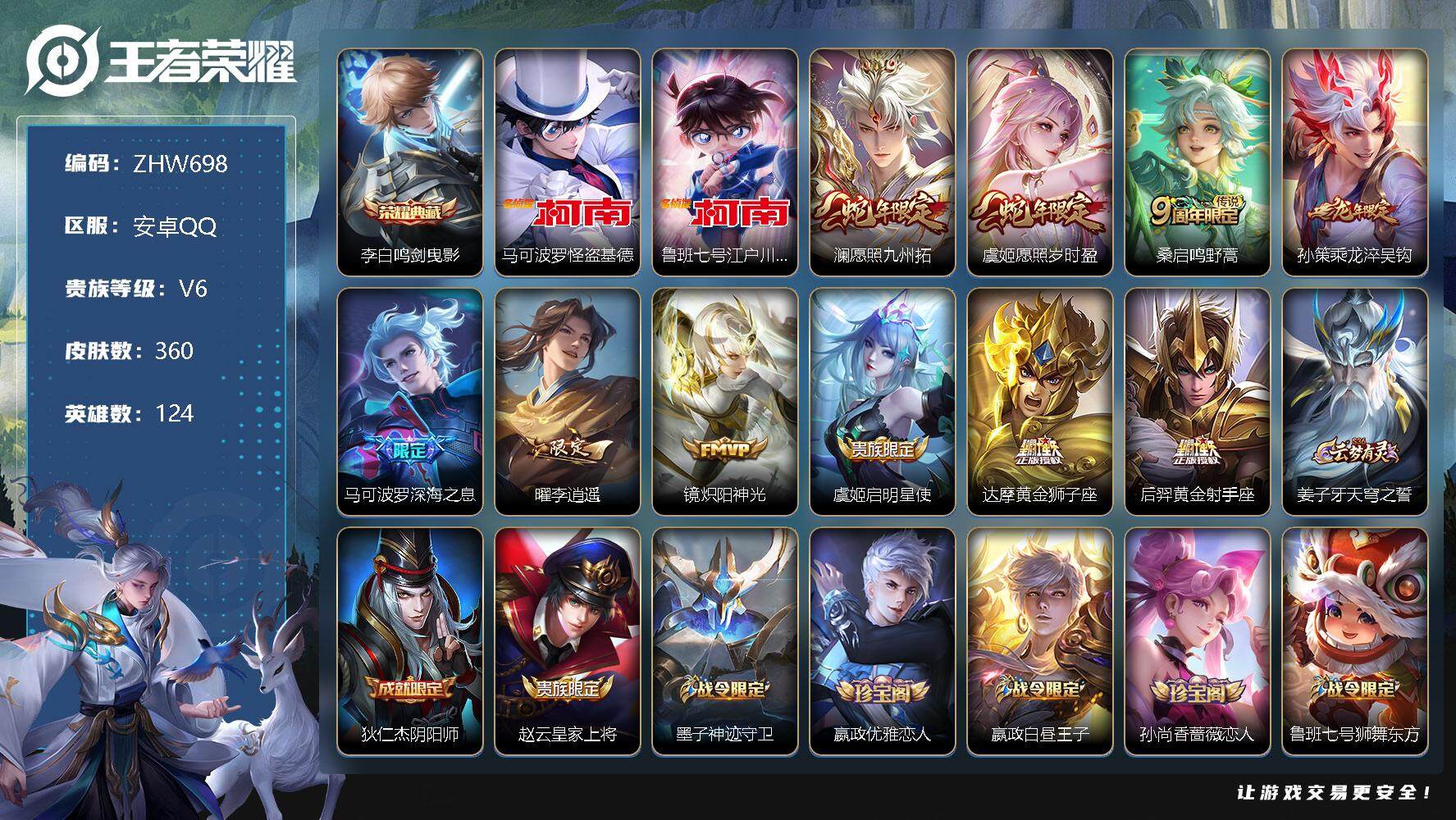 [12819012]【特价急出/详情看图】安卓Q-V6-永恒钻石V段位-124英雄-360皮肤-1典藏-2珍品传说-10传说-105史诗 【英雄全皮】:阿轲全皮,达摩全皮,狂铁全皮,蒙恬全皮,影全皮 【荣耀典藏】:李白鸣剑曳影 【珍品传说】:马可波罗怪盗基德,鲁班七号江户川柯南 【传说皮肤】:澜愿照九州拓,虞姬愿照岁时盈,桑启鸣野蒿,孙策乘龙淬吴钩,马可波罗深海之息,曜李逍遥 ,镜炽阳神光,虞姬启明星使,达摩黄金狮子座,后羿黄金射手座 【限定皮肤】:姜子牙天穹之誓,狄仁杰阴阳师,赵云皇家上将,墨子神迹守卫,嬴政优雅恋人,嬴政白昼王子,孙尚香蔷薇恋人,鲁班七号狮舞东方,庄周高山流水,高渐离死亡摇滚,高渐离玩趣恶龙,阿轲迷踪丽影,钟无艳超时空战士,扁鹊奇幻香踪,白起夜都怪侠,芈月重明,芈月幻夜卜梦,吕布猎兽之王,吕布御风骁将,周瑜赤莲之焰,元歌云间偶戏,元歌无心,夏侯惇朔风刀,夏侯惇匿光决锋者,甄姬游园惊梦,甄姬落雪兰心,典韦穷奇,典韦蓝屏警告,马可波罗暗影游猎,马可波罗深海之息,马可波罗山海玄木吟,狄仁杰魔术师,狄仁杰万华元夜,达摩星际陆战队,达摩沙漠行僧,项羽海滩派对,老夫子醍醐杖,老夫子航海奇遇记,程咬金演武夺筹,刘邦夺宝奇兵,韩信飞衡,王昭君午后时光,兰陵王驯魔猎人,兰陵王金庭之子,亚瑟潮玩骑士王,孙悟空至尊宝,孙悟空大圣娶亲,牛魔御旌,后羿圣弓游侠,李元芳银河之约,李元芳云中旅人,虞姬启明星使,钟馗神迹守卫,钟馗驱傩正仪,杨玉环遇见飞天,杨戬潮玩骑兵,女娲朔望之晖,干将莫邪冰霜恋舞曲,干将莫邪真爱魔法,雅典娜单词大作战,雅典娜黎明之约,蔡文姬繁星吟游,太乙真人华丽摇滚,鬼谷子原初探秘者,鬼谷子五谷丰年,黄忠火炮绅士,苏烈千军破阵,百里玄策原初追逐者,弈星混沌棋,梦奇顽趣,沈梦溪星空之诺,沈梦溪大漠名商,明世隐疑决卦,明世隐吟游魔法,裴擒虎天狼狩猎者,裴擒虎李小龙,裴擒虎擒涛扼浪,狂铁御狮,狂铁电玩高手,米莱狄御霄,米莱狄胡桃异想国,云中君纤云弄巧,盾山御銮,猪八戒西部大镖客,上官婉儿梁祝,嫦娥暖冬兔眠,曜李逍遥 ,蒙犽狂想玩偶喵,鲁班大师探海日志,桑启海盐诗旅,暃星界游侠,艾琳女武神,艾琳流音漫舞,司空震地狱燃心,阿古朵江河有灵,张良古海寻踪,蒙犽百解令,蒙恬荣光圣徽,鬼谷子天穹祈灯,孙策乘龙淬吴钩,沈梦溪龙舞盛年,鲁班七号蔬乡物语,李元芳蔬乡物语,刘邦剑破天穹,程咬金群星魔术