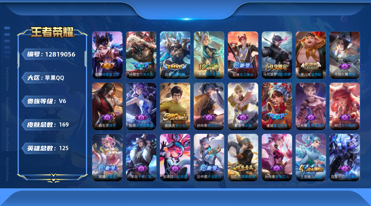 [12819056]【特价急出/详情看图】苹果Q-V6-最强王者段位-125英雄-169皮肤-3传说-42史诗