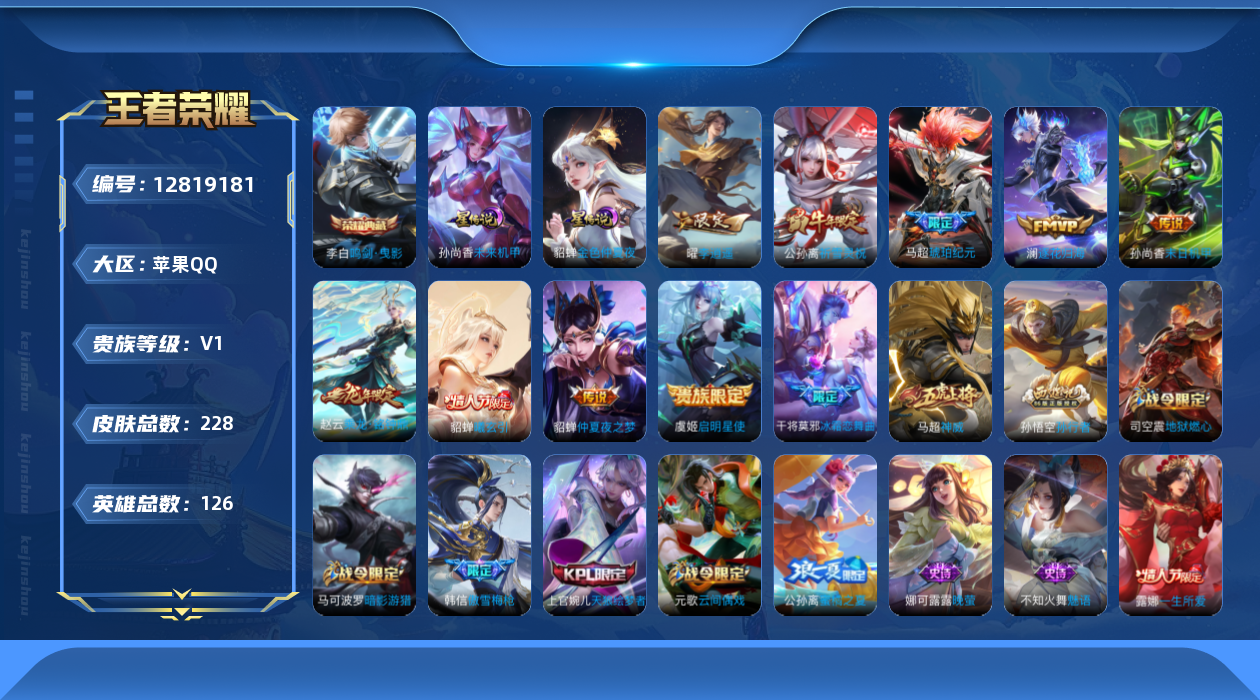- [12780467]苹果Q-V9-最强王者段位-125英雄-296皮肤-3典藏-0珍品无双-1无双-1珍品传说-29传说-98史诗 【荣耀典藏】:夏侯惇无限飓风号,小乔天鹅之梦,鲁班七号星空梦想 【无双皮肤】:小乔时之魔女 【珍品传说】:嫦娥器灵落星盏 【传说皮肤】:公孙离云诺千山,杨玉环星之鸣奏,司空震愿照山河定,女娲愿照千秋盛,妲己愿照众生和,澜愿照九州拓,蔡文姬愿照福禄聚,虞姬愿照岁时盈,云缨幻光神枪,诸葛亮鹤羽星尊,吕布怒海麟威,百里守约碎云,娜可露露前尘镜,鲁班七号寅虎瑞焰,貂蝉遇见胡旋,赵云淬星耀世,王昭君乞巧织情,小乔音你心动,公孙离祈雪灵祝,镜炽阳神光,虞姬启明星使,孙悟空零号赤焰,刘备时之恋人,貂蝉猫影幻舞,张良黄金白羊座,后羿黄金射手座,孙尚香末日机甲,宫本武藏地狱之眼,狄仁杰超时空战士 【限定皮肤】:狄仁杰阴阳师,赵云皇家上将,墨子神迹守卫,鲁班七号乒乒小将,鲁班七号寅虎瑞焰,高渐离死亡摇滚,钟无艳超时空战士,孙膑天狼运算者,扁鹊奇幻香踪,芈月幻夜卜梦,吕布御风骁将,元歌云间偶戏,元歌无心,夏侯惇朔风刀,甄姬落雪兰心,曹操烛龙,典韦穷奇,狄仁杰魔术师,狄仁杰万华元夜,达摩沙漠行僧,项羽海滩派对,老夫子醍醐杖,老夫子航海奇遇记,貂蝉遇见胡旋,程咬金演武夺筹,王昭君午后时光,兰陵王金庭之子,花木兰瑞麟志,娜可露露前尘镜,亚瑟潮玩骑士王,孙悟空大圣娶亲,孙悟空零号赤焰,孙悟空孙行者,牛魔御旌,后羿圣弓游侠,李元芳云中旅人,虞姬启明星使,钟馗驱傩正仪,杨戬潮玩骑兵,干将莫邪真爱魔法,雅典娜单词大作战,蔡文姬奇迹圣诞,太乙真人饕餮,鬼谷子原初探秘者,鬼谷子五谷丰年,诸葛亮鹤羽星尊,大乔白鹤梁神女,黄忠烈魂,黄忠火炮绅士,苏烈千军破阵,弈星混沌棋,梦奇顽趣,公孙离祈雪灵祝,沈梦溪大漠名商,明世隐疑决卦,裴擒虎李小龙,裴擒虎擒涛扼浪,狂铁御狮,狂铁电玩高手,米莱狄御霄,云中君纤云弄巧,上官婉儿梁祝,嫦娥拒霜思,蒙犽狂想玩偶喵,鲁班大师探海日志,桑启海盐诗旅,艾琳女武神,鬼谷子天穹祈灯,小乔时之魔女,项羽苍威无极 【年限皮肤】:花木兰瑞麟志,鲁班七号寅虎瑞焰,公孙离祈雪灵祝,吕布御风骁将,马超神威,黄忠烈魂 【赛季限定】:夏侯惇朔风刀,曹操烛龙,典韦穷奇,狄仁杰万华元夜,达摩沙漠行僧,老夫子醍醐杖,程咬金演武夺筹,兰陵王金庭之子,牛魔御旌,李元芳云中旅人,钟馗驱傩正仪,太乙真人