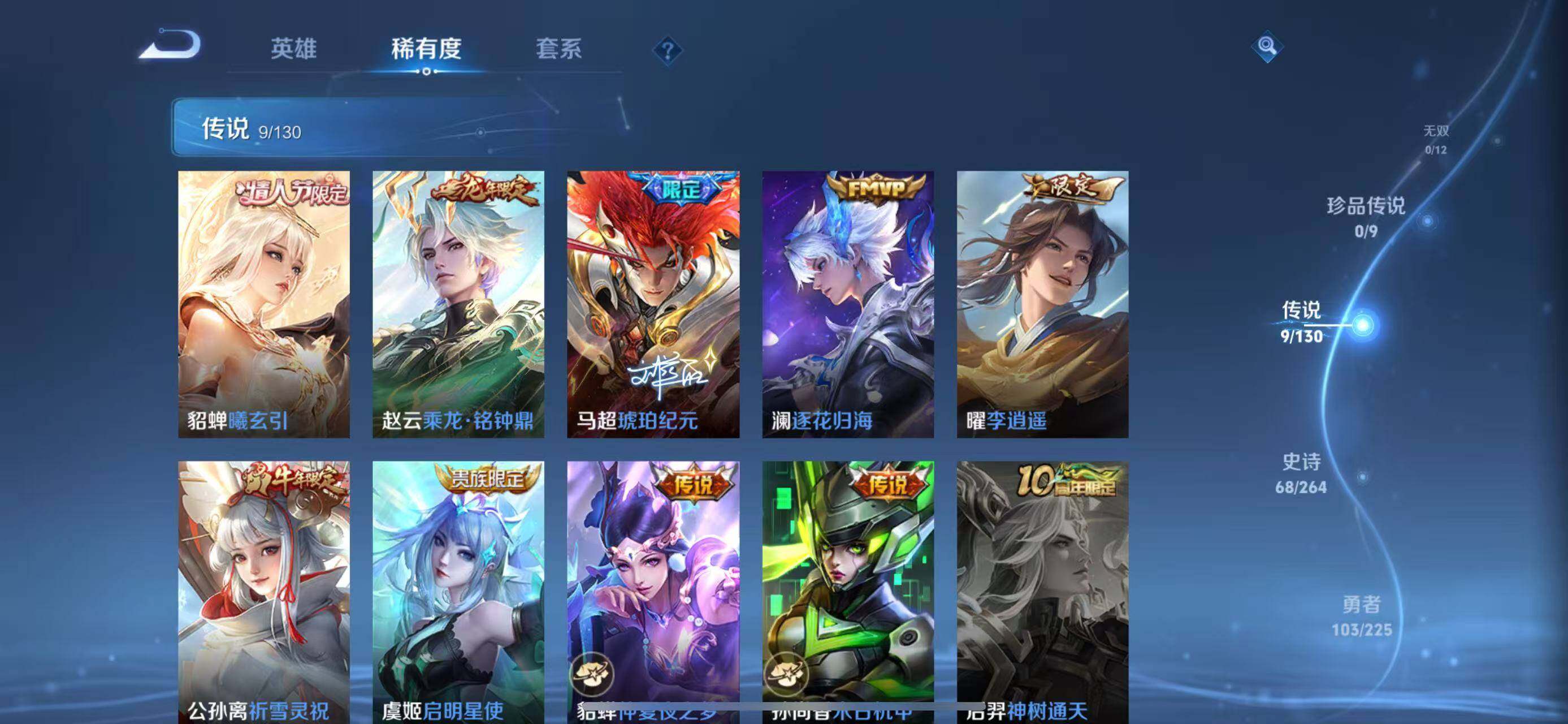 【传说皮肤】:貂蝉曦玄引,赵云乘龙铭钟鼎,马超琥珀纪元,澜逐花归海,曜李逍遥 ,公孙离祈雪灵祝,虞姬启明星使,貂蝉仲夏夜之梦,孙尚香末日机甲