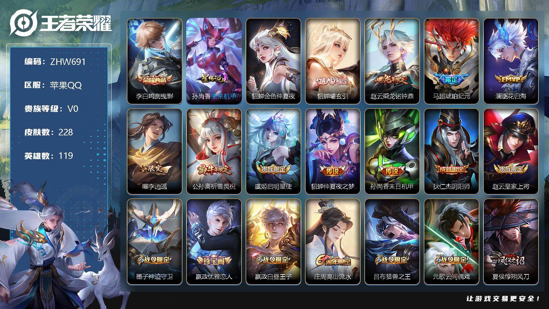 [12819181]苹果Q-V0-荣耀黄金II段位-119英雄-228皮肤-1典藏-2星传说-9传说-69史诗