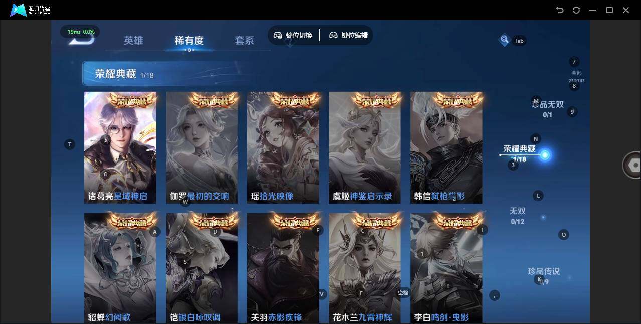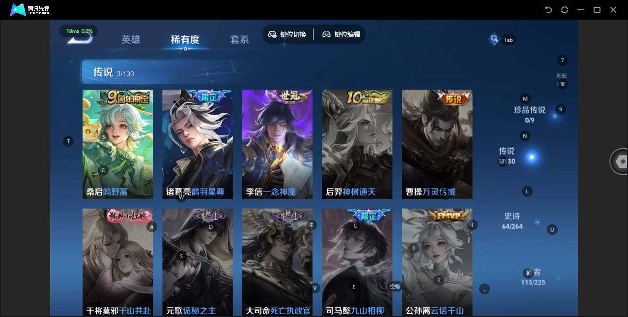 - PX_2097134-26 安卓QQ/无双王者/351皮肤/125英雄/2典藏/0珍品无双/0无双/2珍品传说/33传说/116史诗/9稀有英雄 【2 珍品传说】酷洛米之心 安琪拉,时之奇旅 孙策, 【2 典藏皮肤】九霄神辉 花木兰,星域神启 诸葛亮, 【33 传说皮肤】武圣 关羽,启明星使 虞姬,碎云 百里守约,逐花归海 澜,电玩·雷克斯 澜,云鹰飞将 曜,诗剑行 李白,燃星之曲 花木兰,浮生妄