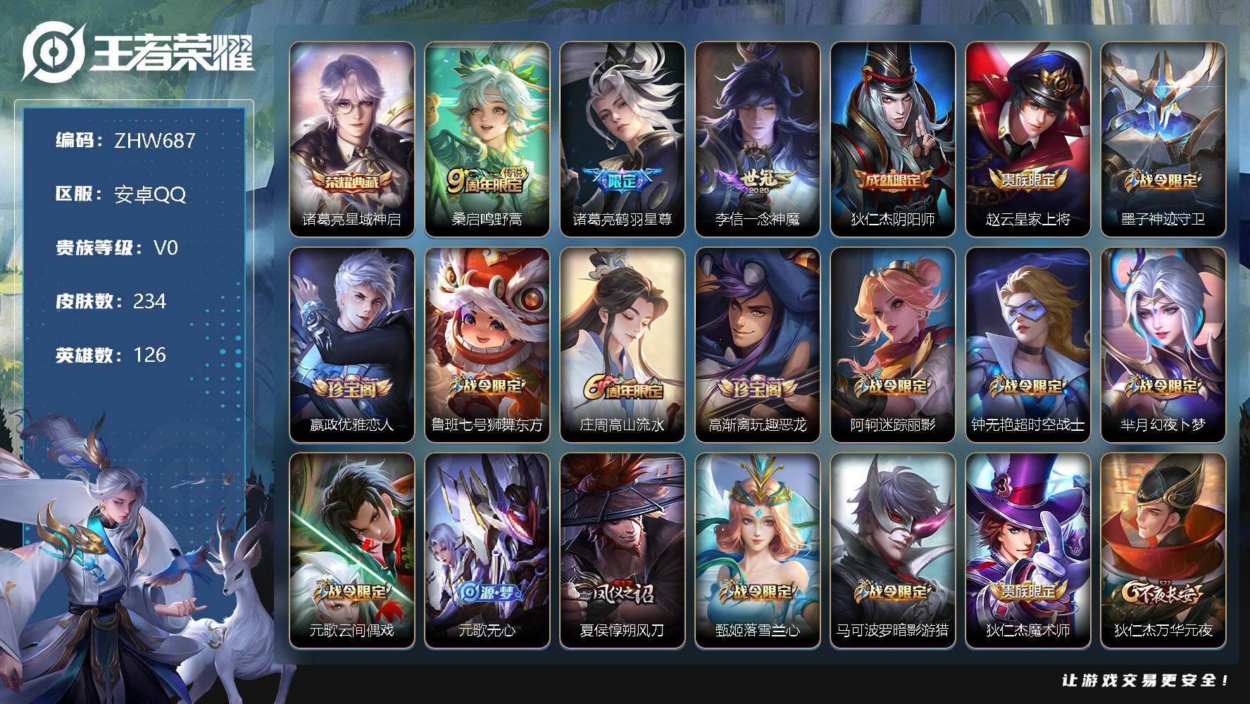 [12819156]【特价急出/详情看图】安卓Q-V0-至尊星耀III段位-126英雄-234皮肤-1典藏-3传说-64史诗 【英雄全皮】:蒙恬全皮 【荣耀典藏】:诸葛亮星域神启 【传说皮肤】:桑启鸣野蒿,诸葛亮鹤羽星尊,李信一念神魔 【限定皮肤】:狄仁杰阴阳师,赵云皇家上将,墨子神迹守卫,嬴政优雅恋人,鲁班七号狮舞东方,庄周高山流水,高渐离玩趣恶龙,阿轲迷踪丽影,钟无艳超时空战士,芈月幻夜卜梦,元歌云间偶戏,元歌无心,夏侯惇朔风刀,甄姬落雪兰心,马可波罗暗影游猎,狄仁杰魔术师,狄仁杰万华元夜,达摩星际陆战队,达摩沙漠行僧,项羽海滩派对,老夫子醍醐杖,老夫子航海奇遇记,关羽冰锋战神,程咬金演武夺筹,刘邦夺宝奇兵,兰陵王金庭之子,亚瑟潮玩骑士王,孙悟空至尊宝,牛魔御旌,李元芳银河之约,李元芳云中旅人,钟馗神迹守卫,钟馗驱傩正仪,杨玉环遇见飞天,干将莫邪冰霜恋舞曲,雅典娜单词大作战,雅典娜黎明之约,蔡文姬繁星吟游,鬼谷子原初探秘者,鬼谷子五谷丰年,诸葛亮鹤羽星尊,黄忠火炮绅士,苏烈千军破阵,百里玄策原初追逐者,弈星混沌棋,梦奇顽趣,沈梦溪星空之诺,沈梦溪大漠名商,明世隐疑决卦,裴擒虎李小龙,裴擒虎擒涛扼浪,狂铁御狮,米莱狄御霄,米莱狄胡桃异想国,云中君纤云弄巧,伽罗天狼溯光者,盾山御銮,猪八戒西部大镖客,上官婉儿梁祝,蒙犽狂想玩偶喵,鲁班大师探海日志,桑启海盐诗旅,阿古朵江河有灵,张良古海寻踪,蒙恬荣光圣徽,鬼谷子天穹祈灯 【赛季限定】:夏侯惇朔风刀,狄仁杰万华元夜,达摩沙漠行僧,老夫子醍醐杖,程咬金演武夺筹,兰陵王金庭之子,张良古海寻踪,牛魔御旌,李元芳云中旅人,钟馗驱傩正仪,雅典娜黎明之约,鬼谷子原初探秘者,苏烈千军破阵,百里玄策原初追逐者,弈星混沌棋,梦奇顽趣,沈梦溪大漠名商,明世隐疑决卦,裴擒虎擒涛扼浪,狂铁御狮,米莱狄御霄,盾山御銮,鲁班大师探海日志,桑启海盐诗旅,鬼谷子天穹祈灯,蒙恬荣光圣徽 【战令限定】:墨子神迹守卫,鲁班七号狮舞东方,阿轲迷踪丽影,钟无艳超时空战士,芈月幻夜卜梦,元歌云间偶戏,甄姬落雪兰心,马可波罗暗影游猎,达摩星际陆战队,老夫子航海奇遇记,刘邦夺宝奇兵,亚瑟潮玩骑士王,李元芳银河之约,钟馗神迹守卫,雅典娜单词大作战,黄忠火炮绅士,沈梦溪星空之诺,米莱狄胡桃异想国,猪八戒西部大镖客,蒙犽狂想玩偶喵 【史诗皮肤】:赵云皇家上将,赵云未来纪元,貂蝉圣诞恋歌,甄