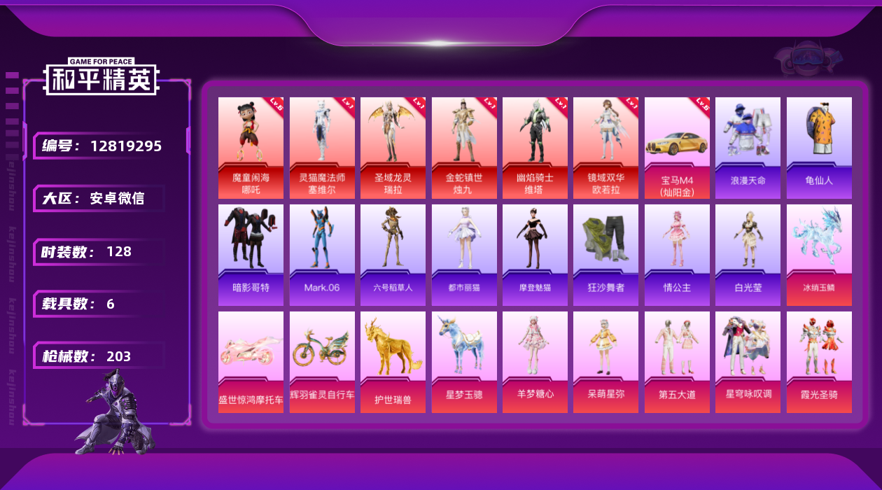 [12819295]钱包1.1可改 素材身法号/可8套6级红装随意切换/满6级宝马M4(灿阳金)/璀璨碎片2309 安卓 微信-8神装-14粉装-15特效枪-6载具-10粉色飞行器-10.2w热力值-11王牌印记-128套装-203枪皮【红色载具】:宝马M4(灿阳金)(六级)【红色神装等级】:魔童闹海-哪吒(六级),灵猫魔法师-塞维尔(一级),圣域龙灵-瑞拉(一级),金蛇镇世-烛九(一级),幽焰骑士-维塔(一级),镜域双华-欧若拉(一级)【热门品类】:粉装-梦幻火箭,套装-浪漫天命,套装-龟仙人,套装-暗影哥特,角色-Mark.06,角色-六号稻草人【粉色载具】:宝马M4(灿阳金),盛世惊鸿摩托车,星梦玉骢,护世瑞兽,冰绡玉鳞,辉羽雀灵自行车【粉色套装】:粉装-梦幻火箭,粉装-彩虹甜喵,粉装-霞光圣骑,粉装-第五大道,角色-呆萌星弥,角色-小可学妹,角色-小叽联名款,角色-美雪,粉装-金丰海韵,角色-千金淑猫,角色-翎光蝶翼,角色-圣辉之星,粉装-星穹咏叹调,角色-羊梦糖心【粉色枪皮等级】:AKM-幽焰骑士(三级),M16A4-垂柳戏鸭(六级),SCAR-L-魔童闹海 哪吒(三级),M416-风花雪月(一级),M416-灵猫魔法师(六级),GROZA-镜光银凌(五级),Vector-最终圣卫者(三级),AKS-74U-星穹咏叹调(五级),Kar98K-巳巳如意(五级),Kar98K-圣域龙灵(二级),M24-镜域双华(三级),DP-28-千金淑猫(一级),DP-28-豹影疾电(五级),平底锅-喜羊羊与灰太狼(三级)【粉色飞行器】:镜域双华-灵镜之阶,曦光华影飞行器,幽焰列车飞行器,万象金身飞行器,圣域金龙飞行器,雀灵庇佑飞行器,终晖之翼飞行器,灵猫魔法师飞行器,飞天猪飞行器