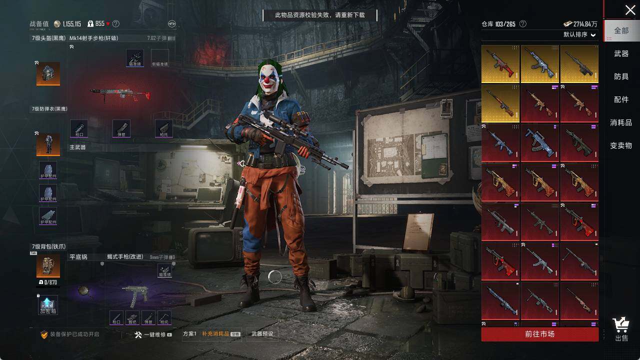- [11676263]总资产:268.8 8传说枪械 顶尖安全箱(9.17到期) 可二次 可修改实名 优质装备:顶级安全箱(3x3) 烽火地带段位:黑鹰 全面战场段位:军士长 哈夫币:140 传说武器皮肤:QJB201轻机枪-风林火山,SMG45冲锋枪-骑士,CAR-15突击步枪-阿米娅,复合弓-黑-天际线,AK-12突击步枪-特斯拉线圈,SR-3M紧凑突击步枪-特斯拉线圈,UZI冲锋枪-特斯拉线圈,勇士冲锋枪-能天使-午夜邮差 史诗武器皮肤:SR-25射手步枪-战场英杰,MP5冲锋枪-深海恐惧,SG552突击步枪-深海恐惧,AKM突击步枪-林中猎手,SVD狙击步枪-暗夜猎手,M16A4突击步枪-竞赛选手,M1014霰弹枪-林中猎手,SV-98狙击步枪-林中猎手,沙漠之鹰-曙光,SVD狙击步枪-阿萨拉工艺,S12K霰弹枪-曙光,M700狙击步枪-竞技风