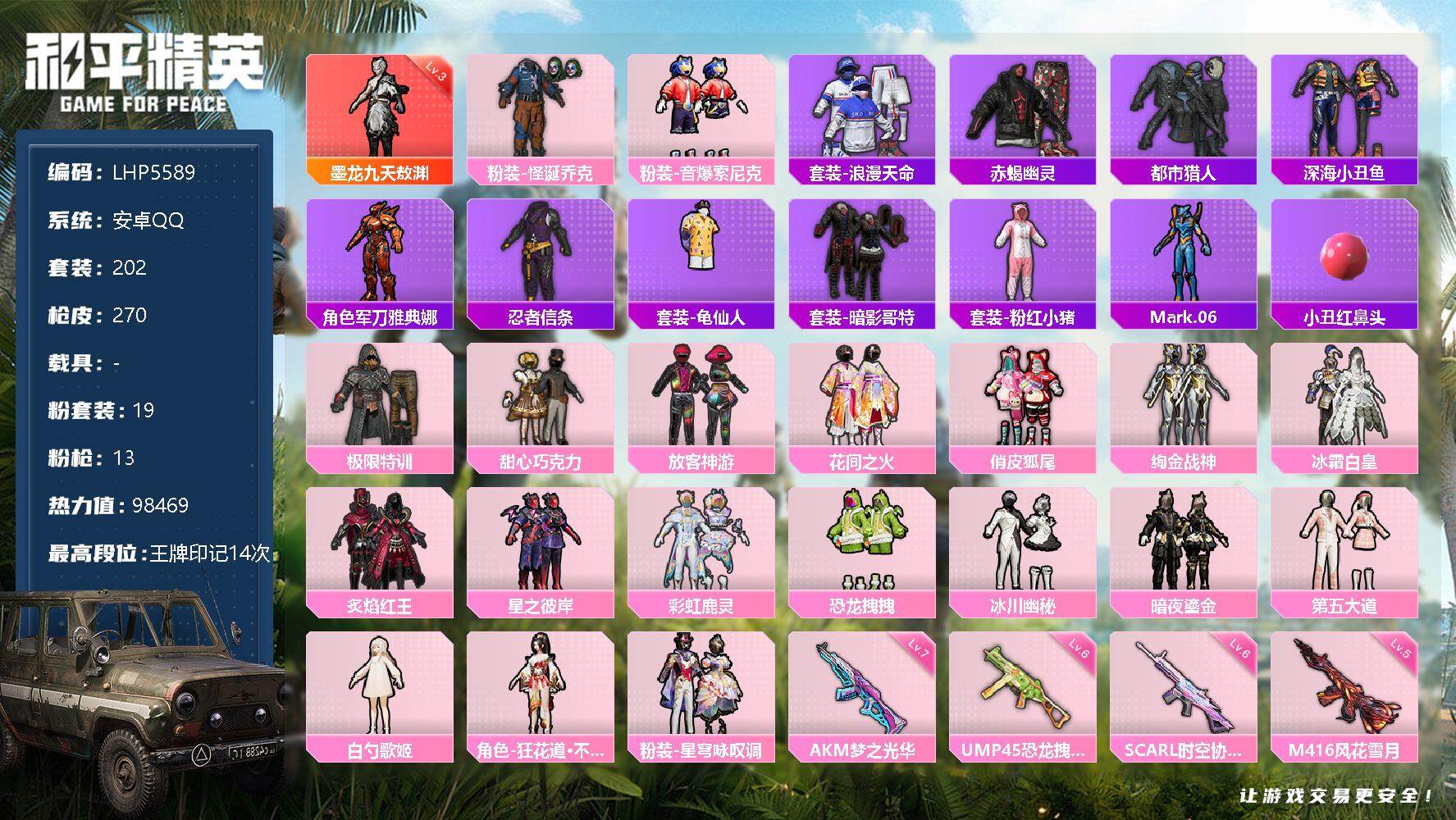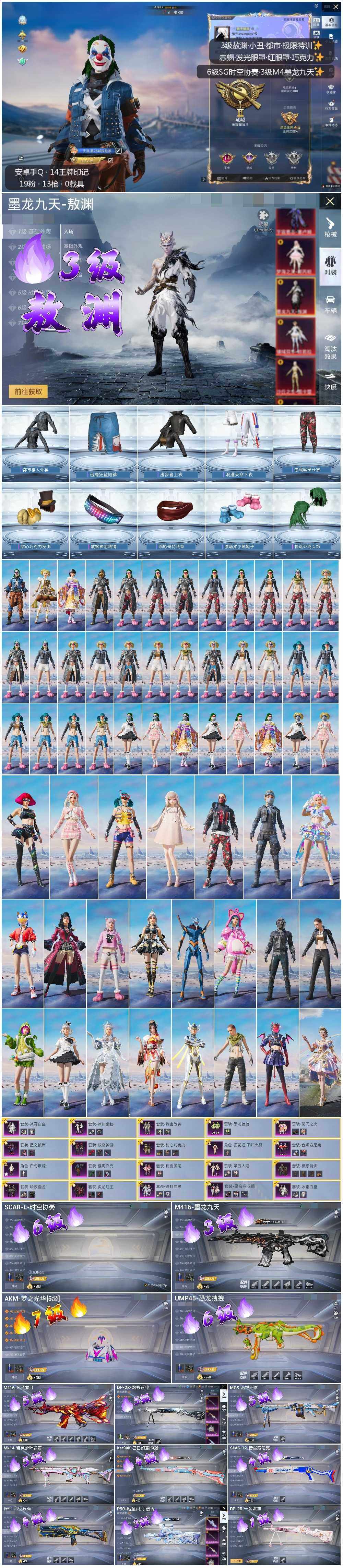 [12819317]素材身法号/地铁满天赋 安卓 手Q-1神装-19粉装-13特效枪-6粉色飞行器-9.8w热力值-14王牌印记-202套装-270枪皮【红色神装等级】:墨龙九天-敖渊(三级)【热门品类】:粉装-怪诞乔克,粉装-音爆索尼克,套装-浪漫天命,套装-赤蝎幽灵,套装-都市猎人,套装-深海小丑鱼,角色-军刀雅典娜,套装-忍者信条,套装-龟仙人,套装-暗影哥特,套装-粉红小猪,角色-Mark.06,小丑红鼻头【粉色套装】:粉装-极限特训,粉装-怪诞乔克,粉装-甜心巧克力,粉装-放客神游,粉装-花间之火,粉装-俏皮狐尾,粉装-绚金战神,粉装-冰霜白皇,粉装-炙焰红王,粉装-星之彼岸,粉装-彩虹鹿灵,粉装-恐龙拽拽,粉装-冰川幽秘,粉装-暗夜鎏金,粉装-音爆索尼克,粉装-第五大道,角色-白勺歌姬,角色-狂花道·不知火舞,粉装-星穹咏叹调【粉色枪皮等级】:AKM-梦之光华(七级),SCAR-L-时空协奏(六级),M416-风花雪月(五级),M416-墨龙九天(三级),UMP45-恐龙拽拽(六级),野牛-青空秋雨(四级),P90-魔童闹海 敖丙(三级),Kar98K-巳巳如意(四级),Mk14-精灵梦叶罗丽(五级),SPAS-12-音爆索尼克(四级),DP-28-千金淑猫(一级),DP-28-豹影疾电(五级),MG3-洛神天依(五级)【粉色飞行器】:星夜魔法师飞行翼,龙翔九天飞行器,冠军兔兔飞行器,灵珠游龙飞行器