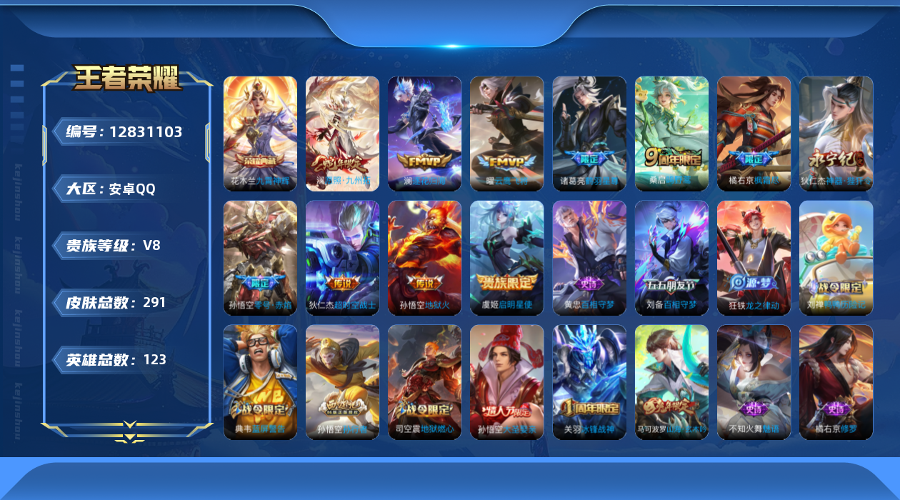 [12831103]安卓Q-V8-最强王者段位-123英雄-291皮肤-1典藏-0珍品无双-0无双-0珍品传说-11传说-74史诗