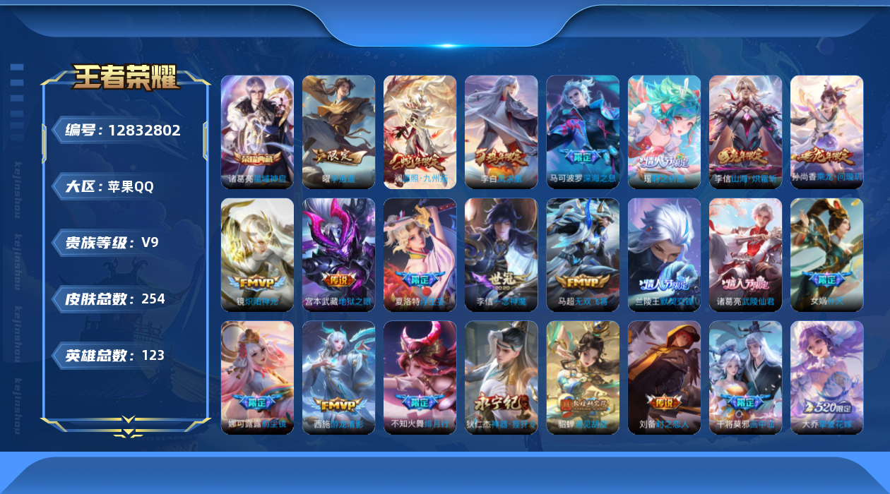 [12832802]苹果Q-V9-尊贵铂金I段位-123英雄-254皮肤-1典藏-0珍品无双-0无双-0珍品传说-41传说-81史诗 【荣耀典藏】:诸葛亮星域神启 【内测皮肤】:嬴政优雅恋人,高渐离玩趣恶龙 【传说皮肤】:宫本武藏地狱之眼,李白凤求凰,诸葛亮武陵仙君,梦奇胖达荣荣,花木兰冠军飞将,貂蝉猫影幻舞,刘备时之恋人,李信一念神魔,虞姬启明星使,镜炽阳神光,铠绛天战甲,兰陵王默契交锋,曜李逍遥 ,西施游龙清影,王昭君乞巧织情,赵云淬星耀世,貂蝉遇见胡旋,瑶时之祈愿,女娲补天,蔡文姬花朝如约,露娜启示之音,孙策挚爱之约,大乔挚爱花嫁,马超无双飞将,马可波罗深海之息,娜可露露前尘镜,不知火舞绯月行,狄仁杰神器狴犴令,李信山海炽霜斩,伽罗炽翼辉光,项羽无限倾心,虞姬无限倾心,花木兰燃星之曲,干将莫邪画中仙,夏洛特浮生妄,张飞百相守梦,安琪拉追逃游戏,亚瑟追逃游戏,东皇太一灼幽烈阳,孙尚香乘龙问璇玑,澜愿照九州拓 【限定皮肤】:狄仁杰阴阳师,赵云皇家上将,赵云龙胆,墨子神迹守卫,墨子降魔,嬴政优雅恋人,鲁班七号乒乒小将,庄周玄嵩,高渐离玩趣恶龙,吕布御风骁将,元歌云间偶戏,元歌无心,夏侯惇朔风刀,马可波罗暗影游猎,马可波罗深海之息,狄仁杰魔术师,狄仁杰万华元夜,狄仁杰神器狴犴令,达摩星际陆战队,达摩沙漠行僧,项羽海滩派对,项羽无限倾心,老夫子醍醐杖,老夫子航海奇遇记,关羽冰锋战神,关羽百相守梦,貂蝉遇见胡旋,安琪拉追逃游戏,程咬金演武夺筹,露娜一生所爱,露娜启示之音,韩信逐梦之影,韩信飞衡,韩信傲雪梅枪,兰陵王默契交锋,兰陵王金庭之子,花木兰燃星之曲,不知火舞绯月行,娜可露露前尘镜,亚瑟潮玩骑士王,亚瑟追逃游戏,孙悟空美猴王,孙悟空至尊宝,孙悟空孙行者,牛魔奔雷神使,后羿如梦令,刘备百相守梦,张飞百相守梦,李元芳云中旅人,虞姬启明星使,虞姬无限倾心,钟馗驱傩正仪,女娲补天,干将莫邪冰霜恋舞曲,干将莫邪画中仙,雅典娜单词大作战,鬼谷子原初探秘者,鬼谷子五谷丰年,诸葛亮武陵仙君,大乔白鹤梁神女,大乔挚爱花嫁,铠青龙志,苏烈玄武志,苏烈千军破阵,弈星混沌棋,公孙离蜜橘之夏,沈梦溪大漠名商,沈梦溪匿光破解者,明世隐疑决卦,裴擒虎李小龙,裴擒虎擒涛扼浪,米莱狄胡桃异想国,瑶时之祈愿,云中君纤云弄巧,李信山海炽霜斩,伽罗炽翼辉光,孙策挚爱之约,猪八戒西部大镖客,猪八戒猪悟能,上官婉儿梁祝,上官婉儿