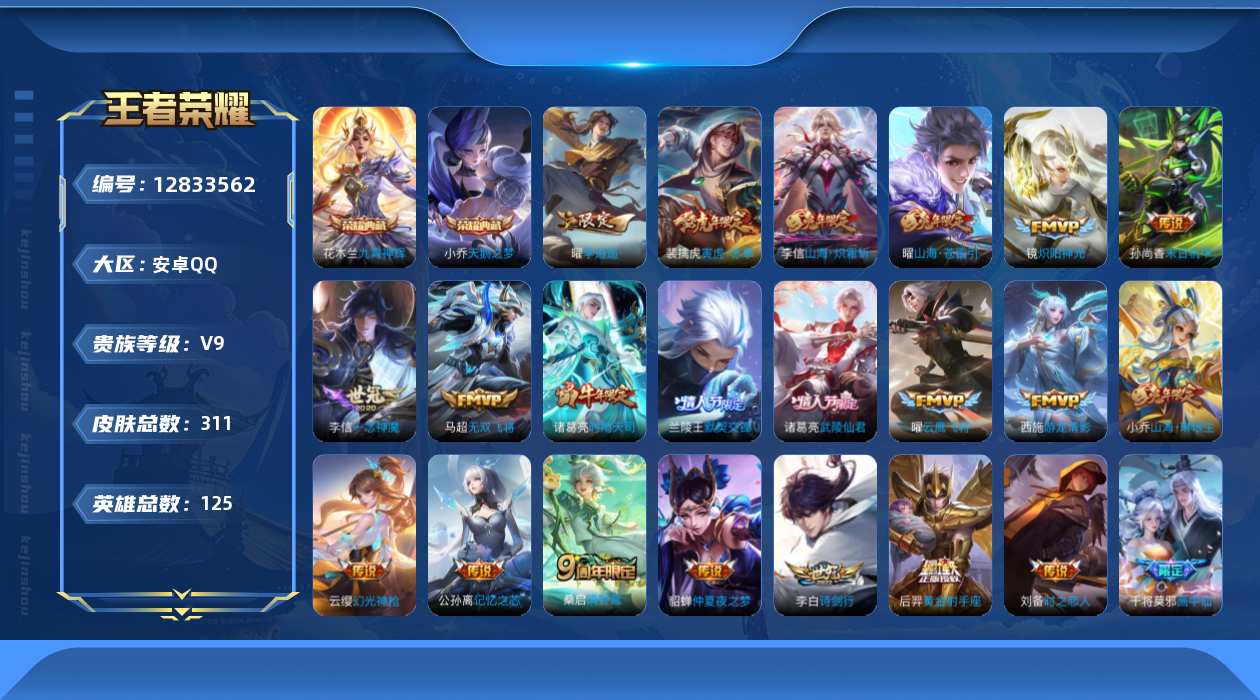 [12833562]安卓Q-V9-至尊星耀IV段位-124英雄-311皮肤-2典藏-0珍品无双-0无双-0珍品传说-29传说-104史诗