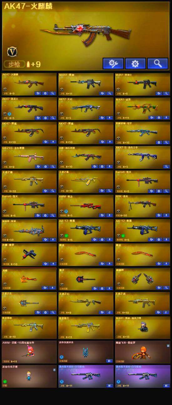 【英雄级武器】:M4A1-武圣,QBZ03-金色蔷薇,无影-神兵利器,M4A1-雷神,M4A1-黑骑士,RPK-盘龙,加特林-炼狱,AK47-火麒麟*2,AK47-黑武士,AK12-天启,Barrett-毁灭*2,AWM-裁决,AA-12-雷霆*2,AK47-黑鲨*2,沙鹰-修罗,麒麟刺,擎天,龙啸,屠龙*2