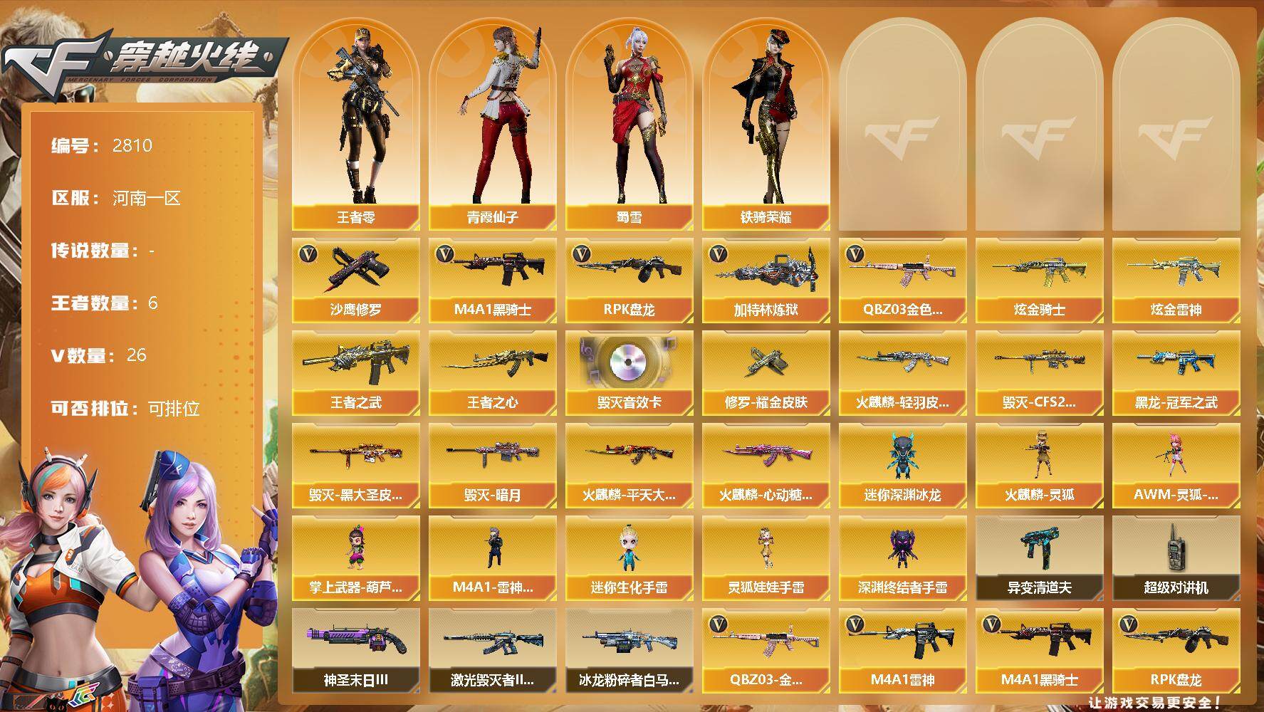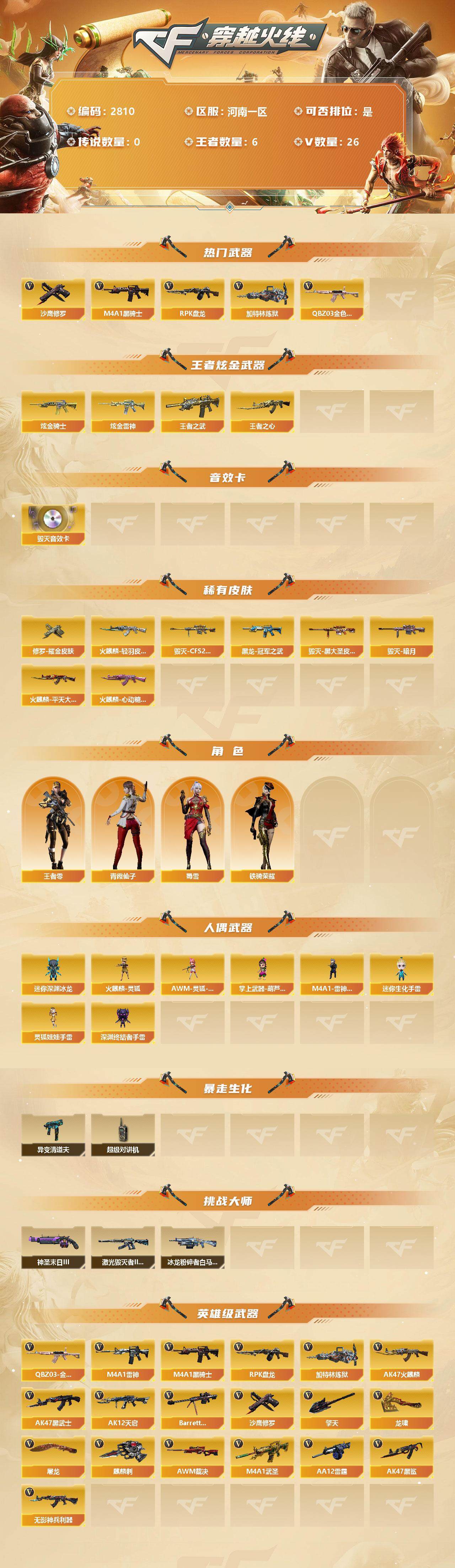 [12834065]河南一区-26V-6王者-2炫金 【热门武器】:QBZ03-金色蔷薇,M4A1-黑骑士,RPK-盘龙,加特林-炼狱,沙鹰-修罗 【王者炫金武器】:炫金骑士,炫金雷神,王者之武,王者之心 【音效卡】:Barrett-毁灭音效卡 【稀有皮肤】:火麒麟-轻羽皮肤,火麒麟-平天大圣,火麒麟-心动糖果,黑龙-冠军之武,毁灭-暗月,毁灭-CFS2020,毁灭-黑大圣皮肤,修罗耀金皮肤 【角色】:王者-零,蜀雪,铁骑荣耀,青霞仙子 【人偶武器】:火麒麟-灵狐,AWM-灵狐-15周年嘉年华,掌上武器-葫芦兄弟,M4A1-雷神-精英刀锋,迷你深渊冰龙,迷你生化手雷,灵狐娃娃手雷,深渊终结者手雷*2 【暴走生化】:异变清道夫,超级对讲机 【挑战大师】:神圣爆裂者-末日III,激光毁灭者III-白马银枪*2,冰龙粉碎者-白马银枪*2 【英雄级武器】:M4A1-武圣,QBZ03-金色蔷薇,无影-神兵利器,M4A1-雷神,M4A1-黑骑士,RPK-盘龙,加特林-炼狱,AK47-火麒麟*2,AK47-黑武士,AK12-天启,Barrett-毁灭*2,AWM-裁决,AA-12-雷霆*2,AK47-黑鲨*2,沙鹰-修罗,麒麟刺,擎天,龙啸,屠龙*2 【特殊枪械】:1黑骑士,1盘龙,1炼狱