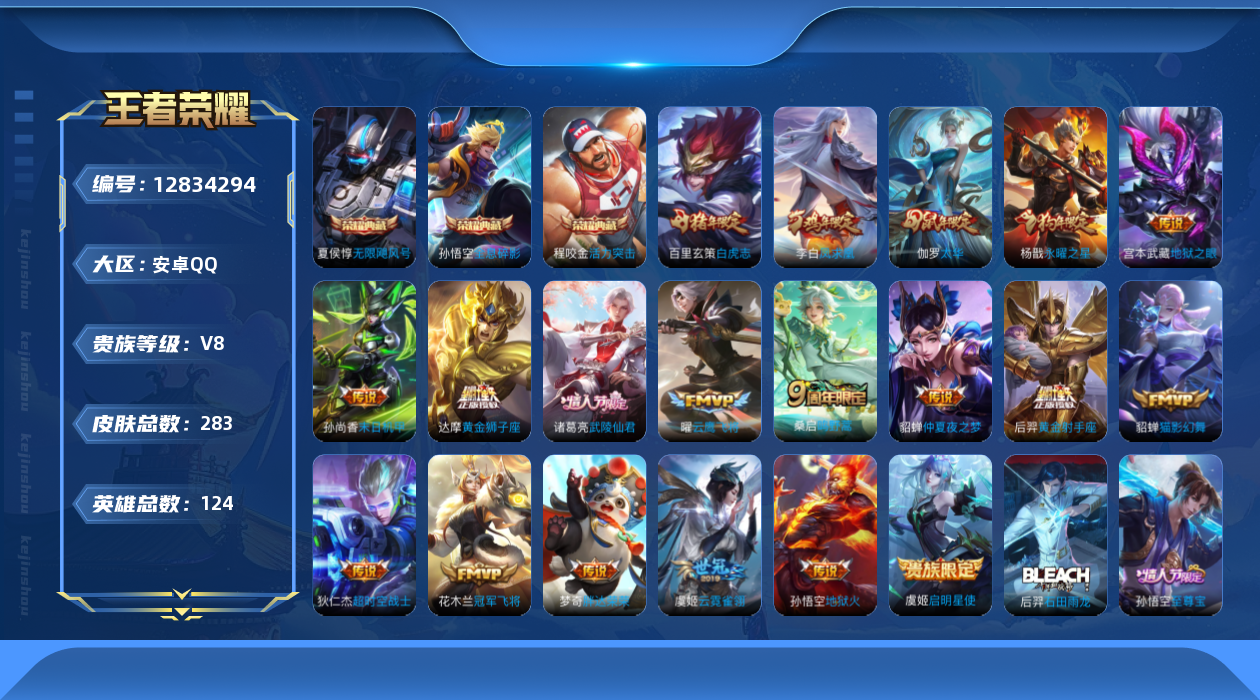 [12834294]安卓Q-V0-尊贵铂金II段位-124英雄-283皮肤-3典藏-0珍品无双-0无双-0珍品传说-19传说-93史诗