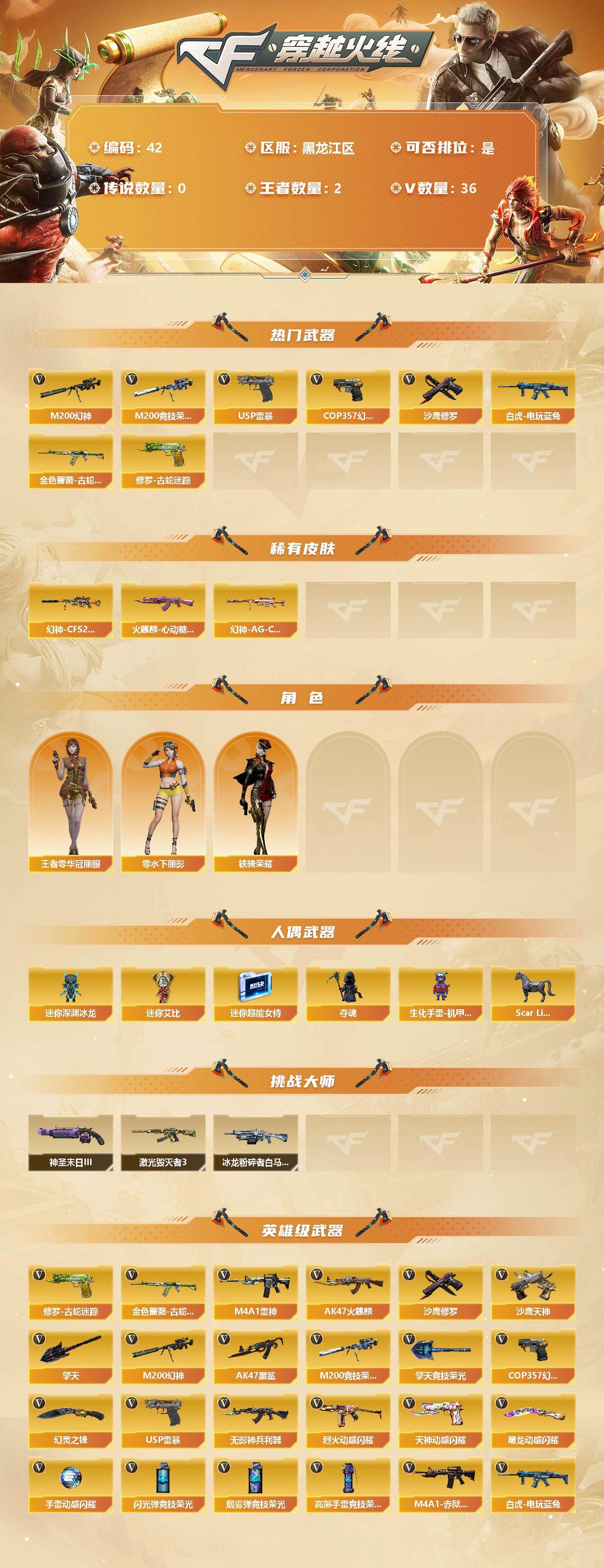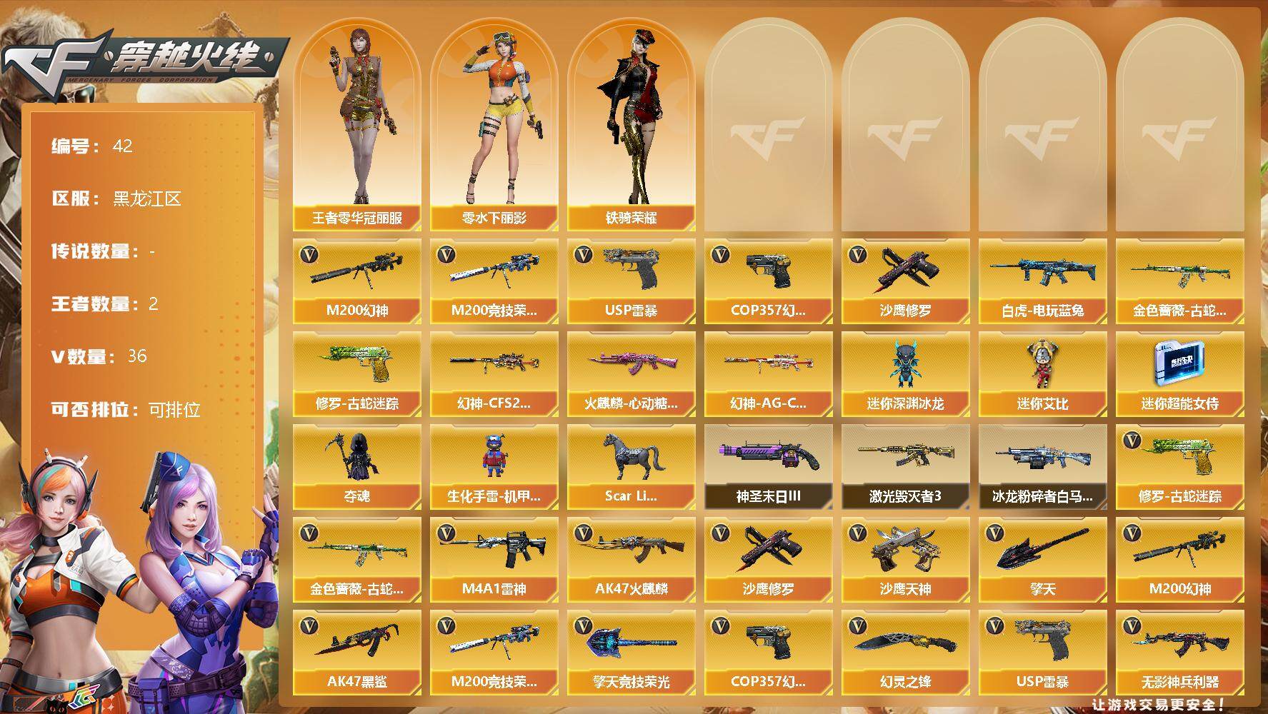 [12835314]【42】35V/102级/荣耀元首/2王者/1英雄/M200-幻神/金色蔷薇-古蛇迷踪/修罗-古蛇迷踪/M200-竞技荣光/白虎-电玩蓝兔/USP雷暴/COP 357-幻灵/沙鹰-修罗/幻神-CFS2022/幻神-AG-CFPL S24冠军/火麒麟-心动糖果/王者-零-华冠丽服/零-水下丽影/铁骑荣耀/Scar Light-马枪/迷你深渊冰龙/迷你艾比/迷你超能女侍/夺魂/生化手雷-机甲核心/神圣爆裂者-末日/激光毁灭者/冰龙粉碎者-白马银枪/擎天-竞技荣光/高爆手雷-竞技荣光/烟雾弹-竞技荣光/闪光弹-竞技荣光/幻灵之锋/烈火-动感闪耀/天神-动感闪耀/屠龙-动感闪耀/手雷-动感闪耀/无影-神兵利器/M4A1-雷神/AK47-火麒麟/AK47-黑鲨/M4A1-赤狱骑士/沙鹰-天神/擎天