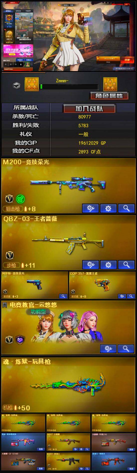 - [12068040]【商品标题】:福建一区-40V-11王者-0炫金 【热门武器】:M200-幻神,死亡之眼*2,汤姆逊-烈龙*2,RPK-盘龙,加特林-炼狱*2,火麒麟-绝迹,沙鹰-修罗*2,金刚伞 【王者炫金武器】:王者之怒,王者之魄 【音效卡】:M200-幻神音效卡,M4A1-雷神音效卡,Barrett-毁灭音效卡 【稀有皮肤】:幻神-AG-CFPLS17冠军,雷神-荣耀之魄,火麒麟-平天大圣,火麒麟-心动糖果,毁灭-星空,天神-暗月,龙啸-冠军之啸 【角色】:王者-葵-貂蝉,零,魅影,青霞仙子 【人偶武器】:火麒麟-绝迹,AWM-灵狐-15周年嘉年华,闪光弹-小乔,闪光弹-貂蝉,高爆手雷-大乔 【暴走生化】:死亡之眼*2,超级对讲机 【英雄级武器】:擎天-竞技荣光,高爆手雷-竞技荣光,M4A1-雷神,M4A1-玫瑰精灵,RPK-盘龙,加特林-炼狱*2,汤姆逊-烈龙*2,AK47-无影,AK47-火麒麟*2,Barrett-毁灭,AWM-裁决,Barrett-朱雀,M200-幻神,AK47-黑鲨,AK-47-猩红传说*4,AK47-B-战神*2,AK47-B-常胜将军,沙鹰-天神*2,沙鹰-修罗*2,擎天,龙啸,屠龙*2 【特殊枪械】:2烈龙,1盘龙,2炼狱