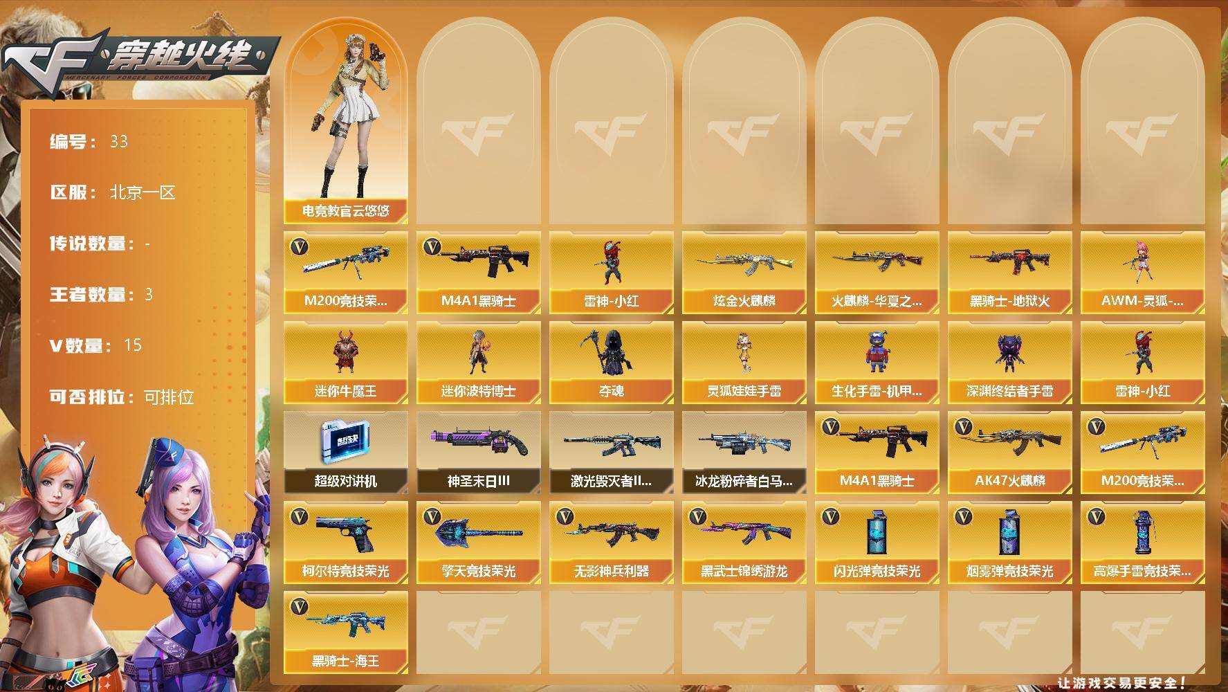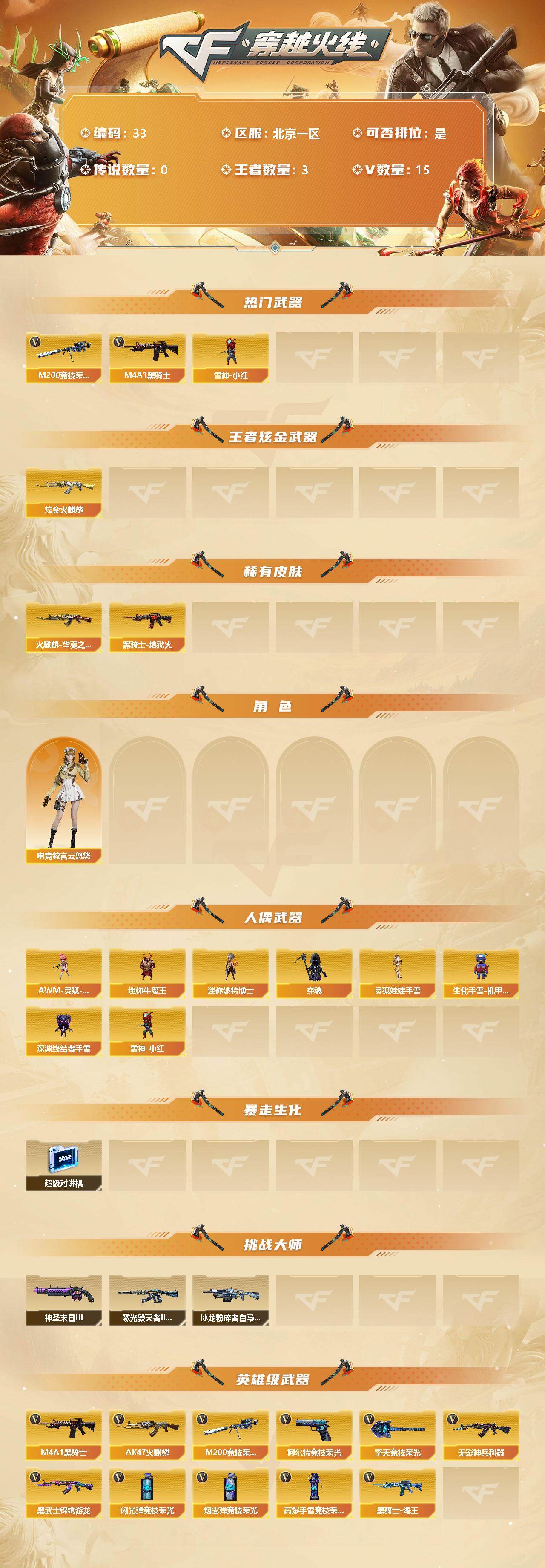[12835310]【33】14V/99级/将帅/3王者/1炫金/1英雄/M200-竞技荣光/M4A1-黑骑士/雷神-小红/炫金火麒麟/火麒麟-华夏之心/黑骑士-地狱火/电竞教官-云悠悠/AWM-灵狐-15周年嘉年华/迷你牛魔王/迷你波特博士/夺魂/灵狐娃娃手雷/生化手雷-机甲核心/深渊终结者手雷/超级对讲机/神圣爆裂者-末日/激光毁灭者III-白马银枪/冰龙粉碎者-白马银枪/柯尔特-竞技荣光/擎天-竞技荣光/高爆手雷-竞技荣光/烟雾弹-竞技荣光/闪光弹-竞技荣光/无影-神兵利器/AK47-火麒麟/AK47-黑武士-锦绣游龙/黑骑士-海王
