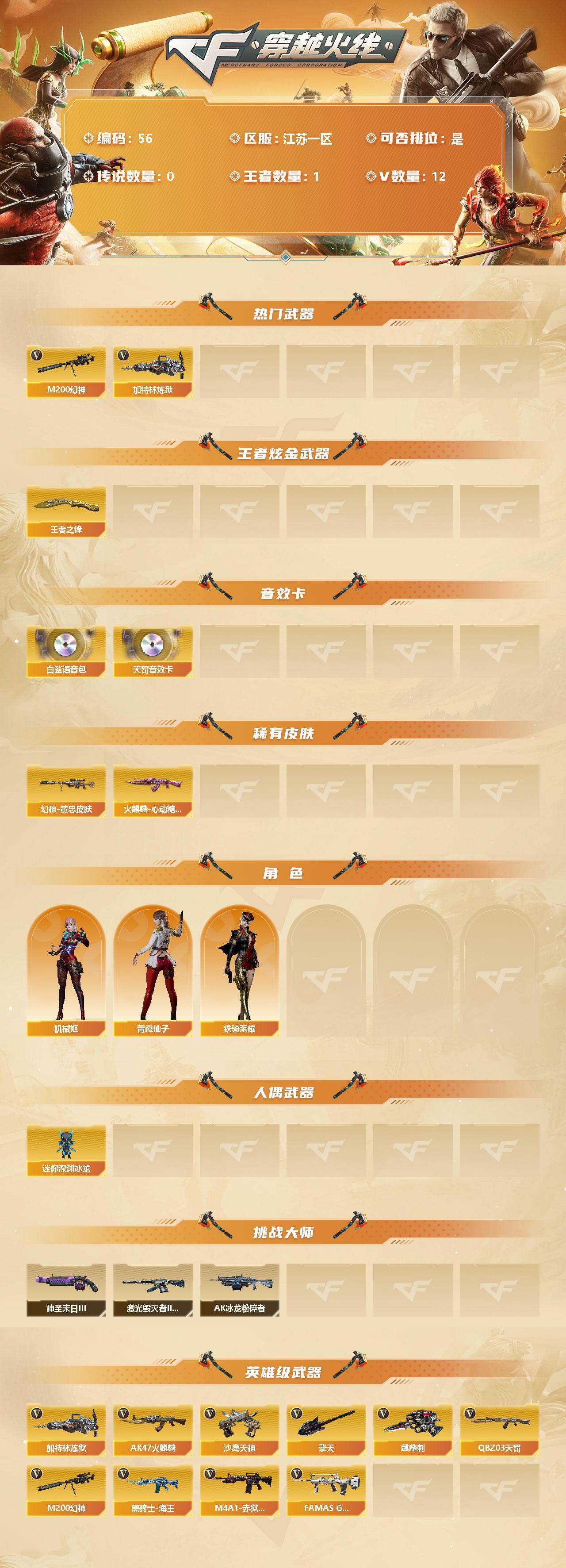 [12835320]【56】11V/102级/荣耀元首/1王者/1英雄/M200-幻神/加特林-炼狱/王者之锋/QBZ03-天罚音效卡/白鲨语音包/M200-幻神-黄忠/火麒麟-心动糖果/机械姬/铁骑荣耀/青霞仙子/迷你深渊冰龙/神圣爆裂者-末日/激光毁灭者III-白马银枪/AK47-冰龙粉碎者/FAMAS G2-天戎/AK47-火麒麟/QBZ03-天罚/黑骑士-海王/M4A1-赤狱骑士/沙鹰-天神/麒麟刺/擎天
