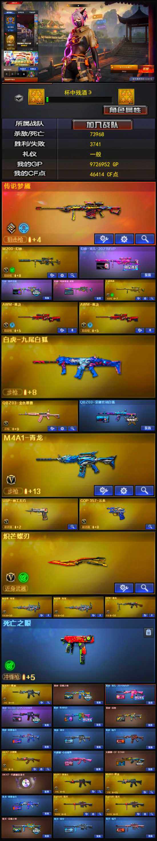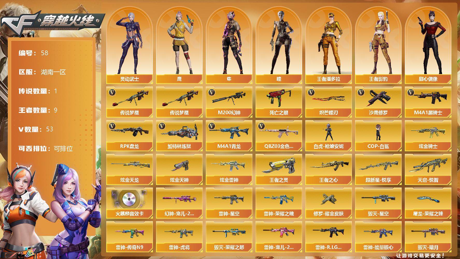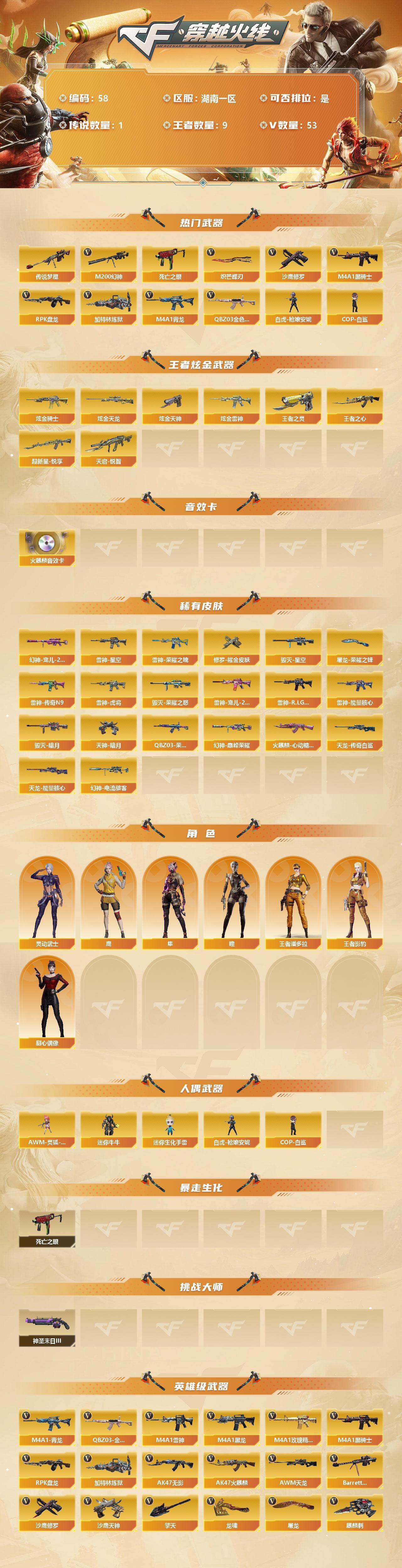 [12835321]【58】50V/96级/将帅/1传说/9王者/4炫金/3英雄/传说梦魇/QBZ03-金色蔷薇/M4A1青龙/M200-幻神/死亡之眼/M4A1-黑骑士/RPK-盘龙/加特林-炼狱/白虎-枪娘安妮/COP-白鲨/沙鹰-修罗/炽芒蝶刃/炫金黑骑士/炫金天龙/炫金天神/炫金雷神/超新星-悦享/天启-悦智/王者之心/王者之灵/AK47-火麒麟音效卡/幻神-宠儿/幻神-巅峰荣耀/幻神-电流骇客/QBZ03-荣耀世冠白鲨/雷神-能量核心/雷神荣耀之魄/雷神-星空/雷神-虎将/雷神-传奇N9/雷神-宠儿-2019MVP/雷神-R.LGD-CFPLS18冠军/火麒麟-心动糖果/毁灭-暗月/毁灭-荣耀之怒/毁灭-星空/天龙-能量核心/AWM-天龙-传奇白鲨/修罗耀金皮肤/天神-暗月/屠龙-荣耀之锋/王者影豹/王者潘多拉/瞳/鹰/隼/灵动武士/甜心偶像/AWM-灵狐-15周年嘉年华/迷你牛牛/迷你生化手雷/神圣爆裂者-末日/COP357-云龙/USP神工天巧/无影-神兵利器/M4A1-雷神/M4A1-黑龙/M4A1-玫瑰精灵/AK47-无影/AK47-火麒麟/AWM-天龙/Barrett-毁灭/AWM-裁决/AA-12-雷霆/M4A1-千变/AK47-黑武士-锦绣游龙/沙鹰-天神/麒麟刺/擎天/龙啸/屠龙/龙啸-热带奇洋