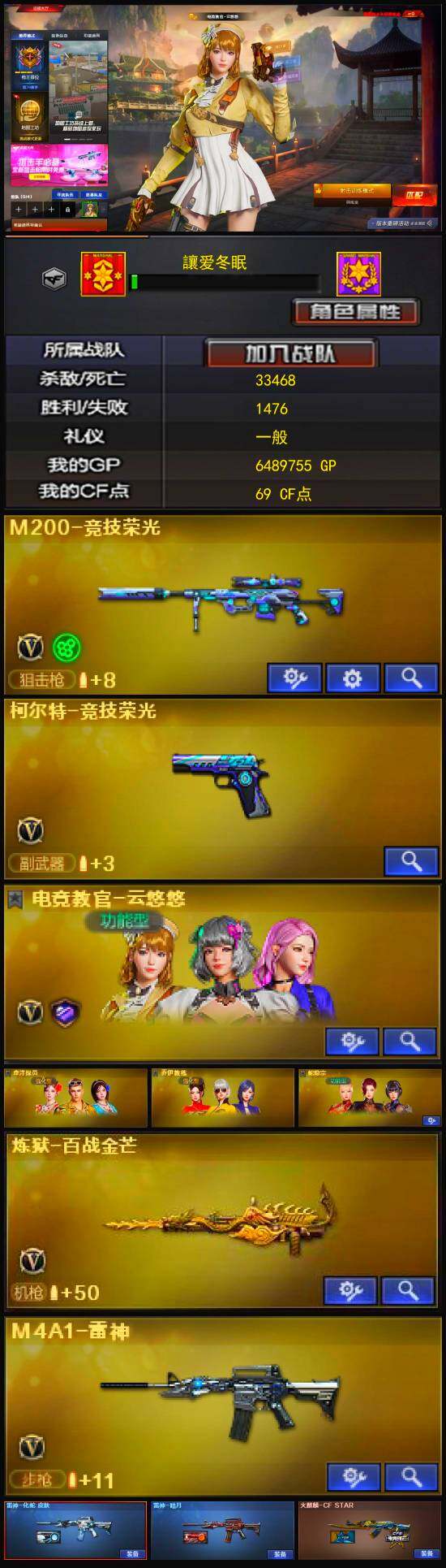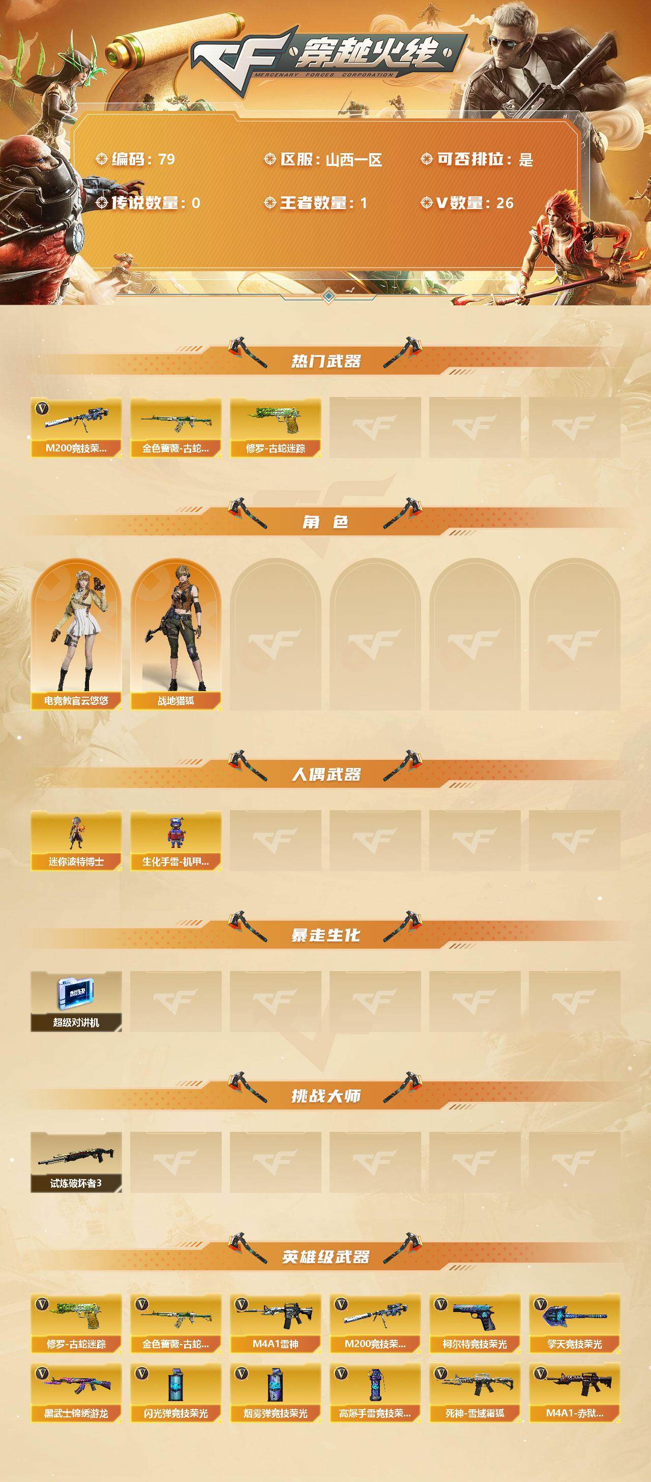 - [12236233]【商品标题】:山东一区-40V-0王者-0炫金 【传说武器】:传说梦魇 【热门武器】:传说梦魇,QBZ03-金色蔷薇,HK417-朱雀,M200-幻神,白虎-电玩蓝兔,汤姆逊-烈龙*4,斯泰尔-蝴蝶,沙鹰-修罗*2 【稀有皮肤】:幻神-巅峰荣耀,QBZ03-冠军之薇,QBZ03-AG-CFPLS19冠军,雷神-杨戬,火麒麟-心动糖果 【角色】:鹰 【人偶武器】:斯泰尔-蝴蝶,AWM-灵狐-15周年嘉年华,M4A1-雷神-精英刀锋,迷你超能女侍,生化手雷-机甲核心*2 【暴走生化】:斯泰尔-蝴蝶,超级对讲机 【挑战大师】:神圣爆裂者-末日III,激光毁灭者III-白马银枪*2 【英雄级武器】:擎天-竞技荣光,高爆手雷-竞技荣光*3,烟雾弹-竞技荣光*2,闪光弹-竞技荣光*2,烈火-动感闪耀,天神-动感闪耀,屠龙-动感闪耀,手雷-动感闪耀,QBZ03-金色蔷薇,HK417-朱雀,白虎-电玩蓝兔,无影-神兵利器,M4A1-雷神,汤姆逊-烈龙*4,AK47-火麒麟*2,Barrett-毁灭,M200-幻神,AK-47-猩红传说*2,AK47-B-战神*2,AK47-B-常胜将军,沙鹰-修罗*2,擎天,擎天-云海游龙 【特殊枪械】:蝴蝶斯泰尔+4烈龙,4烈龙,1蝴蝶斯泰尔