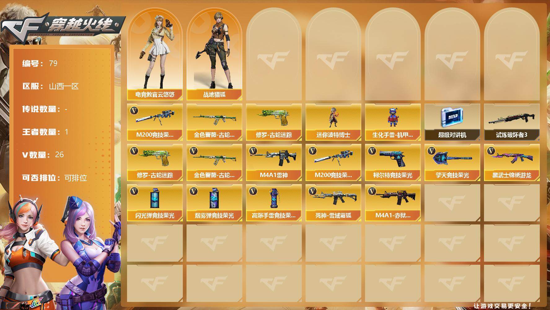 [12835367]【79】22V/100级/元帅/1王者/4英雄/金色蔷薇-古蛇迷踪/修罗-古蛇迷踪/M200-竞技荣光/电竞教官-云悠悠/战地猎狐/迷你波特博士/生化手雷-机甲核心/超级对讲机/试炼破坏者/柯尔特-竞技荣光/擎天-竞技荣光/高爆手雷-竞技荣光/烟雾弹-竞技荣光/闪光弹-竞技荣光/M4A1-雷神/AK47-黑武士-锦绣游龙/死神-雪域霜狐/M4A1-赤狱骑士