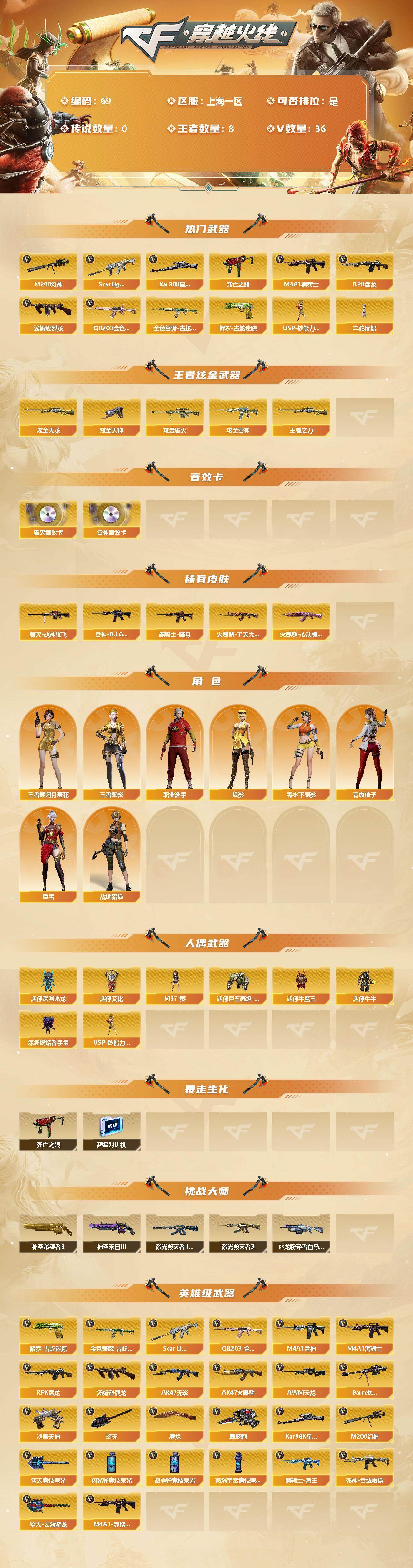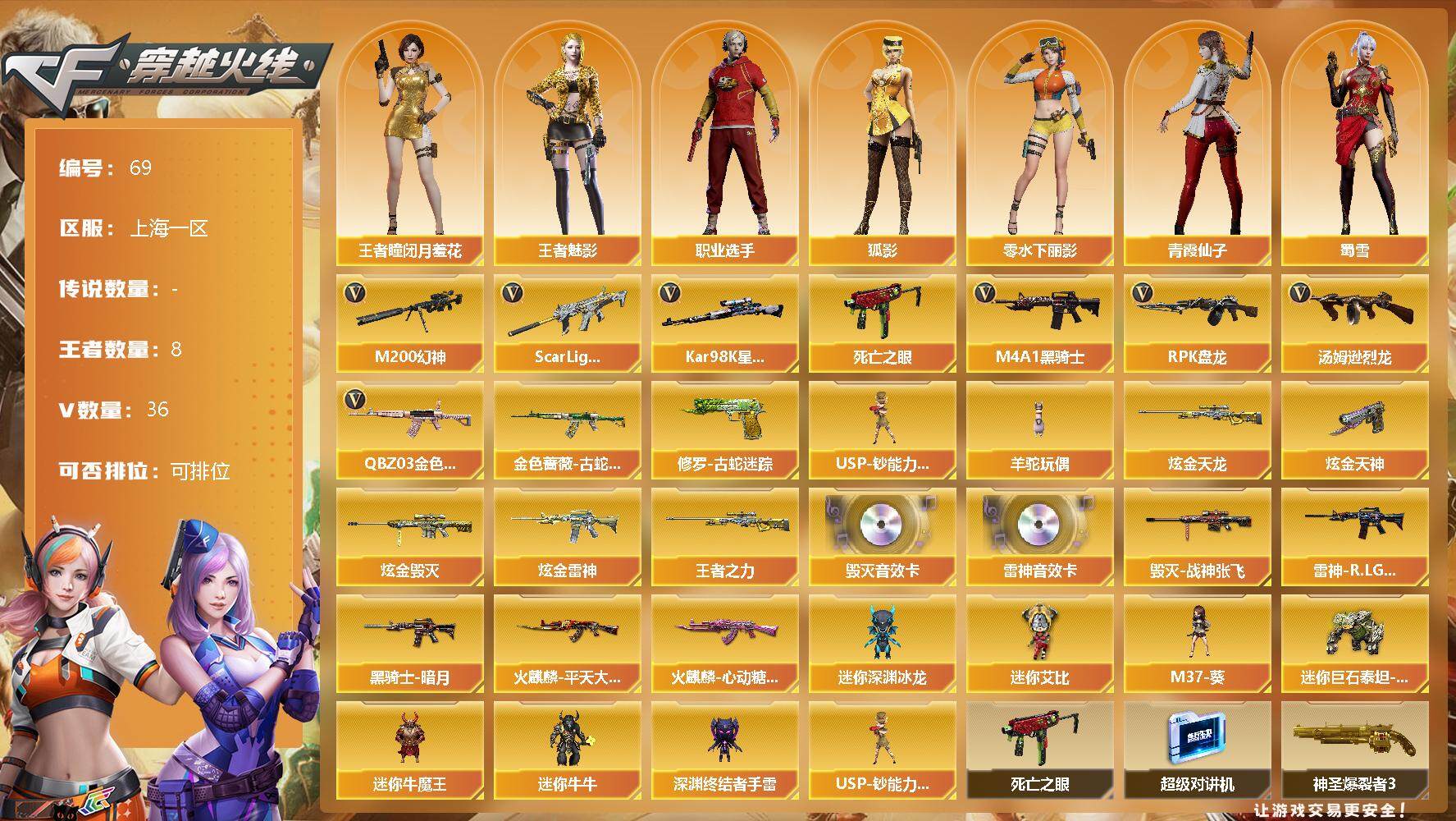 [12835398]【69】33V/100级/元帅/8王者/4炫金/3英雄/QBZ03-金色蔷薇/Scar Light-白虎/M200-幻神/金色蔷薇-古蛇迷踪/修罗-古蛇迷踪/死亡之眼/Kar98k-星神/M4A1-黑骑士/汤姆逊-烈龙/RPK-盘龙/USP-钞能力灵狐/羊驼玩偶/炫金天龙/炫金天神/炫金毁灭/炫金雷神/王者之力/M4A1-雷神音效卡/Barrett-毁灭音效卡/雷神-R.LGD-CFPLS18冠军/火麒麟-平天大圣/火麒麟-心动糖果/黑骑士-暗月/毁灭-战神张飞/王者-瞳-闭月羞花/王者-魅影/狐影/零-水下丽影/战地猎狐/蜀雪/职业选手/青霞仙子/M37-葵/迷你深渊冰龙/迷你艾比/迷你巨石泰坦-魔花研究所/迷你牛魔王/迷你牛牛/深渊终结者手雷/超级对讲机/神圣爆裂者/神圣爆裂者-末日/激光毁灭者/激光毁灭者III-白马银枪/冰龙粉碎者-白马银枪/擎天-竞技荣光/高爆手雷-竞技荣光/烟雾弹-竞技荣光/闪光弹-竞技荣光/M4A1-雷神/AK47-无影/AK47-火麒麟/AWM-天龙/Barrett-毁灭/黑骑士-海王/死神-雪域霜狐/M4A1-赤狱骑士/沙鹰-天神/麒麟刺/擎天/屠龙/擎天-云海游龙