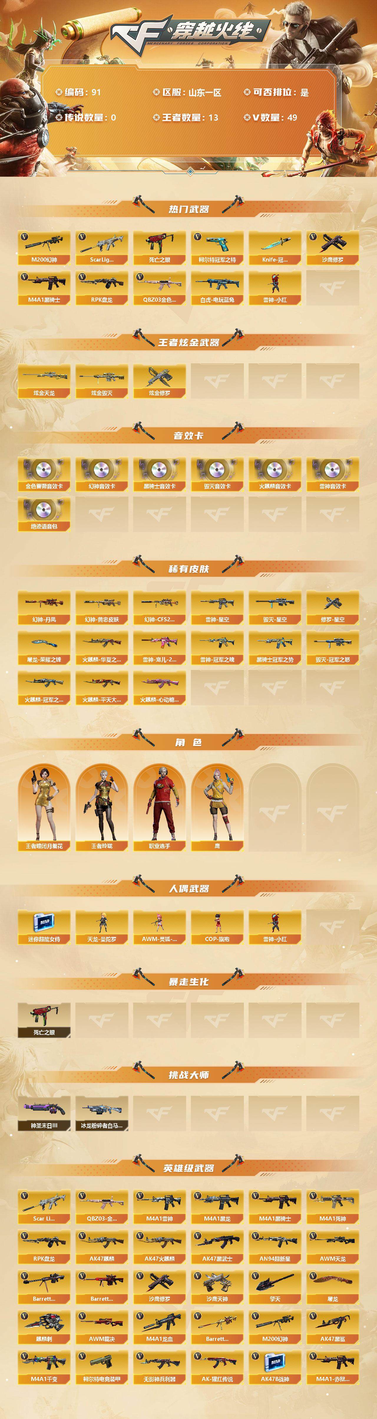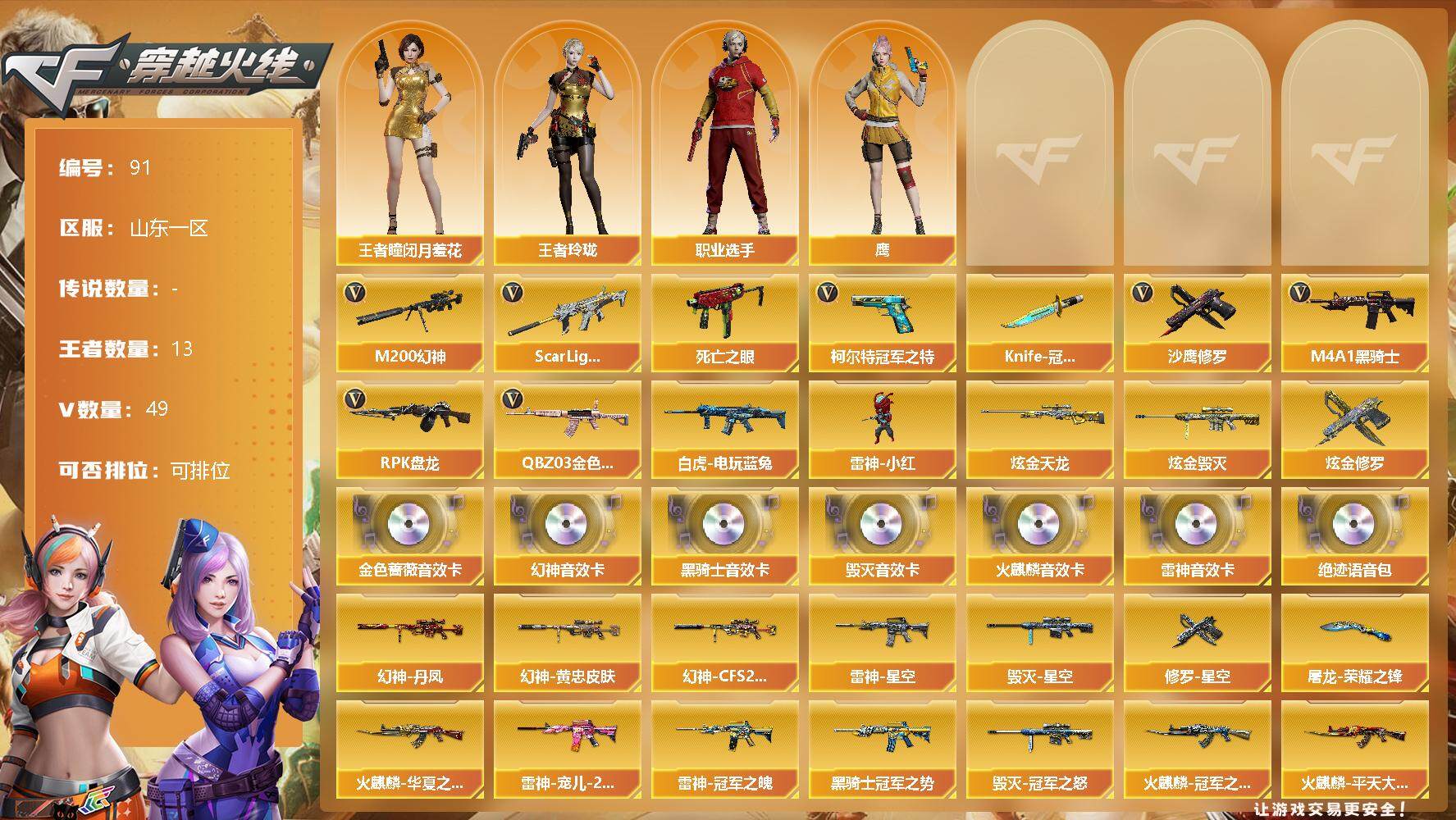 [12835415]【91】48V/100级/大元首/13王者/3炫金/1英雄/QBZ03-金色蔷薇/Scar Light-白虎/M200-幻神/死亡之眼/白虎-电玩蓝兔/柯尔特-冠军之特/M4A1-黑骑士/RPK-盘龙/雷神-小红/沙鹰-修罗/Knife-冠军之刃/炫金天龙/炫金毁灭/炫金修罗/M200-幻神音效卡/AK47-火麒麟音效卡/M4A1-雷神音效卡/M4A1-黑骑士音效卡/Barrett-毁灭音效卡/金色蔷薇音效卡/绝迹语音包/M200-幻神-黄忠/幻神丹凤/幻神-CFS2022/雷神-星空/雷神冠军之魄/雷神-宠儿-2019MVP/火麒麟-冠军之心/火麒麟-华夏之心/火麒麟-平天大圣/火麒麟-心动糖果/黑骑士-冠军之势/毁灭-星空/毁灭-冠军之怒/修罗-星空/屠龙-荣耀之锋/王者-瞳-闭月羞花/王者玲珑/鹰/职业选手/天龙-曼陀罗/AWM-灵狐-15周年嘉年华/COP-旗袍/迷你超能女侍/神圣爆裂者-末日/冰龙粉碎者-白马银枪/柯尔特-电竞装甲/无影-神兵利器/M4A1-雷神/M4A1-黑龙/M4A1-死神/AK47-麒麟/AK47-火麒麟/AK47-黑武士/AN94-超新星/AWM-天龙/Barrett-毁灭/Barrett-极光/AWM-裁决/M4A1-龙血/Barrett-朱雀/AK47-黑鲨/M4A1-千变/AK-47-猩红传说/AK47-B-战神/M4A1-赤狱骑士/沙鹰-天神/麒麟刺/擎天/屠龙