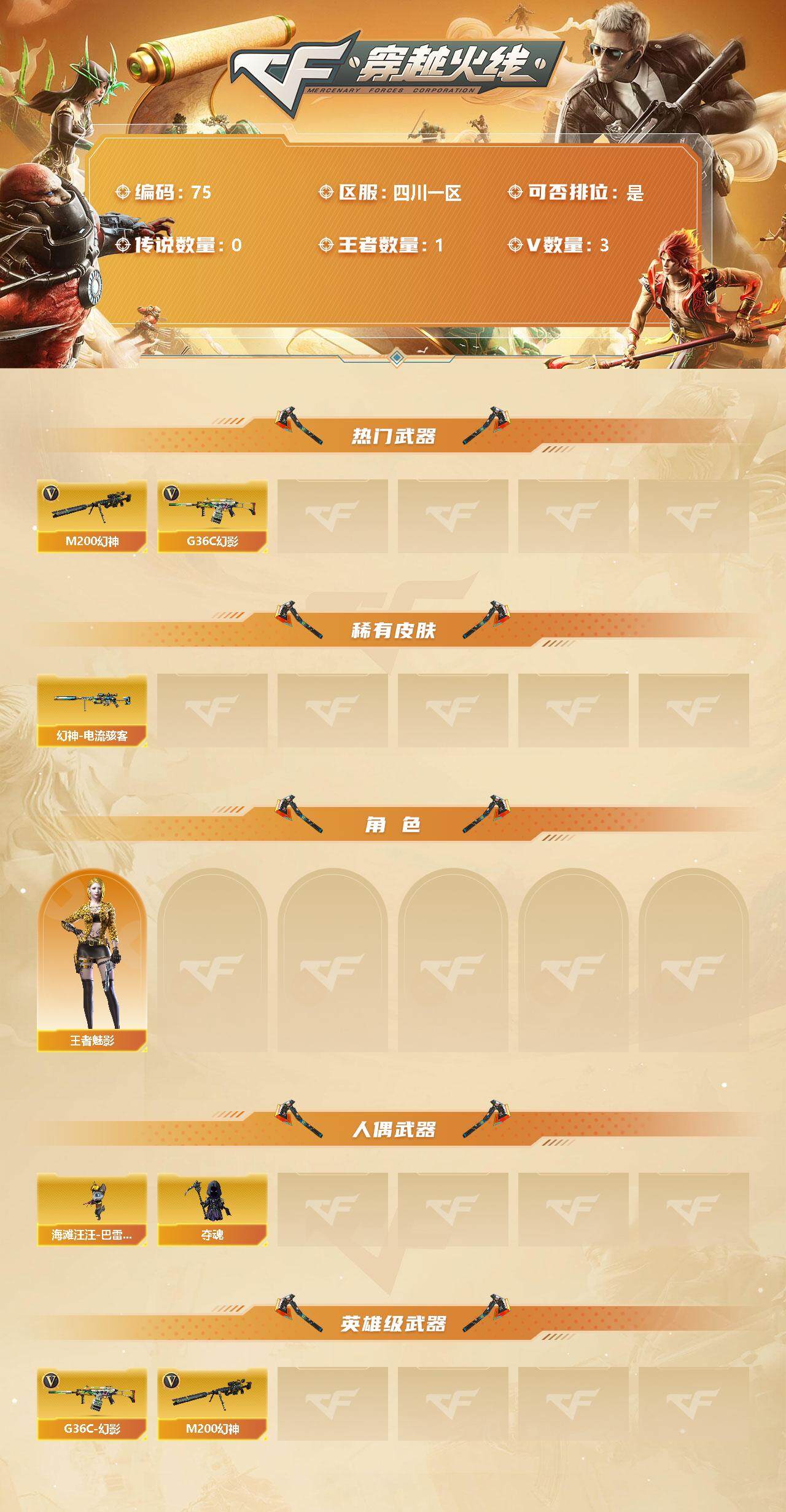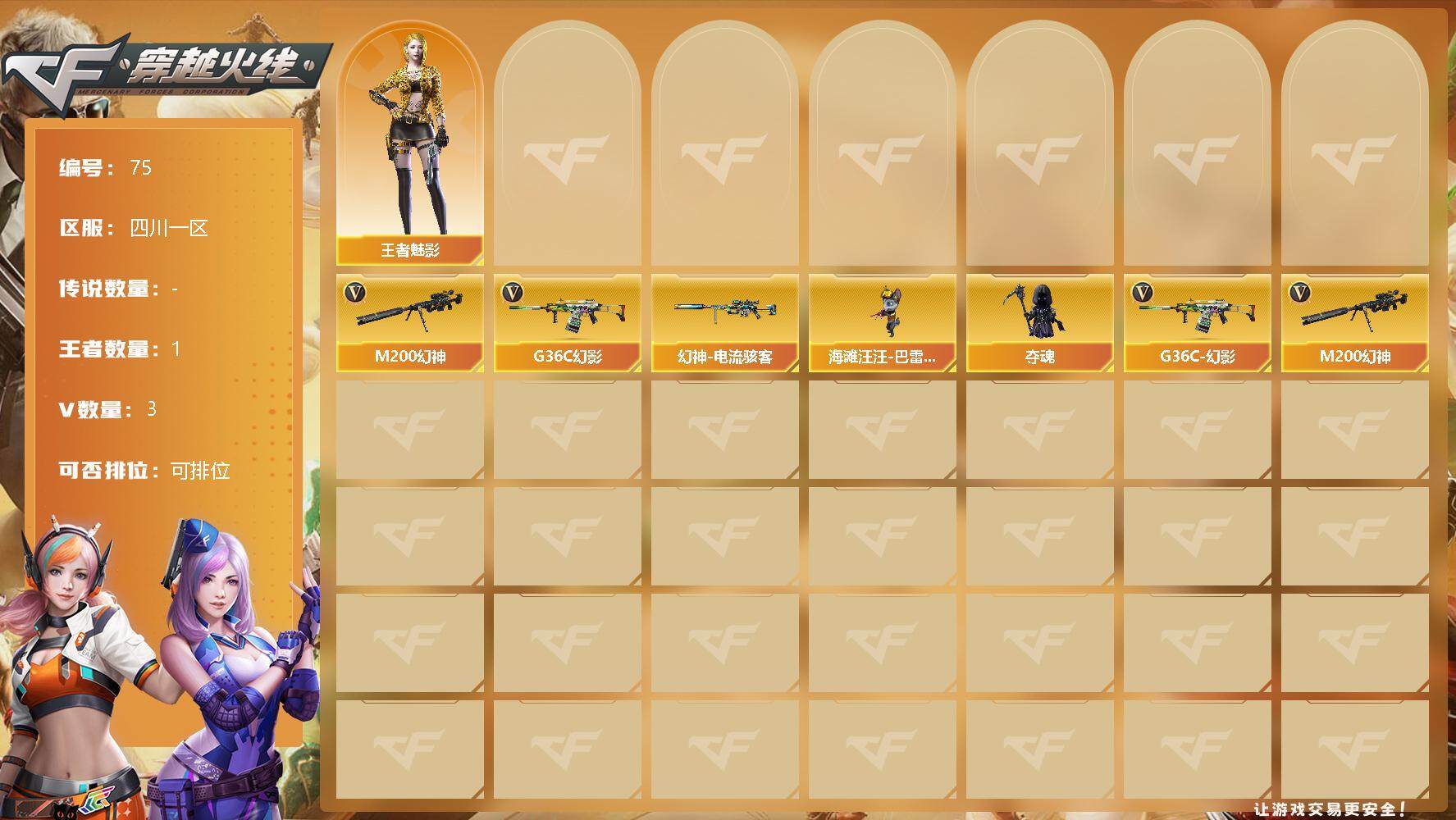 [12835396]【75】3V/100级/元帅/1王者/G36C-幻影/M200-幻神/幻神-电流骇客/王者-魅影/海滩汪汪-巴雷特/夺魂