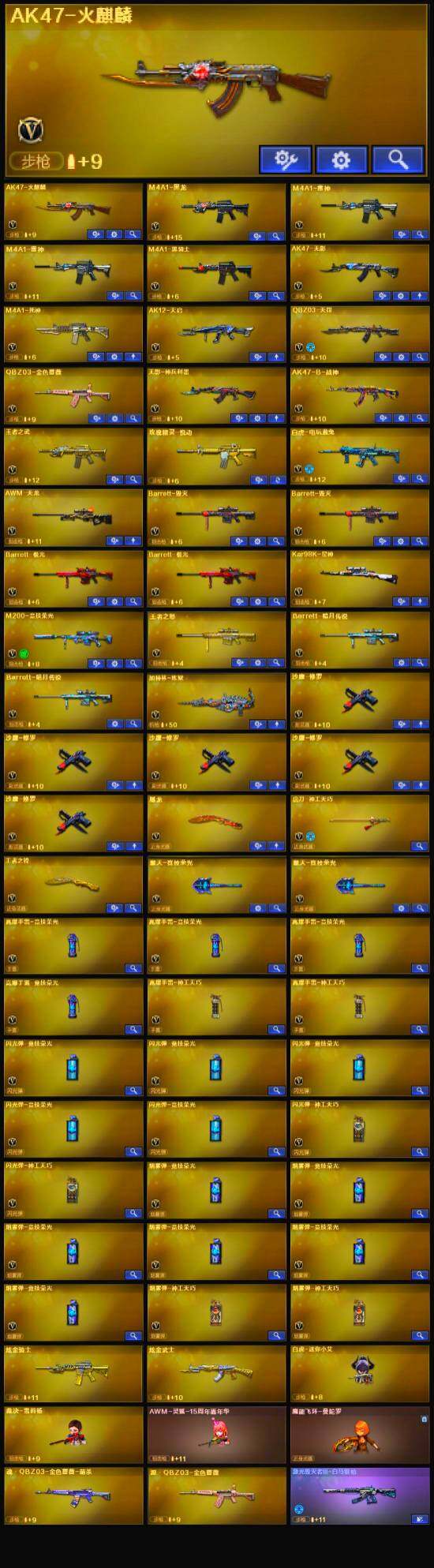 - [12846772]河南一区-26V-1王者-0炫金 【热门武器】:QBZ03-金色蔷薇,死亡之眼,沙鹰-修罗*4 【王者炫金武器】:王者之击 【稀有皮肤】:黑骑士-暗月*3,黑骑士-战神马超,毁灭-暗月,天神-暗月*2 【角色】:零,葵,蜀雪 【人偶武器】:AWM-灵狐-15周年嘉年华,迷你深渊冰龙,迷你牛魔王 【暴走生化】:死亡之眼,超级对讲机 【挑战大师】:AK47-冰龙粉碎者,冰龙粉碎者-白马银枪 【英雄级武器】:QBZ03-金色蔷薇,M4A1-雷神*2,M4A1-黑龙,M4A1-死神*2,AK47-无影,AK47-火麒麟,AK47-黑武士,AK12-天启,AWM-天龙*2,Barrett-毁灭,Barrett-极光,AK47-机械迷城,M4A1-千变,沙鹰-天神,沙鹰-修罗*4,麒麟刺,擎天 【特殊枪械】: