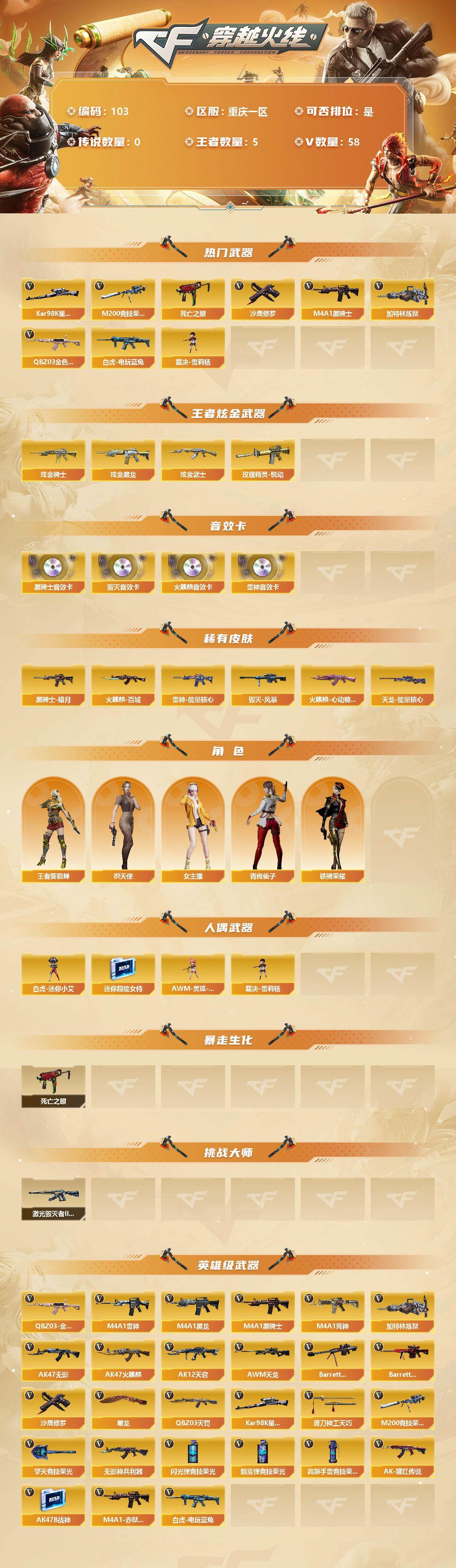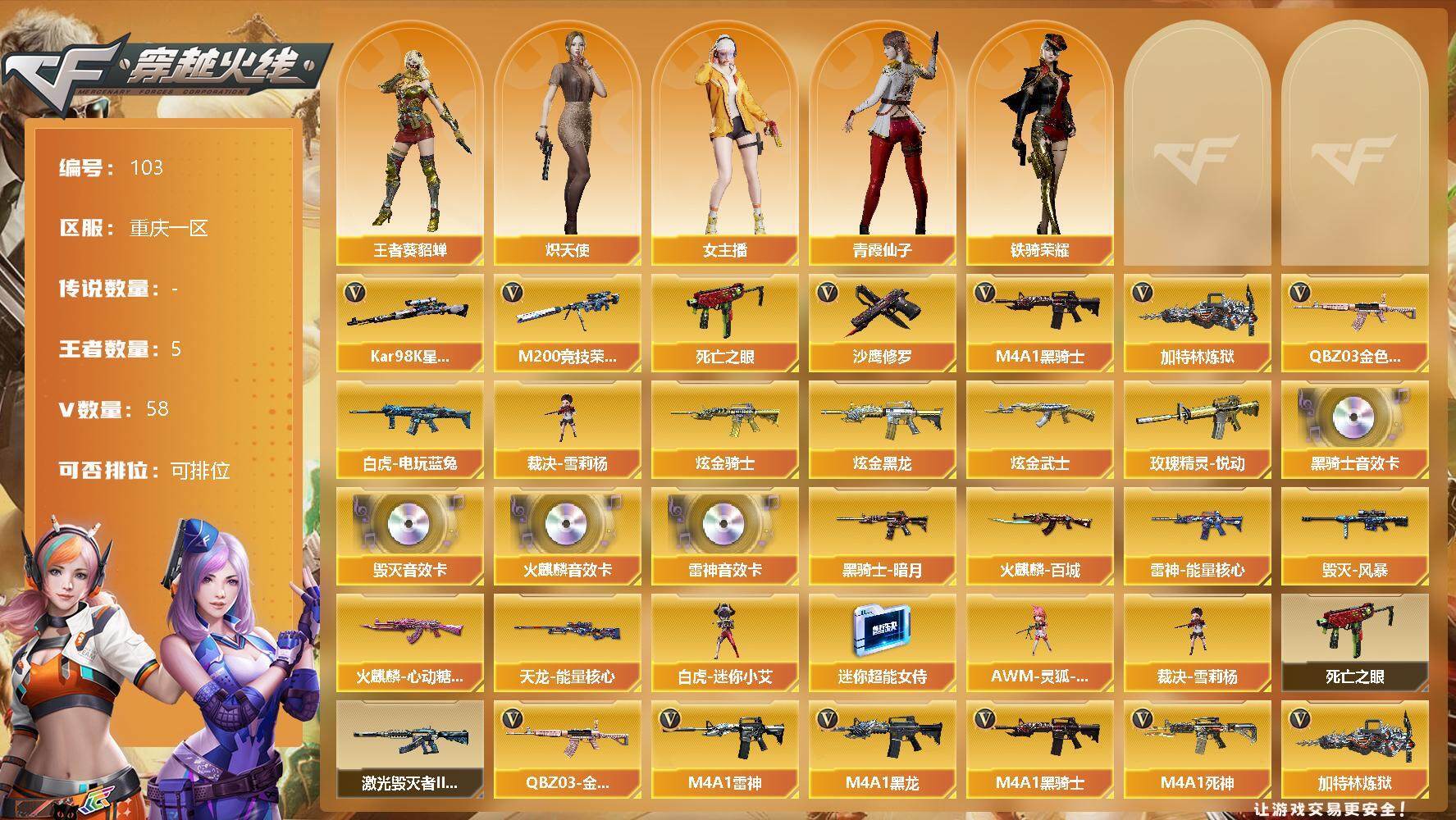 [12835498]【103】58V/102级/荣耀元首/5王者/3炫金/QBZ03-金色蔷薇/M200-竞技荣光/死亡之眼/白虎-电玩蓝兔/Kar98k-星神/M4A1-黑骑士/加特林-炼狱/裁决-雪莉杨/沙鹰-修罗/炫金黑骑士/炫金黑龙/炫金黑武士/玫瑰精灵-悦动/AK47-火麒麟音效卡/M4A1-雷神音效卡/M4A1-黑骑士音效卡/Barrett-毁灭音效卡/雷神-能量核心/火麒麟-百城/火麒麟-心动糖果/黑骑士-暗月/毁灭-风暴/天龙-能量核心/王者-葵-貂蝉/炽天使/女主播/铁骑荣耀/青霞仙子/白虎-迷你小艾/AWM-灵狐-15周年嘉年华/迷你超能女侍/激光毁灭者III-白马银枪/唐刀神工天巧/擎天-竞技荣光/高爆手雷-竞技荣光/烟雾弹-竞技荣光/闪光弹-竞技荣光/无影-神兵利器/M4A1-雷神/M4A1-黑龙/M4A1-死神/AK47-无影/AK47-火麒麟/AK12-天启/AWM-天龙/Barrett-毁灭/Barrett-极光/QBZ03-天罚/AK-47-猩红传说/AK47-B-战神/M4A1-赤狱骑士/屠龙