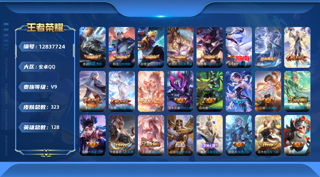 [12837724]安卓Q-V9-永恒钻石I段位-128英雄-323皮肤-5典藏-0珍品无双-0无双-2珍品传说-18传说-81史诗