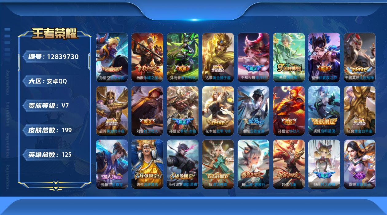 [12839730]安卓Q-V6-尊贵铂金IV段位-125英雄-199皮肤-1典藏-0珍品无双-0无双-0珍品传说-15传说-45史诗 【英雄全皮】:空空儿全皮 【荣耀典藏】:孙悟空全息碎影 【传说皮肤】:桑启鸣野蒿,不知火舞绯月行,虞姬启明星使,孙悟空零号赤焰,刘备时之恋人,张良黄金白羊座,干将莫邪久胜战神,虞姬云霓雀翎,达摩黄金狮子座,花木兰冠军飞将,后羿黄金射手座,杨戬永曜之星,貂蝉仲夏夜之梦,孙尚香末日机甲,孙悟空地狱火 【限定皮肤】:狄仁杰阴阳师,赵云皇家上将,妲己时之彼端,鲁班七号狮舞东方,庄周玄嵩,高渐离死亡摇滚,高渐离玩趣恶龙,阿轲迷踪丽影,周瑜赤莲之焰,元歌无心,夏侯惇朔风刀,曹操天狼征服者,典韦蓝屏警告,马可波罗暗影游猎,狄仁杰魔术师,狄仁杰万华元夜,达摩沙漠行僧,项羽海滩派对,老夫子醍醐杖,程咬金演武夺筹,刘邦夺宝奇兵,韩信飞衡,兰陵王驯魔猎人,兰陵王金庭之子,不知火舞绯月行,孙悟空至尊宝,孙悟空零号赤焰,牛魔御旌,李元芳银河之约,李元芳云中旅人,虞姬启明星使,钟馗神迹守卫,钟馗驱傩正仪,杨玉环寅虎心曲,杨戬永曜之星,女娲朔望之晖,蔡文姬繁星吟游,鬼谷子原初探秘者,鬼谷子五谷丰年,弈星混沌棋,沈梦溪星空之诺,沈梦溪大漠名商,明世隐疑决卦,裴擒虎擒涛扼浪,瑶山海碧波行,盾山御銮,猪八戒西部大镖客,上官婉儿梁祝,桑启海盐诗旅,鬼谷子天穹祈灯 【年限皮肤】:杨玉环寅虎心曲,杨戬永曜之星,韩信飞衡,庄周玄嵩,瑶山海碧波行 【赛季限定】:夏侯惇朔风刀,狄仁杰万华元夜,达摩沙漠行僧,老夫子醍醐杖,程咬金演武夺筹,兰陵王金庭之子,牛魔御旌,李元芳云中旅人,钟馗驱傩正仪,鬼谷子原初探秘者,弈星混沌棋,沈梦溪大漠名商,明世隐疑决卦,裴擒虎擒涛扼浪,盾山御銮,桑启海盐诗旅,鬼谷子天穹祈灯 【战令限定】:鲁班七号狮舞东方,阿轲迷踪丽影,周瑜赤莲之焰,典韦蓝屏警告,马可波罗暗影游猎,刘邦夺宝奇兵,兰陵王驯魔猎人,李元芳银河之约,钟馗神迹守卫,女娲朔望之晖,沈梦溪星空之诺,猪八戒西部大镖客 【史诗皮肤】:鲁班七号电玩小子,露娜紫霞仙子,赵云皇家上将,赵云未来纪元,王昭君偶像歌手,狄仁杰魔术师,宫本武藏鬼剑武藏,孙尚香水果甜心,妲己魅力维加斯,妲己女仆咖啡,吕布圣诞狂欢,李白千年之狐,孙悟空至尊宝,夏侯惇乘风破浪,小乔缤纷独角兽,兰陵王暗隐猎兽者,诸葛亮黄金分割率,安琪拉心灵骇客,百里守约