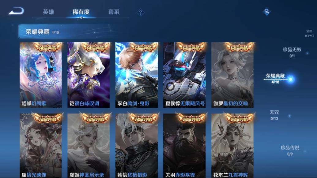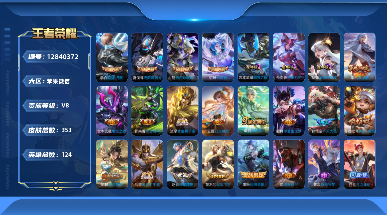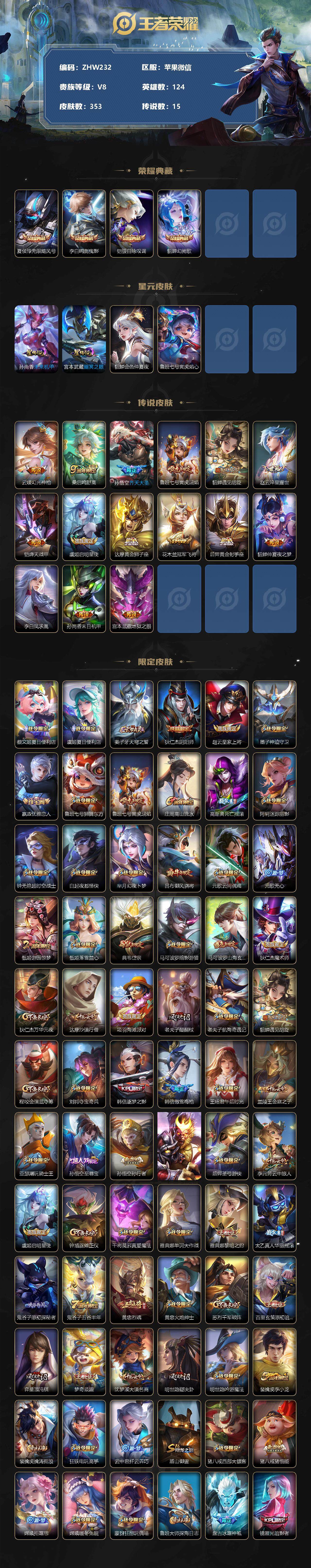 [12840372]苹果WX-V8-最强王者段位-124英雄-353皮肤-4典藏-0珍品无双-0无双-0珍品传说-15传说-98史诗
