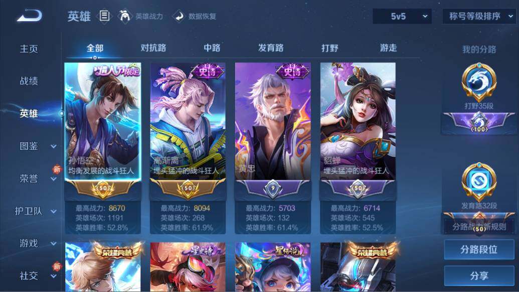 - [11519093]V6 1传说 116英雄 135皮肤 可修改实名 优质装备:淬星耀世 限定皮:至尊宝,飞衡(韩信年限),遇见飞天,梁祝,天狼溯光者,天狼绘梦者,李小龙,逐梦之影,如梦令-后羿,乒乒小将 史诗皮:黄金分割率,特工魅影,千年之狐,暗夜猫娘,魅语,冰冠公主,修罗,水果甜心,功夫厨神,暗隐猎兽者,繁星吟游(呼啦呼啦),水晶猎龙者,曙光守护者,原初追逐者,鹰眼统帅,未来纪元-赵云