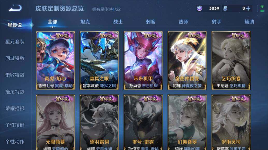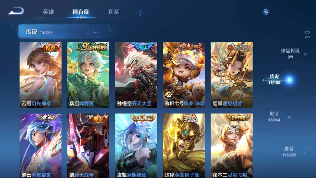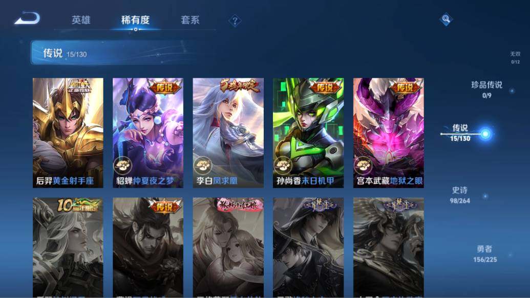 【传说皮肤】:云缨幻光神枪,桑启鸣野蒿,孙悟空齐天大圣,鲁班七号寅虎瑞焰,貂蝉遇见胡旋,赵云淬星耀世,铠绛天战甲,虞姬启明星使,达摩黄金狮子座,花木兰冠军飞将,后羿黄金射手座,貂蝉仲夏夜之梦,李白凤求凰,孙尚香末日机甲,宫本武藏地狱之眼