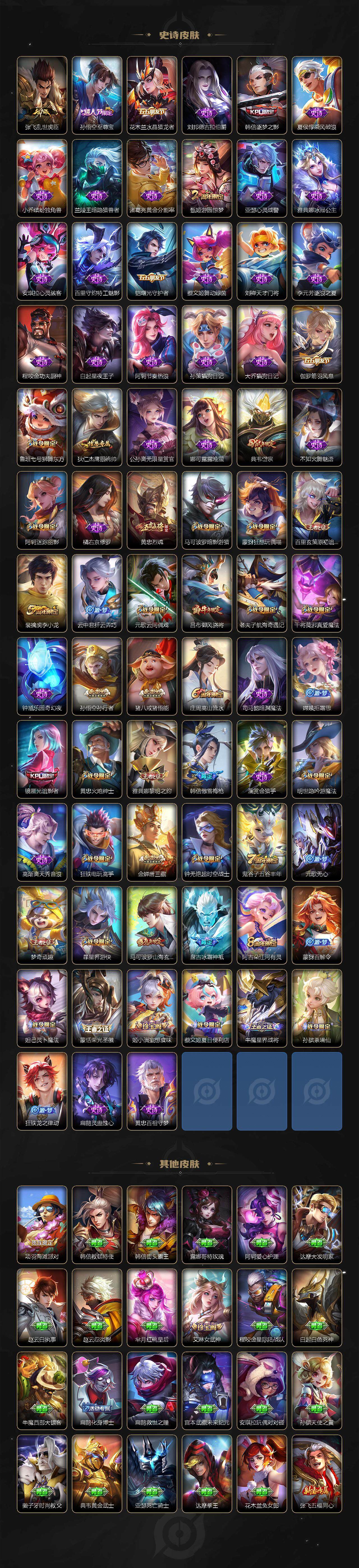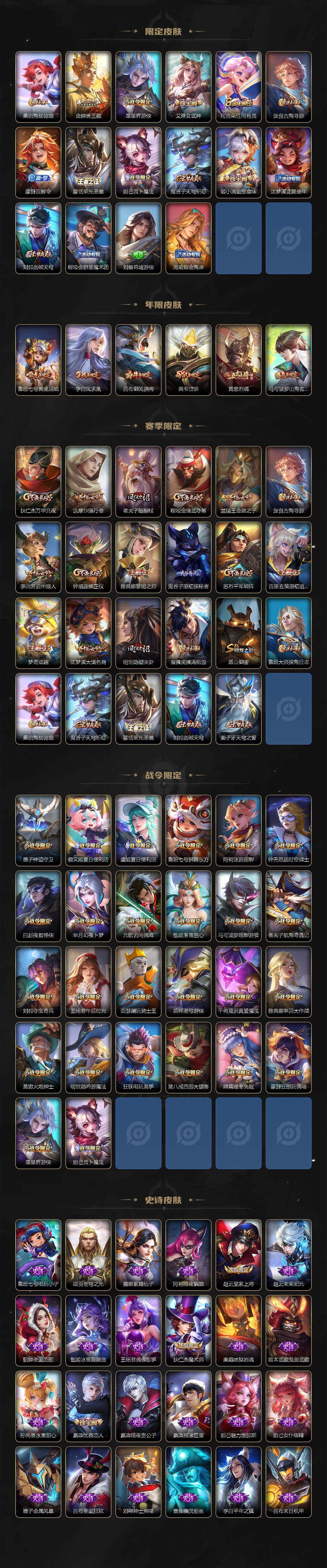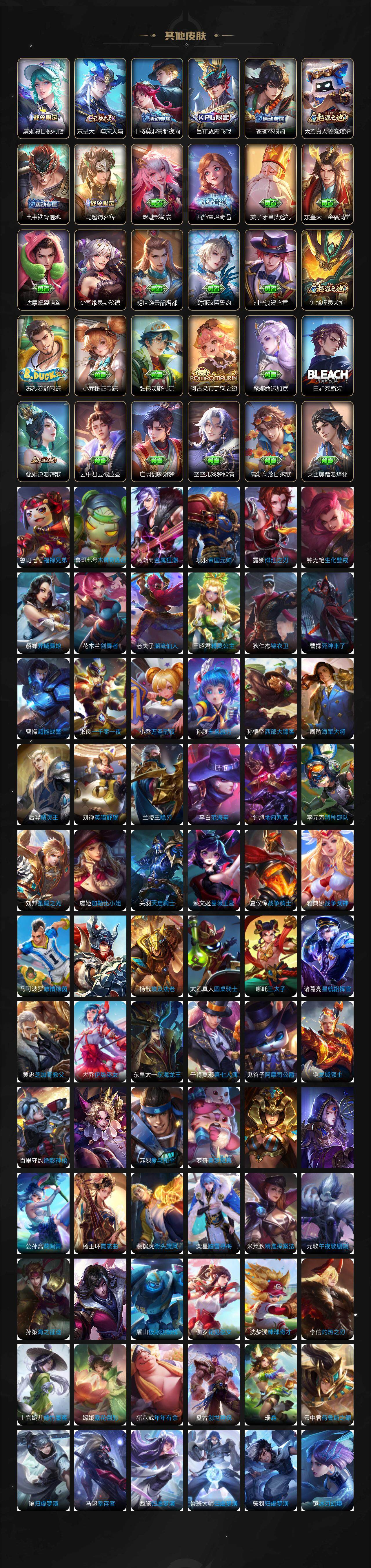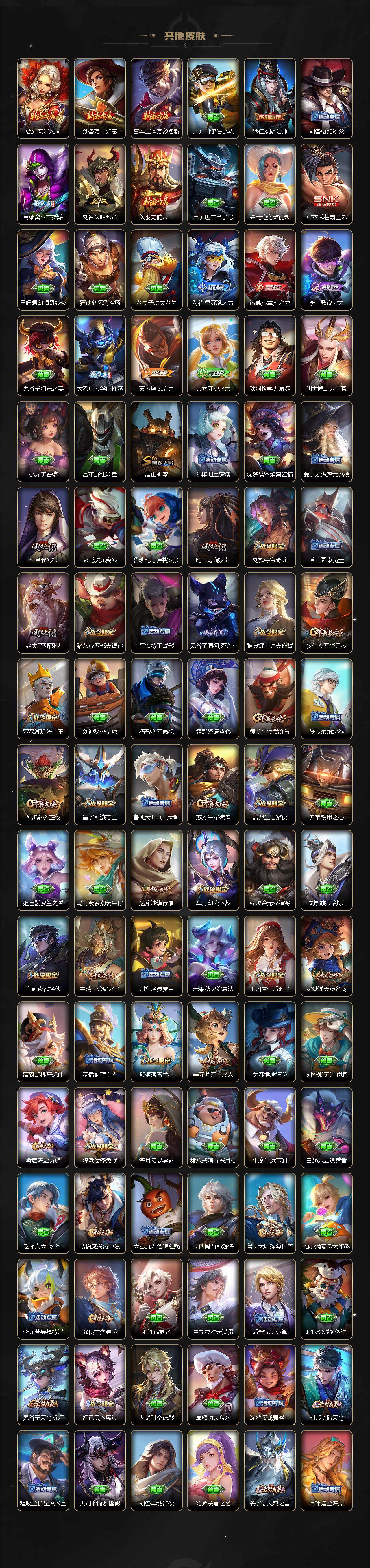 【限定皮肤】:蔡文姬夏日便利店,虞姬夏日便利店,姜子牙天穹之誓,狄仁杰阴阳师,赵云皇家上将,墨子神迹守卫,嬴政优雅恋人,鲁班七号狮舞东方,鲁班七号寅虎瑞焰,庄周高山流水,高渐离死亡摇滚,阿轲迷踪丽影,钟无艳超时空战士,白起夜都怪侠,芈月幻夜卜梦,吕布御风骁将,元歌云间偶戏,元歌无心,甄姬游园惊梦,甄姬落雪兰心,典韦岱宗,马可波罗暗影游猎,马可波罗山海玄木吟,狄仁杰魔术师,狄仁杰万华元夜,达摩沙漠行僧,项羽海滩派对,老夫子醍醐杖,老夫子航海奇遇记,貂蝉遇见胡旋,程咬金演武夺筹,刘邦夺宝奇兵,韩信逐梦之影,韩信傲雪梅枪,王昭君午后时光,兰陵王金庭之子,亚瑟潮玩骑士王,孙悟空至尊宝,孙悟空孙行者,孙悟空齐天大圣,后羿圣弓游侠,李元芳云中旅人,虞姬启明星使,钟馗驱傩正仪,干将莫邪真爱魔法,雅典娜单词大作战,雅典娜黎明之约,太乙真人华丽摇滚,鬼谷子原初探秘者,鬼谷子五谷丰年,黄忠烈魂,黄忠火炮绅士,苏烈千军破阵,百里玄策原初追逐者,弈星混沌棋,梦奇顽趣,沈梦溪大漠名商,明世隐疑决卦,明世隐吟游魔法,裴擒虎李小龙,裴擒虎擒涛扼浪,狂铁电玩高手,云中君纤云弄巧,盾山御銮,猪八戒西部大镖客,猪八戒猪悟能,嫦娥拒霜思,嫦娥暖冬兔眠,蒙犽狂想玩偶喵,鲁班大师探海日志,盘古冰霜神祇,镜匿光追影者,桑启海盐诗旅,金蝉唐三藏,暃星界游侠,艾琳女武神,阿古朵江河有灵,张良古海寻踪,蒙犽百解令,蒙恬荣光圣徽,妲己灵卜魔法,鬼谷子天穹祈灯,姬小满妄想食味,沈梦溪龙舞盛年,刘邦剑破天穹,程咬金群星魔术团,刘备异域游侠,周瑜熔金海岸