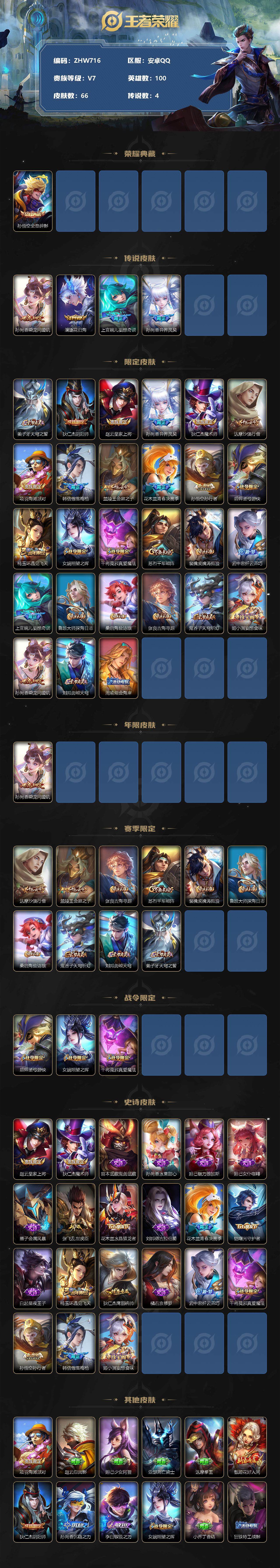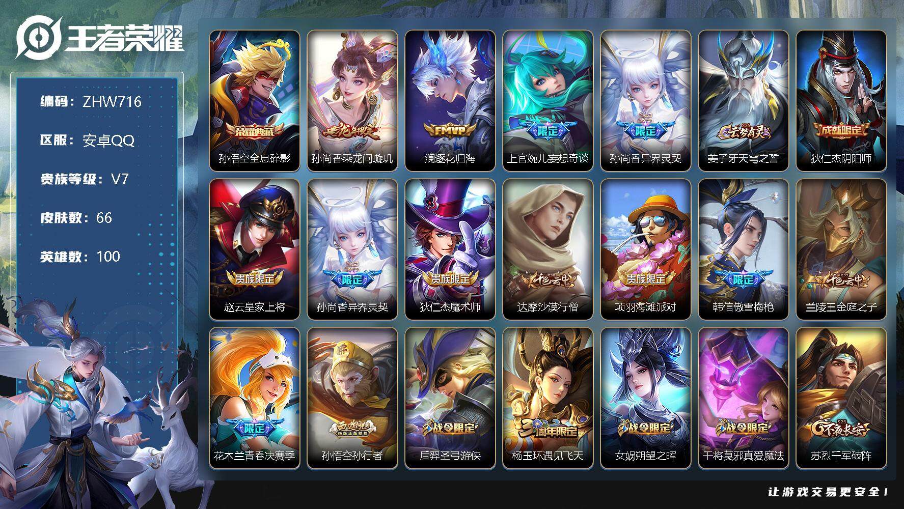 [12841918]【特价急出/详情看图】安卓Q-V7-永恒钻石I段位-100英雄-66皮肤-1典藏-4传说-21史诗 【荣耀典藏】:孙悟空全息碎影 【传说皮肤】:孙尚香乘龙问璇玑,澜逐花归海,上官婉儿妄想奇谈,孙尚香异界灵契 【限定皮肤】:姜子牙天穹之誓,狄仁杰阴阳师,赵云皇家上将,孙尚香异界灵契,狄仁杰魔术师,达摩沙漠行僧,项羽海滩派对,韩信傲雪梅枪,兰陵王金庭之子,花木兰青春决赛季,孙悟空孙行者,后羿圣弓游侠,杨玉环遇见飞天,女娲朔望之晖,干将莫邪真爱魔法,苏烈千军破阵,裴擒虎擒涛扼浪,云中君纤云弄巧,上官婉儿妄想奇谈,鲁班大师探海日志,桑启海盐诗旅,张良古海寻踪,鬼谷子天穹祈灯,姬小满妄想食味,孙尚香乘龙问璇玑,刘邦剑破天穹,周瑜熔金海岸 【年限皮肤】:孙尚香乘龙问璇玑 【赛季限定】:达摩沙漠行僧,兰陵王金庭之子,张良古海寻踪,苏烈千军破阵,裴擒虎擒涛扼浪,鲁班大师探海日志,桑启海盐诗旅,鬼谷子天穹祈灯,刘邦剑破天穹,姜子牙天穹之誓 【战令限定】:后羿圣弓游侠,女娲朔望之晖,干将莫邪真爱魔法 【史诗皮肤】:赵云皇家上将,狄仁杰魔术师,宫本武藏鬼剑武藏,孙尚香水果甜心,妲己魅力维加斯,妲己女仆咖啡,墨子金属风暴,张飞乱世虎臣,花木兰水晶猎龙者,刘邦德古拉伯爵,花木兰青春决赛季,铠曙光守护者,白起星夜王子,杨玉环遇见飞天,狄仁杰鹰眼统帅,橘右京修罗,云中君纤云弄巧,干将莫邪真爱魔法,孙悟空孙行者,韩信傲雪梅枪,姬小满妄想食味 【其他皮肤】:项羽海滩派对,赵云忍炎影,妲己少女阿狸,亚瑟死亡骑士,达摩拳王,甄姬花好人间,狄仁杰阴阳师,孙尚香沉稳之力,李白敏锐之力,女娲朔望之晖,小乔丁香结,狂铁特工战影,苏烈千军破阵,后羿圣弓游侠,达摩沙漠行僧,程咬金无双福将,兰陵王金庭之子,桑启海盐诗旅,裴擒虎擒涛扼浪,鲁班大师探海日志,张良古海寻踪,鬼谷子天穹祈灯,刘邦剑破天穹,姜子牙天穹之誓,周瑜熔金海岸,鲁班七号福禄兄弟,鲁班七号木偶奇遇记,老夫子潮流仙人,小乔万圣前夜,孙悟空西部大镖客,夏侯惇战争骑士,百里守约绝影神枪,女娲尼罗河女神,裴擒虎街头旋风,盾山极冰防御线,曜归虚梦演,镜冰刃幻境,司空震启蛰,云缨赤焰之缨,金蝉前尘 【内测皮肤】:狂铁特工战影 【营地ID】:1790594430