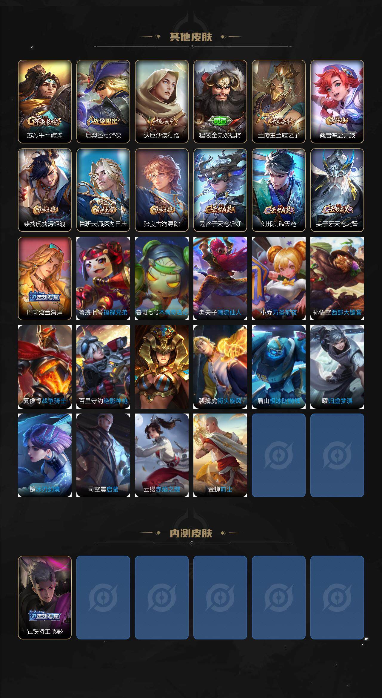 【赛季限定】:达摩沙漠行僧,兰陵王金庭之子,张良古海寻踪,苏烈千军破阵,裴擒虎擒涛扼浪,鲁班大师探海日志,桑启海盐诗旅,鬼谷子天穹祈灯,刘邦剑破天穹,姜子牙天穹之誓