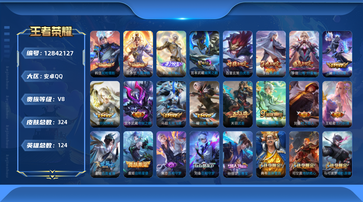 [12842127]【特价急出/详情看图】:安卓Q-V8-至尊星耀I段位-124英雄-324皮肤-2典藏-1星元-1无双-14传说-77史诗