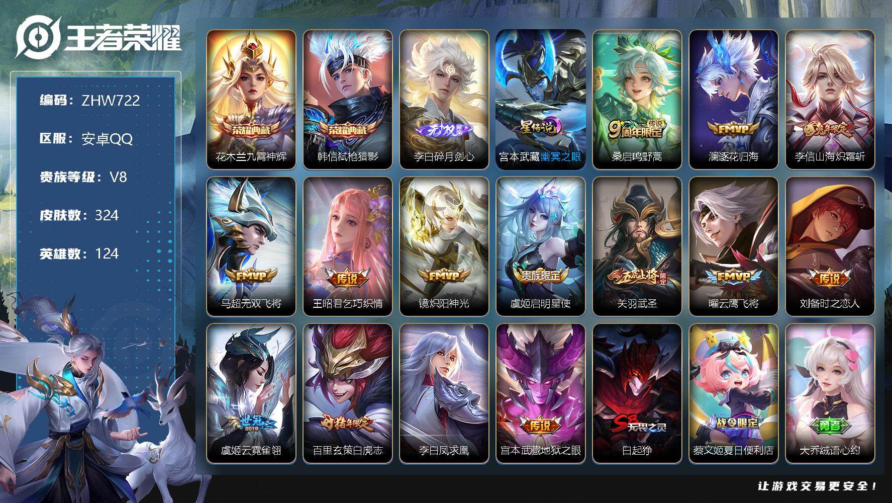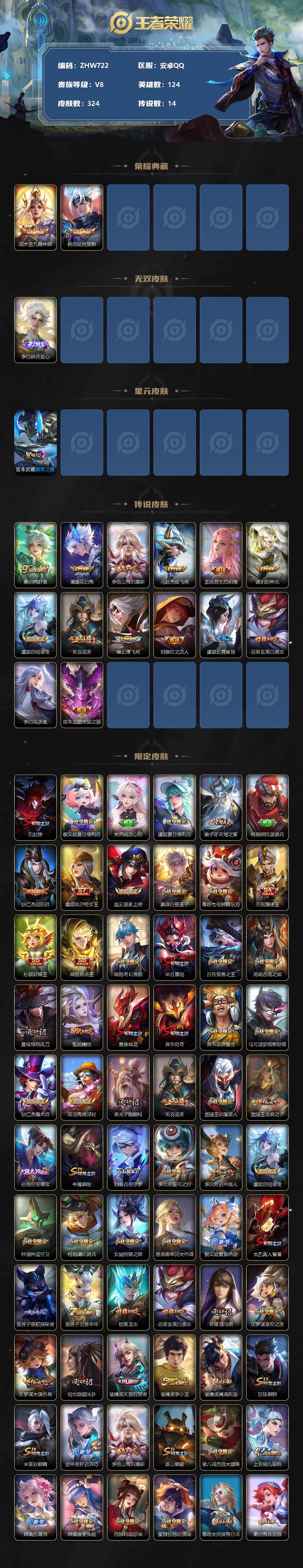 [12842127]【特价急出/详情看图】:安卓Q-V8-至尊星耀I段位-124英雄-324皮肤-2典藏-1星元-1无双-14传说-77史诗 【英雄全皮】:影全皮 【荣耀典藏】:花木兰九霄神辉,韩信弑枪猎影 【无双皮肤】:李白碎月剑心 【传说皮肤】:桑启鸣野蒿,澜逐花归海,李信山海炽霜斩,马超无双飞将,王昭君乞巧织情,镜炽阳神光,虞姬启明星使,关羽武圣,曜云鹰飞将,刘备时之恋人,虞姬云霓雀翎,百里玄策白虎志,李白凤求凰,宫本武藏地狱之眼 【限定皮肤】:白起狰,蔡文姬夏日便利店,大乔绒语心约,虞姬夏日便利店,姜子牙天穹之誓,杨戬破阵退雄兵,狄仁杰阴阳师,虞姬凯尔特女王,赵云皇家上将,嬴政白昼王子,鲁班七号狮舞东方,庄周蜃楼王,孙膑妖精王,扁鹊炼金王,扁鹊奇幻香踪,芈月重明,吕布猎兽之王,周瑜赤莲之焰,夏侯惇朔风刀,甄姬幽恒,曹操烛龙,典韦穷奇,典韦蓝屏警告,马可波罗暗影游猎,狄仁杰魔术师,项羽海滩派对,老夫子醍醐杖,关羽武圣,兰陵王驯魔猎人,兰陵王金庭之子,孙悟空至尊宝,牛魔御旌,刘备百相守梦,李元芳银河之约,李元芳云中旅人,虞姬启明星使,钟馗神迹守卫,杨戬潮玩骑兵,女娲朔望之晖,雅典娜单词大作战,蔡文姬繁星吟游,太乙真人饕餮,鬼谷子原初探秘者,鬼谷子五谷丰年,铠青龙志,百里玄策白虎志,弈星混沌棋,沈梦溪星空之诺,沈梦溪大漠名商,明世隐疑决卦,裴擒虎天狼狩猎者,裴擒虎李小龙,裴擒虎擒涛扼浪,狂铁御狮,米莱狄御霄,云中君纤云弄巧,李信山海炽霜斩,盾山御銮,猪八戒西部大镖客,上官婉儿梁祝,嫦娥拒霜思,嫦娥暖冬兔眠,西施玲珑珍味,蒙犽狂想玩偶喵,鲁班大师探海日志,桑启海盐诗旅,暃星界游侠,戈娅驭风魔法,艾琳女武神,艾琳流音漫舞,司空震地狱燃心,阿古朵江河有灵,张良古海寻踪,蒙犽百解令,高渐离燃音魔法,妲己灵卜魔法,鬼谷子天穹祈灯,李白碎月剑心,伽罗琥珀纪元,姬小满妄想食味,沈梦溪龙舞盛年,刘邦剑破天穹,程咬金群星魔术团,镜青焰无极,项羽苍威无极,周瑜熔金海岸 【年限皮肤】:百里玄策白虎志,铠青龙志,李白凤求凰,甄姬幽恒,关羽武圣,李信山海炽霜斩 【赛季限定】:庄周蜃楼王,孙膑妖精王,扁鹊炼金王,白起狰,芈月重明,夏侯惇朔风刀,曹操烛龙,典韦穷奇,老夫子醍醐杖,兰陵王金庭之子,张良古海寻踪,牛魔御旌,李元芳云中旅人,虞姬凯尔特女王,太乙真人饕餮,鬼谷子原初探秘者,弈星混沌棋,沈梦溪大漠名商,明