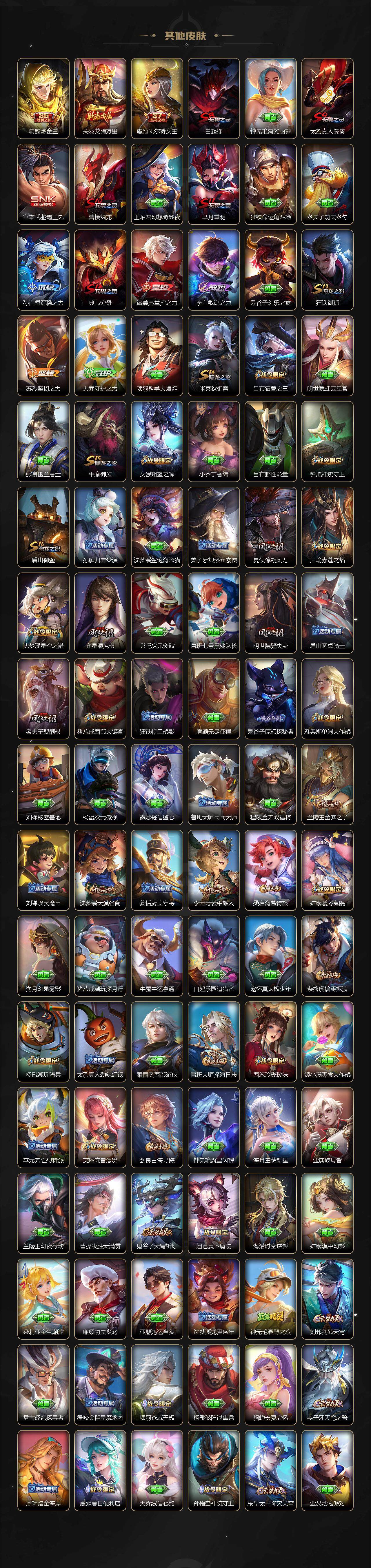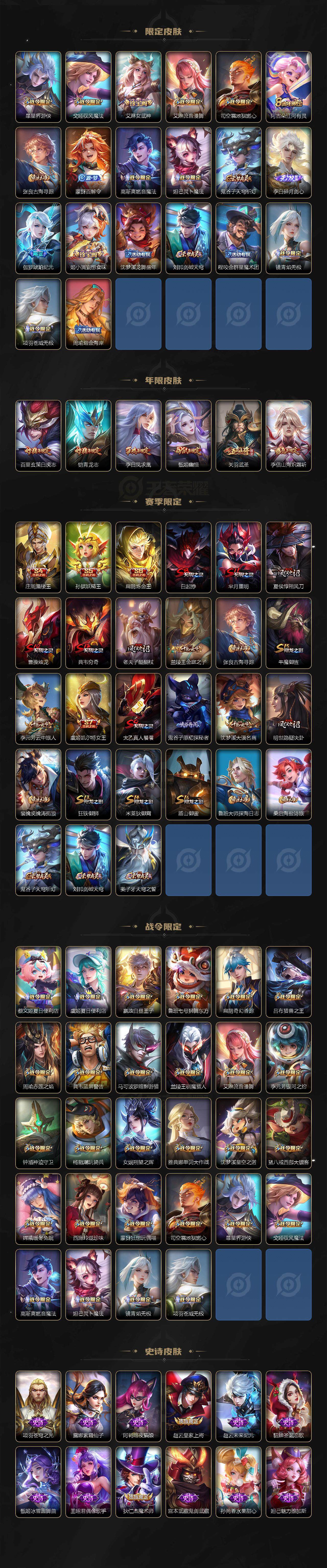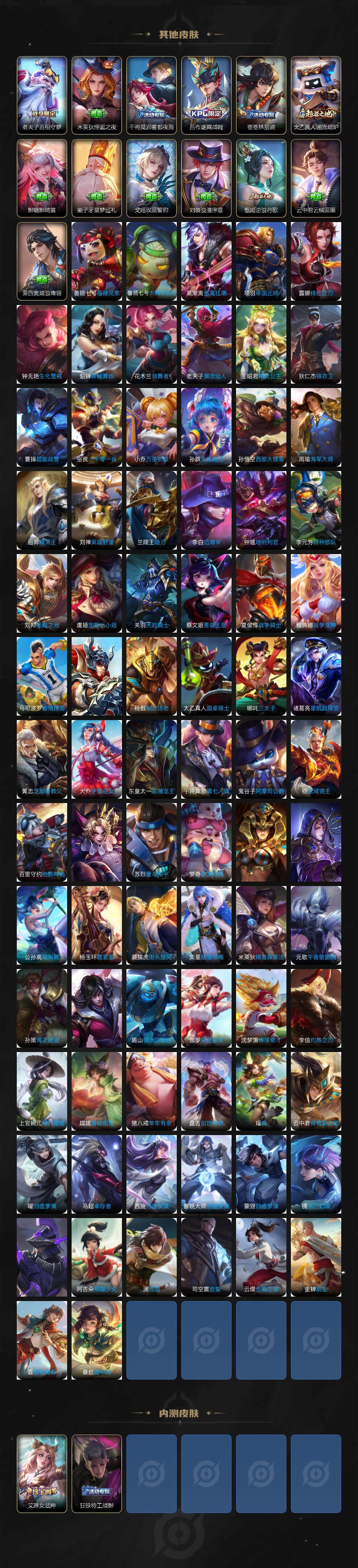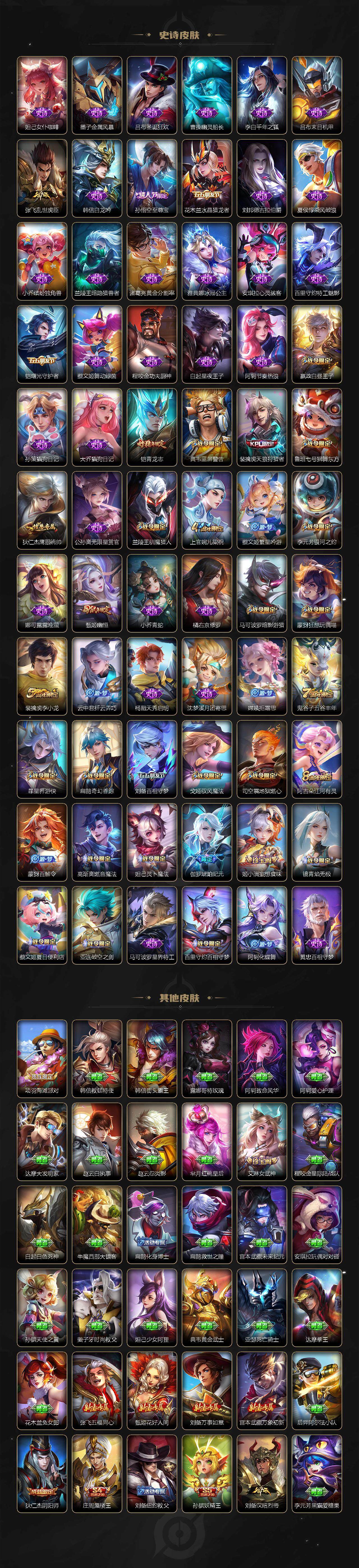 【限定皮肤】:白起狰,蔡文姬夏日便利店,大乔绒语心约,虞姬夏日便利店,姜子牙天穹之誓,杨戬破阵退雄兵,狄仁杰阴阳师,虞姬凯尔特女王,赵云皇家上将,嬴政白昼王子,鲁班七号狮舞东方,庄周蜃楼王,孙膑妖精王,扁鹊炼金王,扁鹊奇幻香踪,芈月重明,吕布猎兽之王,周瑜赤莲之焰,夏侯惇朔风刀,甄姬幽恒,曹操烛龙,典韦穷奇,典韦蓝屏警告,马可波罗暗影游猎,狄仁杰魔术师,项羽海滩派对,老夫子醍醐杖,关羽武圣,兰陵王驯魔猎人,兰陵王金庭之子,孙悟空至尊宝,牛魔御旌,刘备百相守梦,李元芳银河之约,李元芳云中旅人,虞姬启明星使,钟馗神迹守卫,杨戬潮玩骑兵,女娲朔望之晖,雅典娜单词大作战,蔡文姬繁星吟游,太乙真人饕餮,鬼谷子原初探秘者,鬼谷子五谷丰年,铠青龙志,百里玄策白虎志,弈星混沌棋,沈梦溪星空之诺,沈梦溪大漠名商,明世隐疑决卦,裴擒虎天狼狩猎者,裴擒虎李小龙,裴擒虎擒涛扼浪,狂铁御狮,米莱狄御霄,云中君纤云弄巧,李信山海炽霜斩,盾山御銮,猪八戒西部大镖客,上官婉儿梁祝,嫦娥拒霜思,嫦娥暖冬兔眠,西施玲珑珍味,蒙犽狂想玩偶喵,鲁班大师探海日志,桑启海盐诗旅,暃星界游侠,戈娅驭风魔法,艾琳女武神,艾琳流音漫舞,司空震地狱燃心,阿古朵江河有灵,张良古海寻踪,蒙犽百解令,高渐离燃音魔法,妲己灵卜魔法,鬼谷子天穹祈灯,李白碎月剑心,伽罗琥珀纪元,姬小满妄想食味,沈梦溪龙舞盛年,刘邦剑破天穹,程咬金群星魔术团,镜青焰无极,项羽苍威无极,周瑜熔金海岸