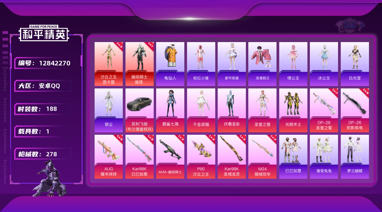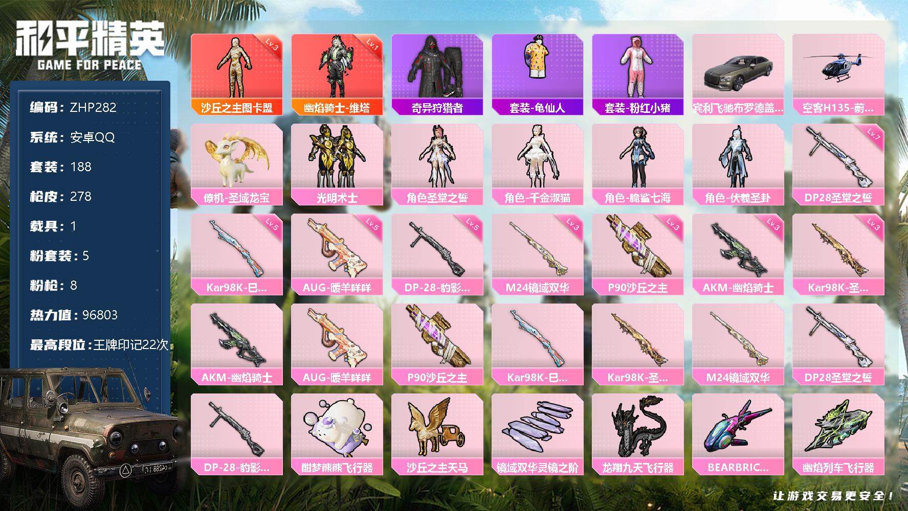 [12842270]1级维塔2级图卡盟!安卓 手Q-2神装-5粉装-8特效枪-1载具-10粉色飞行器-96803热力值-22王牌印记-188套装-278枪皮