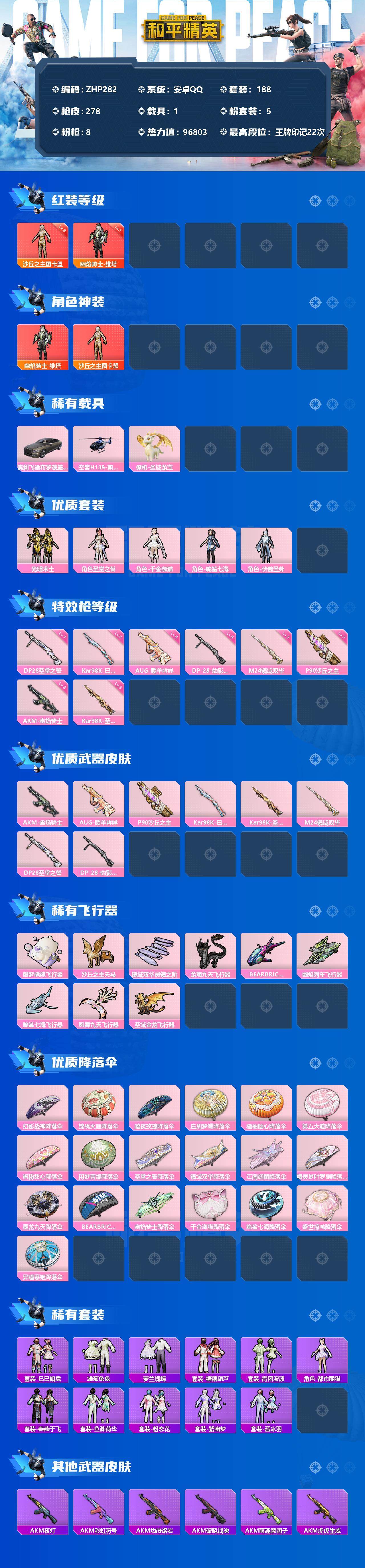 - [12347768]【商品标题】:安卓 手Q-5粉装-4特效枪-4载具-1粉色飞行器-67839热力值-3王牌印记-129套装-211枪皮 【热门品类】:粉装-梦幻火箭,套装-奇异狩猎者,角色-军刀雅典娜,撬棍-龙胆亮银枪 【粉色载具】:路特斯EVIJA(星际黄),永恒黄蜂,萌喵橘座,杜卡迪 Panigale V4(星耀白) 【粉色套装】:粉装-蝶舞迷情,粉装-梦幻火箭,角色-复仇流浪者,角色-宙之时溯,粉装-莲影清波 【粉色枪皮等级】:M416-五爪金龙(七级),M762-鬼刀(二级),Kar98K-巳巳如意(五级),SLR-暗夜玫瑰(七级) 【粉色枪皮】:M416-五爪金龙,M762-鬼刀,Kar98K-巳巳如意,SLR-暗夜玫瑰 【粉色飞行器】:锦绣火鲤飞行器 【粉色降落伞】:梦幻火箭降落伞,炫紫旋律降落伞,心之恋语降落伞,阿狸红降落伞,怪笑疯兔降落伞,机甲封神降落伞,洛神天依降落伞,百合蜜语降落伞,筑梦精灵降落伞,环太平洋降落伞,暖熊萌萌降落伞,第五大道降落伞,龙珠超降落伞,未来歌姬降落伞,拂晓神骑降落伞,闲梦青缨降落伞,镜光幻境降落伞,圣堂之誓降落伞,精灵梦叶罗丽降落伞,鬼刀降落伞 【稀有套装】:套装-巳巳如意,套装-燕燕于飞,套装-鱼渊荷华,套装-晶辉守护 【稀有枪皮】:AKM-冰凉西瓜,AKM-四圣焕新,AKM-夜灯,AKM-彩虹符号,AKM-恐龙拽拽,AKM-灼热熔岩,AKM-生命誓言,AKM-百万伏特,AKM-破晓战魂,AKM-萌趣颜团子,AKM-虎虎生威,AKM-霓虹街区,AKM-龙的传人,M16A4-夜灯,M16A4-天使羽翼,M16A4-幻世战舞者,M16A4-甜心亚梦,M16A4-红色方程式,M16A4-蓝色火焰,SCAR-L-炫彩节奏,SCAR-L-玉兔迎春,SCAR-L-王牌四分卫,SCAR-L-红色方程式,SCAR-L-雷霆特警,SCAR-L-黄金龙骨,M416-圣诞惊喜,M416-糯团青竹,M416-红色方程式,M416-蓝色火焰,GROZA-异彩先驱,GROZA-彩虹符号,GROZA-生命誓言,GROZA-晶梦幻蝶,AUG-幻影战神,AUG-耀粉歌者,QBZ-原初圣火,QBZ-彩虹符号,QBZ-未来歌姬,QBZ-洛神天依,QBZ-飞驰魅影,M762-奇异狩猎者,M762-彩虹甜喵,M762-彩虹符号,M762-暖熊萌萌,M762-牛气冲天,M762