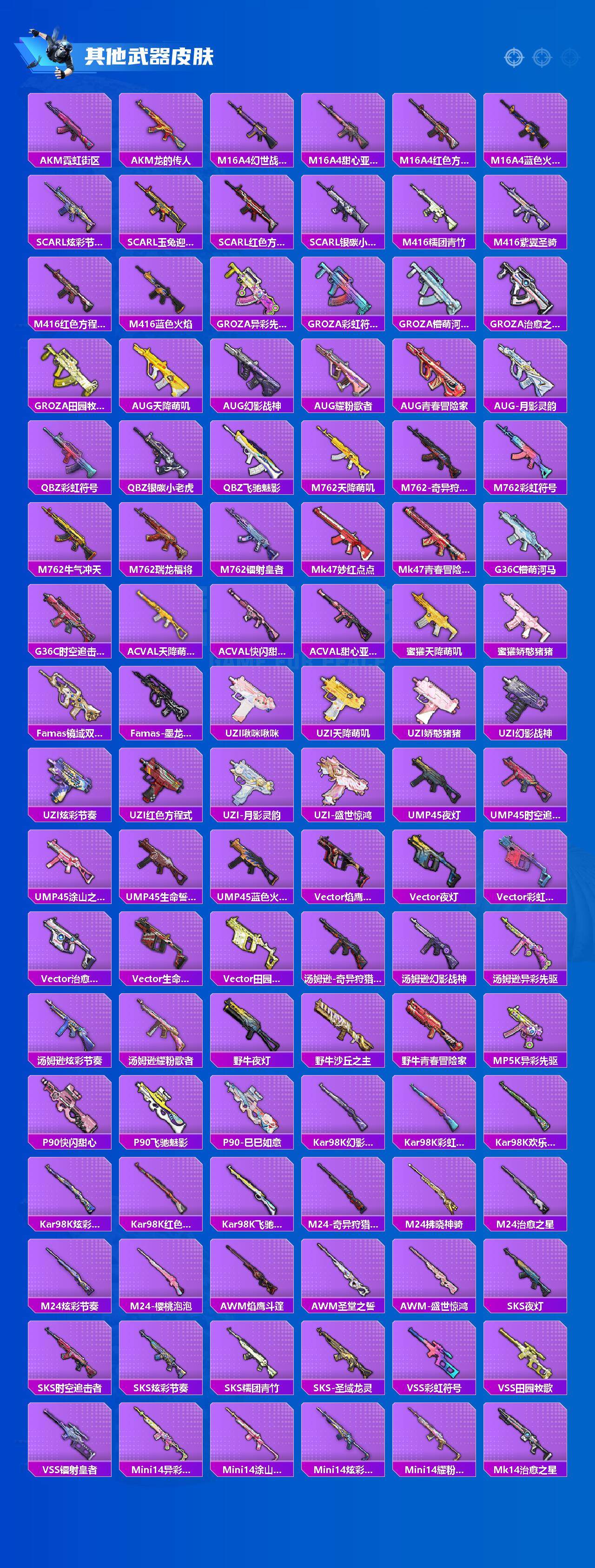 【稀有枪皮】:AKM-夜灯,AKM-彩虹符号,AKM-灼热熔岩,AKM-破晓战魂,AKM-萌趣颜团子,AKM-虎虎生威,AKM-霓虹街区,AKM-龙的传人,M16A4-幻世战舞者,M16A4-甜心亚梦,M16A4-红色方程式,M16A4-蓝色火焰,SCAR-L-炫彩节奏,SCAR-L-玉兔迎春,SCAR-L-红色方程式,SCAR-L-银碳小老虎,M416-糯团青竹,M41