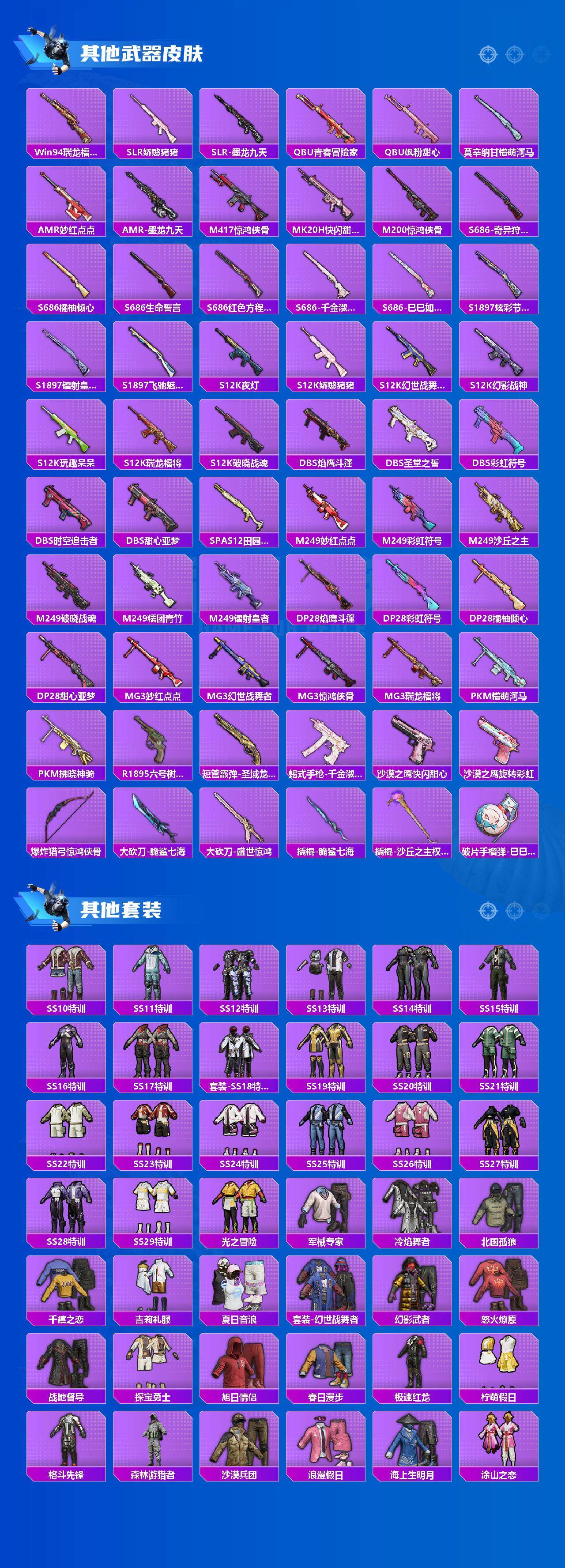 [12842270]1级维塔2级图卡盟!安卓 手Q-2神装-5粉装-8特效枪-1载具-10粉色飞行器-96803热力值-22王牌印记-188套装-278枪皮 【红色神装等级】:幽焰骑士-维塔(一级),沙丘之主-图卡盟(三级) 【红色角色神装】:幽焰骑士-维塔,沙丘之主-图卡盟 【热门品类】:套装-奇异狩猎者,套装-龟仙人,套装-粉红小猪 【粉色载具】:宾利飞驰(布罗德盖棕双色),空客H135-蔚蓝之翼,僚机-圣域龙宝 【粉色套装】:粉装-光明术士,角色-圣堂之誓,角色-千金淑猫,角色-脆鲨七海,角色-伏羲圣卦 【粉色枪皮等级】:AKM-幽焰骑士(三级),AUG-暖羊咩咩(五级),P90-沙丘之主(三级),Kar98K-巳巳如意(五级),Kar98K-圣域龙灵(三级),M24-镜域双华(三级),DP-28-圣堂之誓(七级),DP-28-豹影疾电(五级) 【粉色枪皮】:AKM-幽焰骑士,AUG-暖羊咩咩,P90-沙丘之主,Kar98K-巳巳如意,Kar98K-圣域龙灵,M24-镜域双华,DP-28-圣堂之誓,DP-28-豹影疾电 【粉色飞行器】:酣梦熊熊飞行器,沙丘之主天马,镜域双华-灵镜之阶,龙翔九天飞行器,BEARBRICK飞行器,幽焰列车飞行器,脆鲨七海飞行器,凤舞九天飞行器,圣域金龙飞行器 【粉色降落伞】:幻影战神降落伞,锦绣火鲤降落伞,暗夜玫瑰降落伞,庄周梦蝶降落伞,橘柚倾心降落伞,第五大道降落伞,飒粉甜心降落伞,闲梦青缨降落伞,圣堂之誓降落伞,镜域双华降落伞,江南烟雨降落伞,精灵梦叶罗丽降落伞,墨龙九天降落伞,BEARBRICK降落伞,幽焰骑士降落伞,千金淑猫降落伞,脆鲨七海降落伞,盛世惊鸿降落伞,异瞳寒姬降落伞 【稀有套装】:套装-龟仙人,套装-巳巳如意,套装-雏菊兔兔,套装-萝兰蝴蝶,套装-糖糖葫芦,套装-青团波波,角色-都市丽猫,套装-燕燕于飞,套装-鱼渊荷华,套装-粉恋花,套装-紫幽梦,套装-蓝冰羽 【稀有枪皮】:AKM-夜灯,AKM-彩虹符号,AKM-灼热熔岩,AKM-破晓战魂,AKM-萌趣颜团子,AKM-虎虎生威,AKM-霓虹街区,AKM-龙的传人,M16A4-幻世战舞者,M16A4-甜心亚梦,M16A4-红色方程式,M16A4-蓝色火焰,SCAR-L-炫彩节奏,SCAR-L-玉兔迎春,SCAR-L-红色方程式,SCAR-L-银碳小老虎,M416-糯团青竹,M41