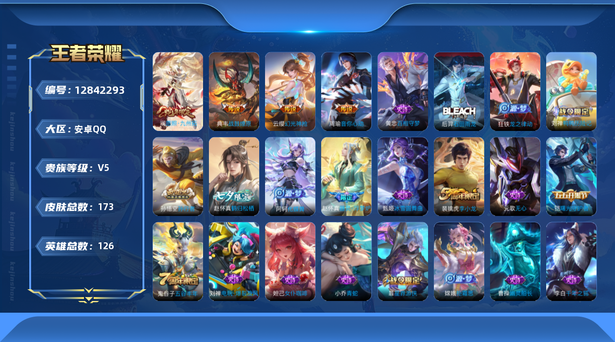 [12842293]【特价急出/详情看图】:安卓Q-V5-永恒钻石II段位-125英雄-173皮肤-4传说-41史诗