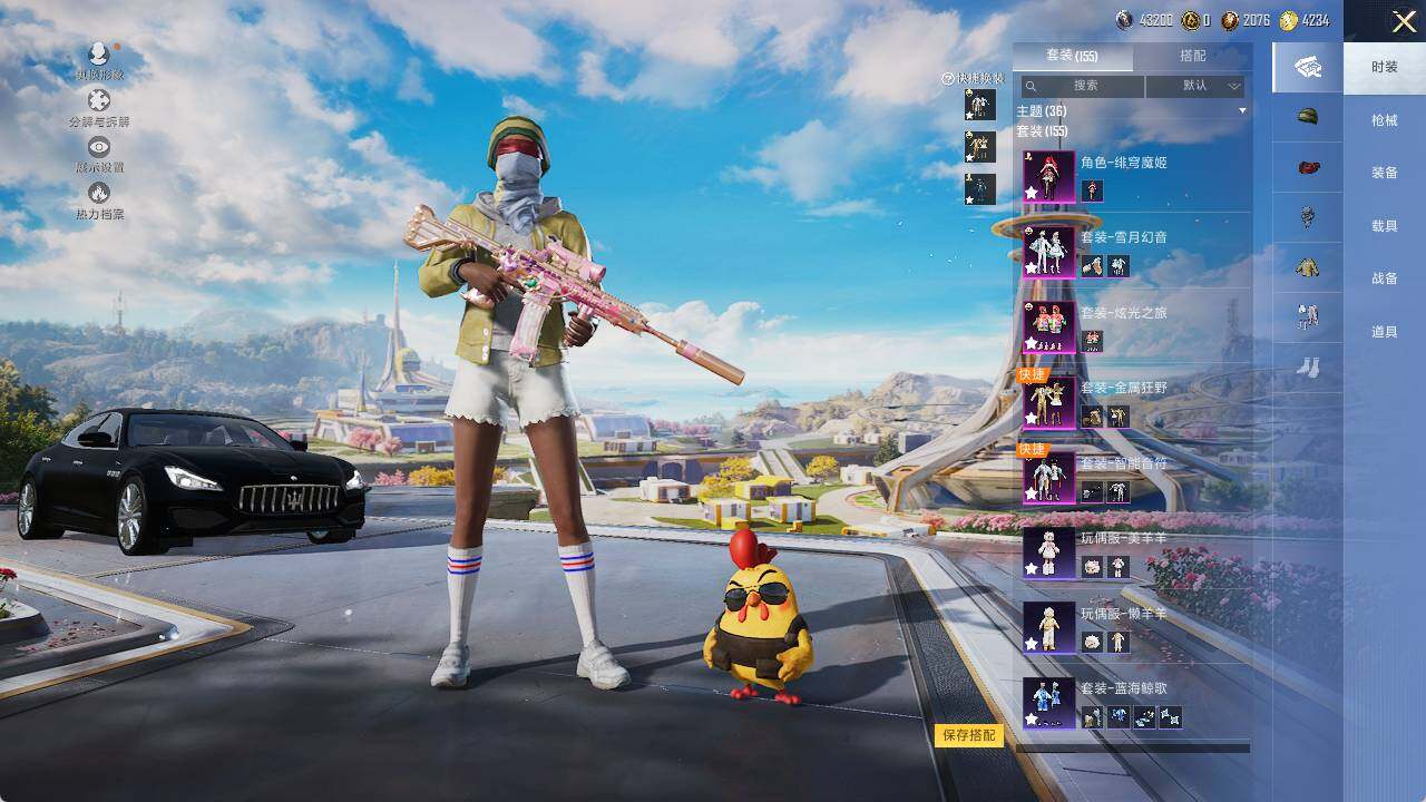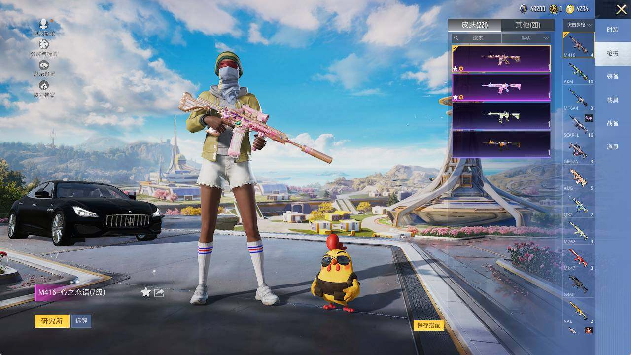 AKM-绿萝繁花,M416-心之恋语,M416-电玩时刻,GROZA-镜光银凌,AUG-暖羊咩咩,UMP45-量子极限,Kar98K-巳巳如意,M200-伏羲圣卦